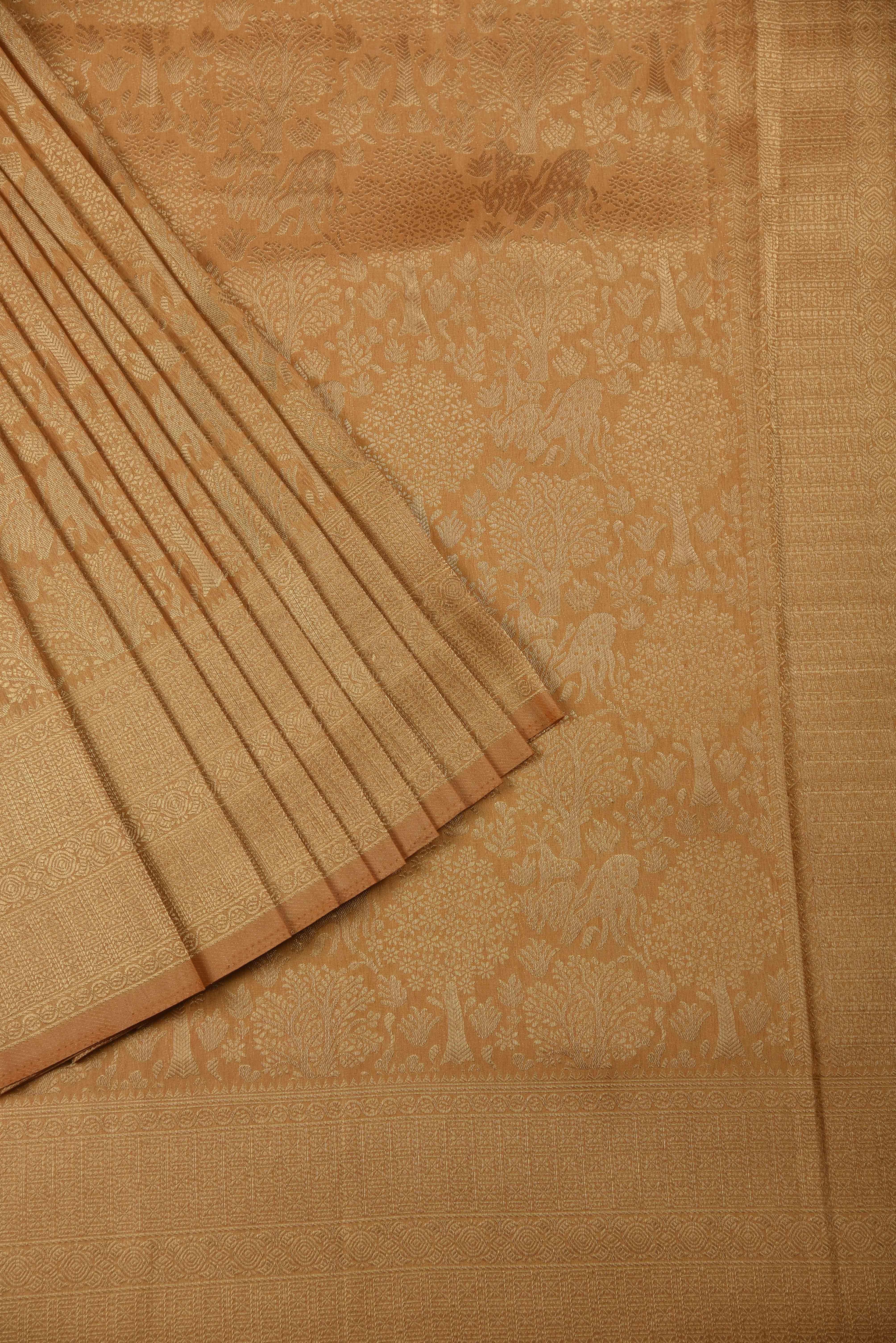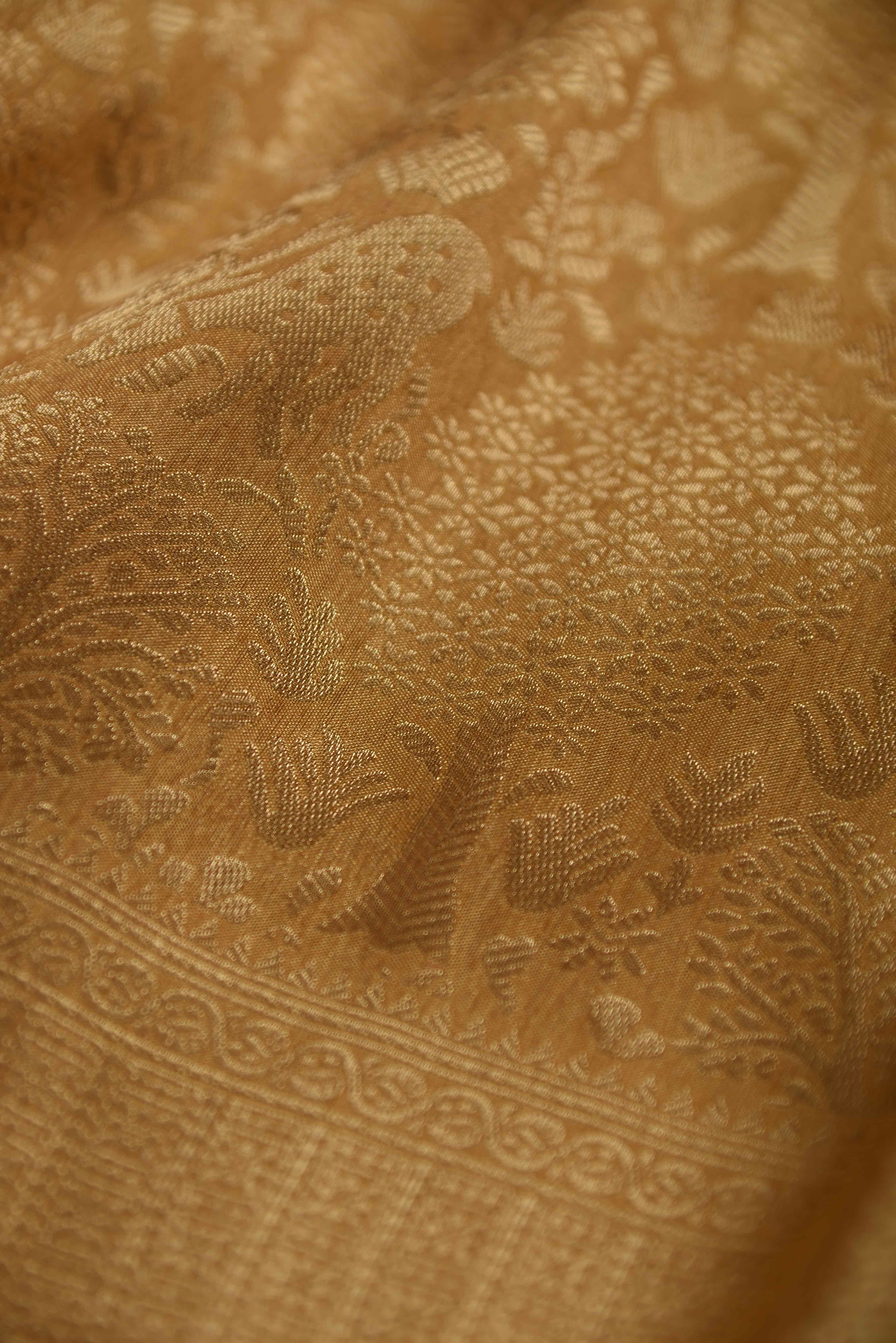 - Intricate golden zari motifs are delicately woven across the body, radiating richness and depth, while the pallu and borders are adorned with opulent zari craftsmanship—an heirloom touch that evokes tradition yet feels strikingly modern.