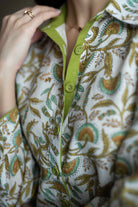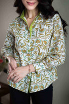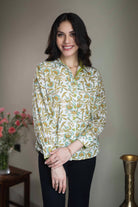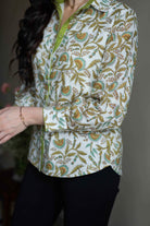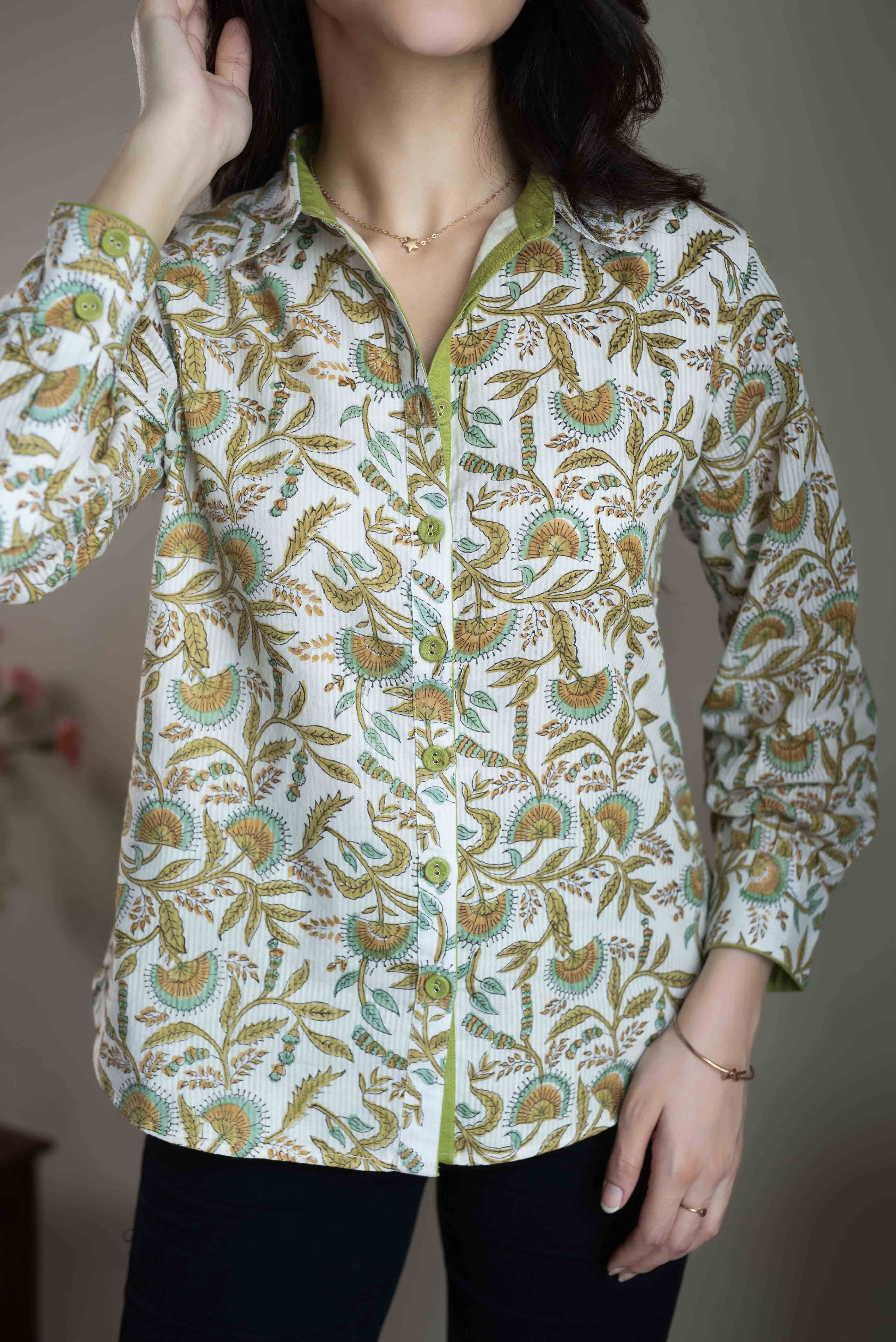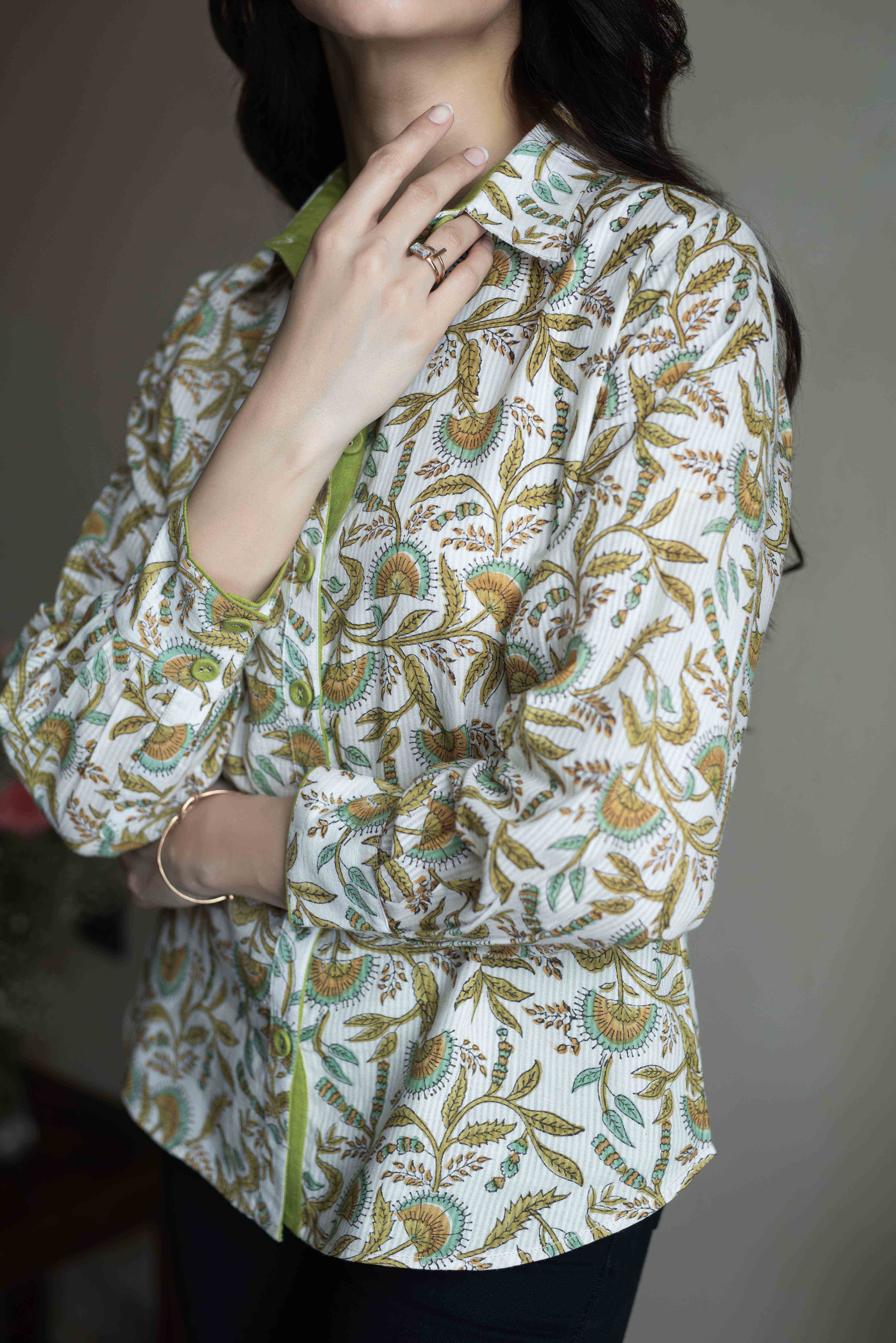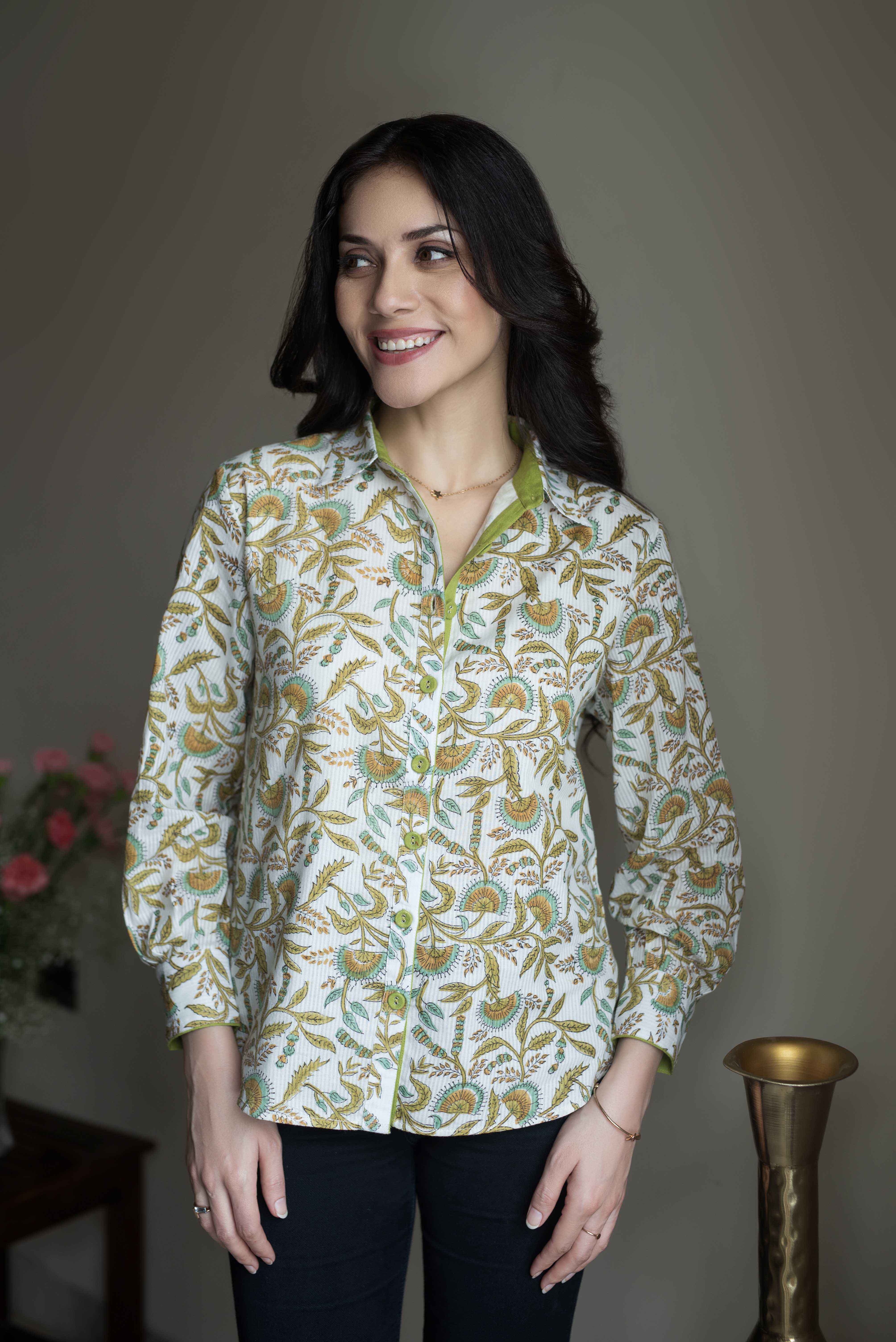 - Off-White with Green Pure Cotton Hand Block Printed Shirt – Relaxed Fit Breathe fresh life into your wardrobe with this Off-White with Green Hand Block Printed Shirt, crafted from pure cotton for a soft, breathable feel that keeps you cool and comfortable all day.