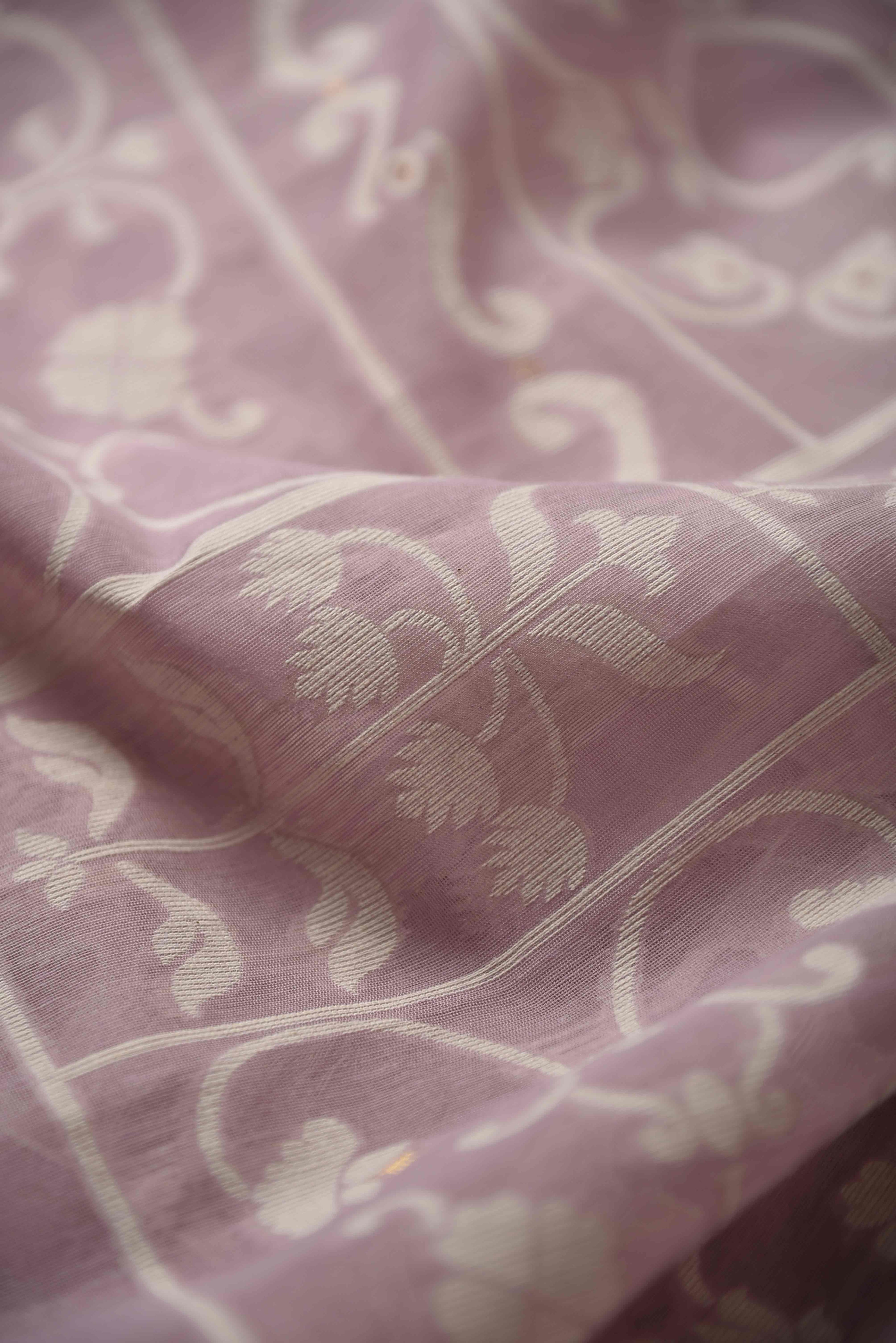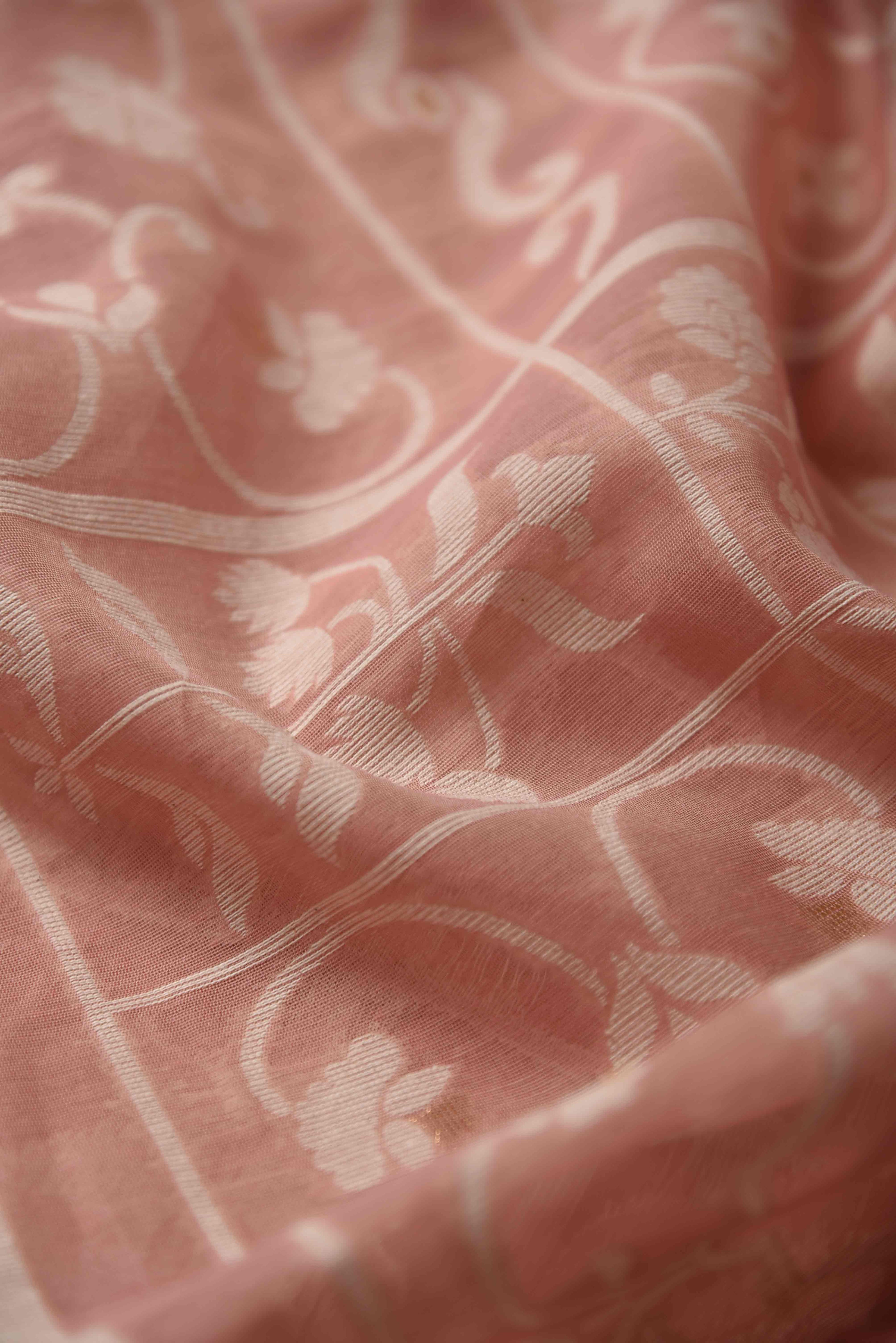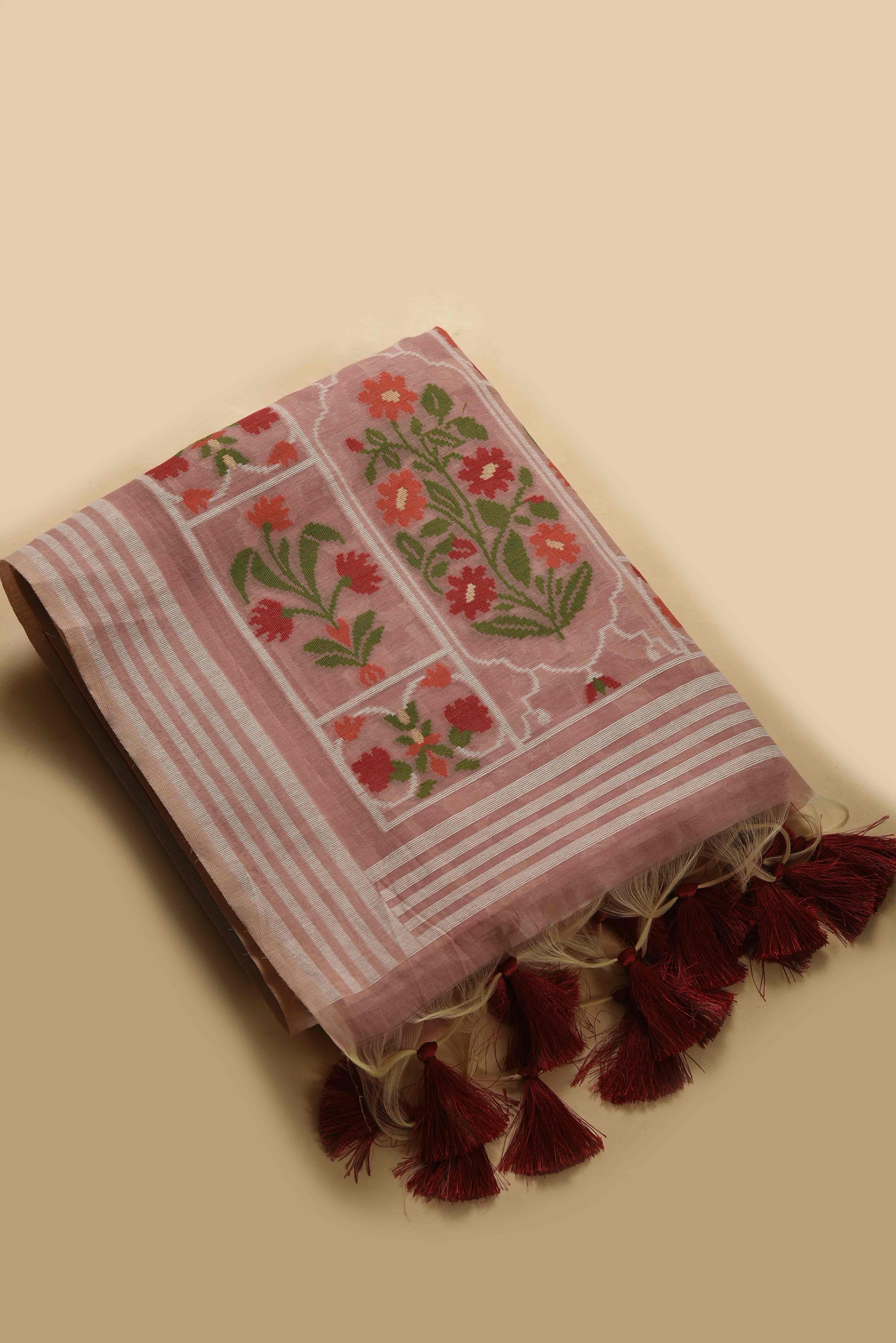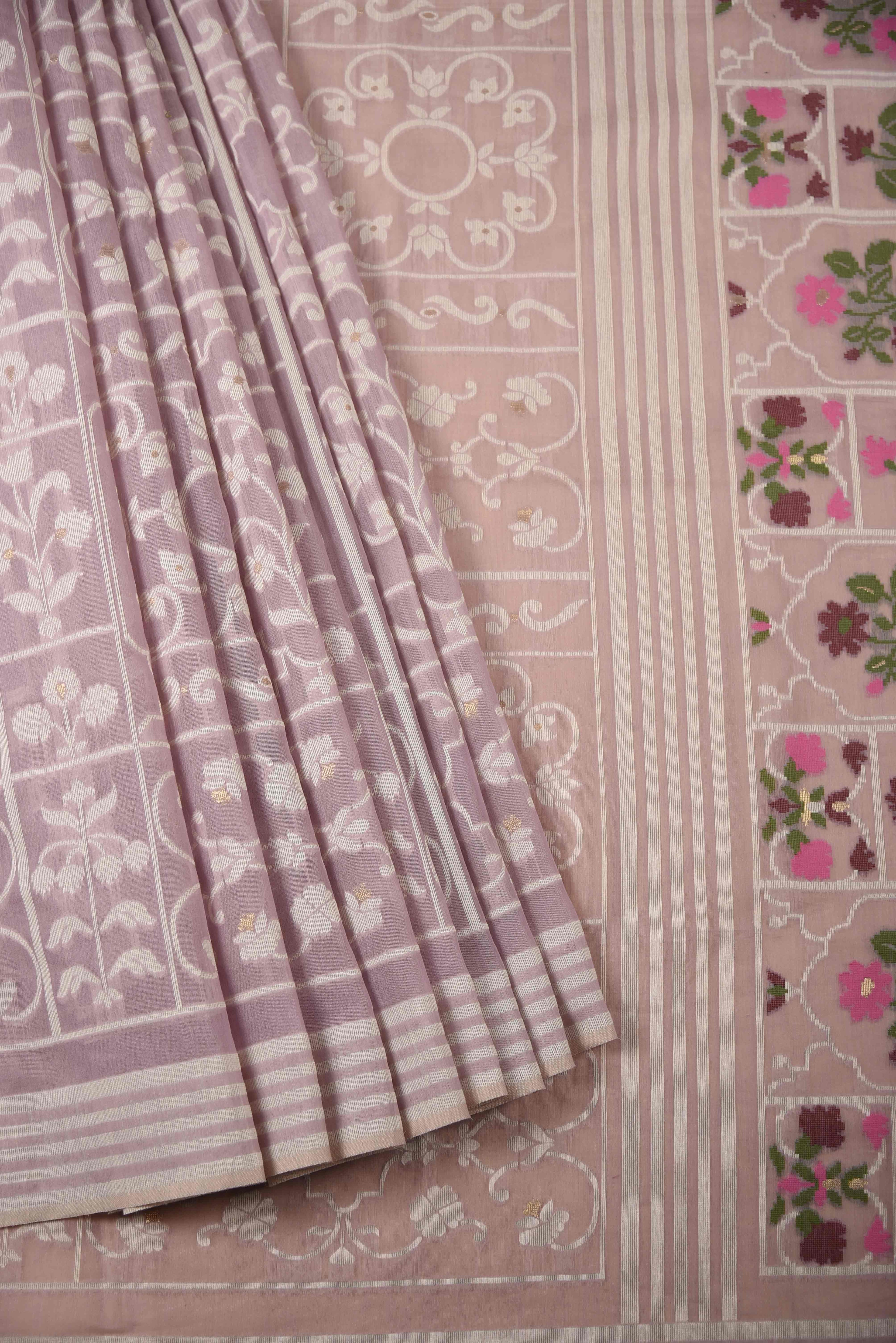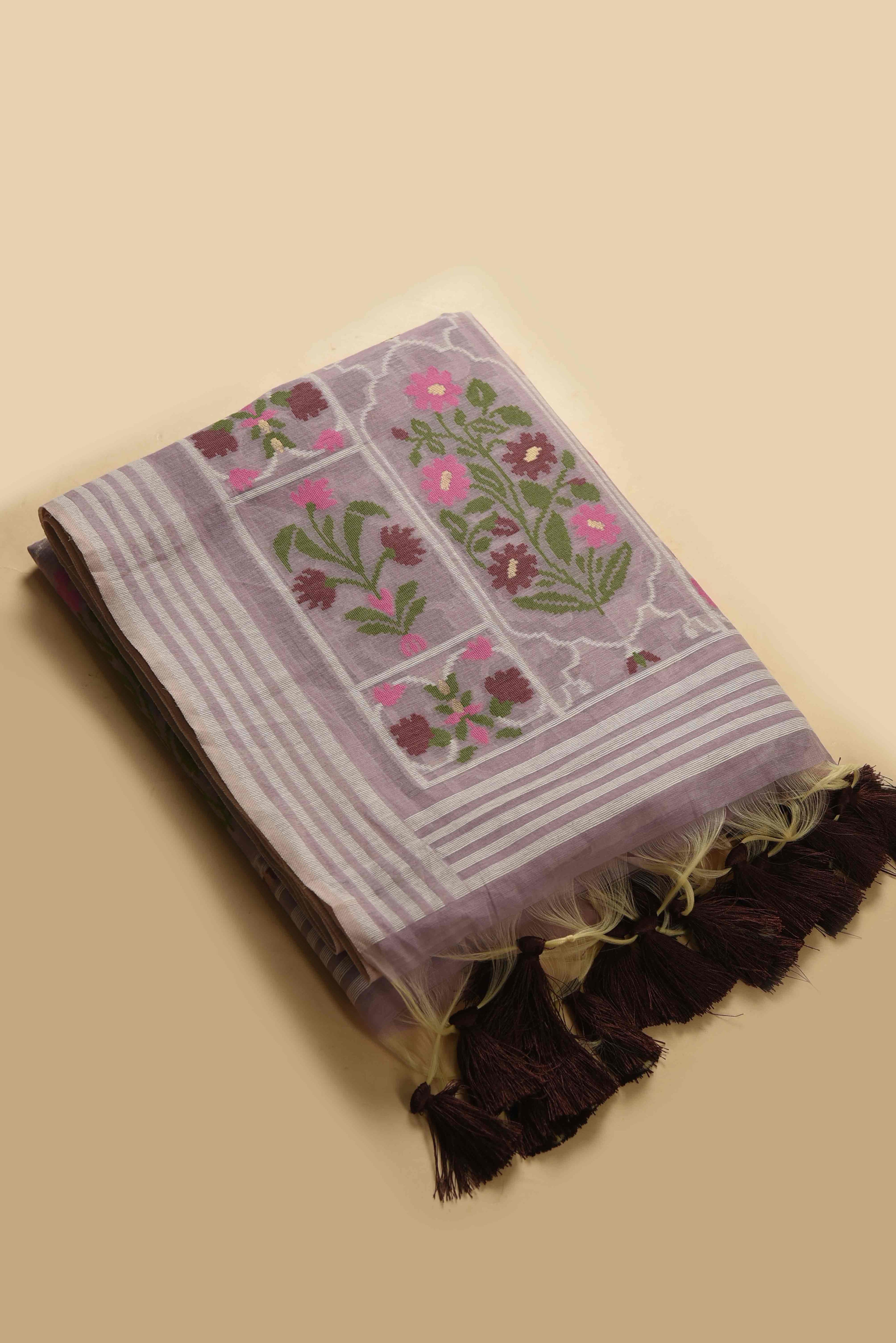 Jamdani sarees are renowned for their exquisite craftsmanship, meticulously handwoven in both Bangladesh and India. These sarees are distinguished by their elaborate floral and geometric motifs, achieved through the innovative use of a supplementary weft technique. Typically crafted from premium muslin or cotton, Jamdani sarees are celebrated for their lightweight and breathable nature, as well as their refined elegance.