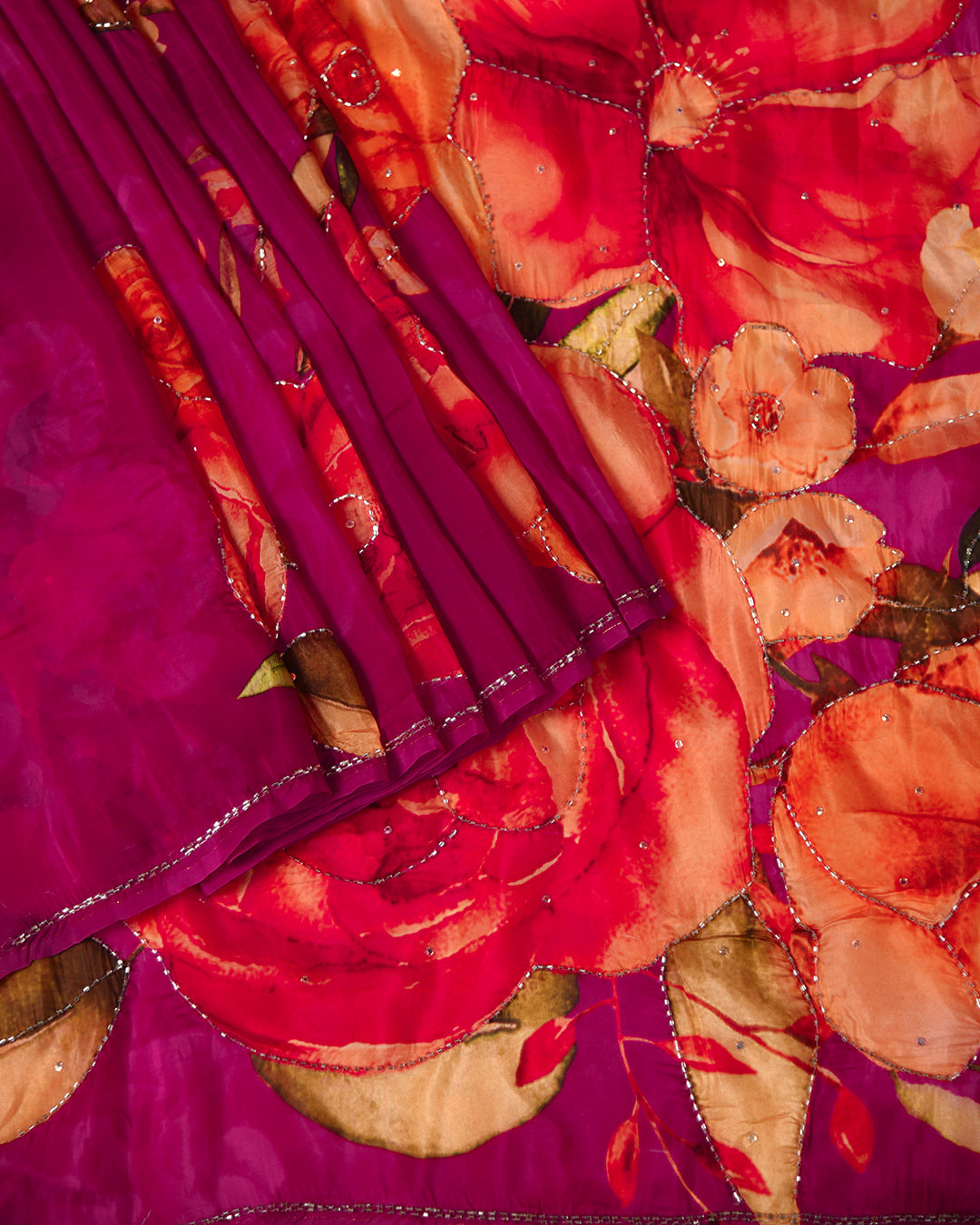Make a grand entrance in a heavily embellished saree or an embroidered saree with rich jewel tones. For a truly exceptional piece, consider a saree woven with intricate hand embroidery. These sarees are meticulously crafted by skilled artisans, resulting in stunning designs that are both visually striking and culturally significant. Whether you choose a traditional or contemporary style, a hand-embroidered saree is sure to make a lasting impression.