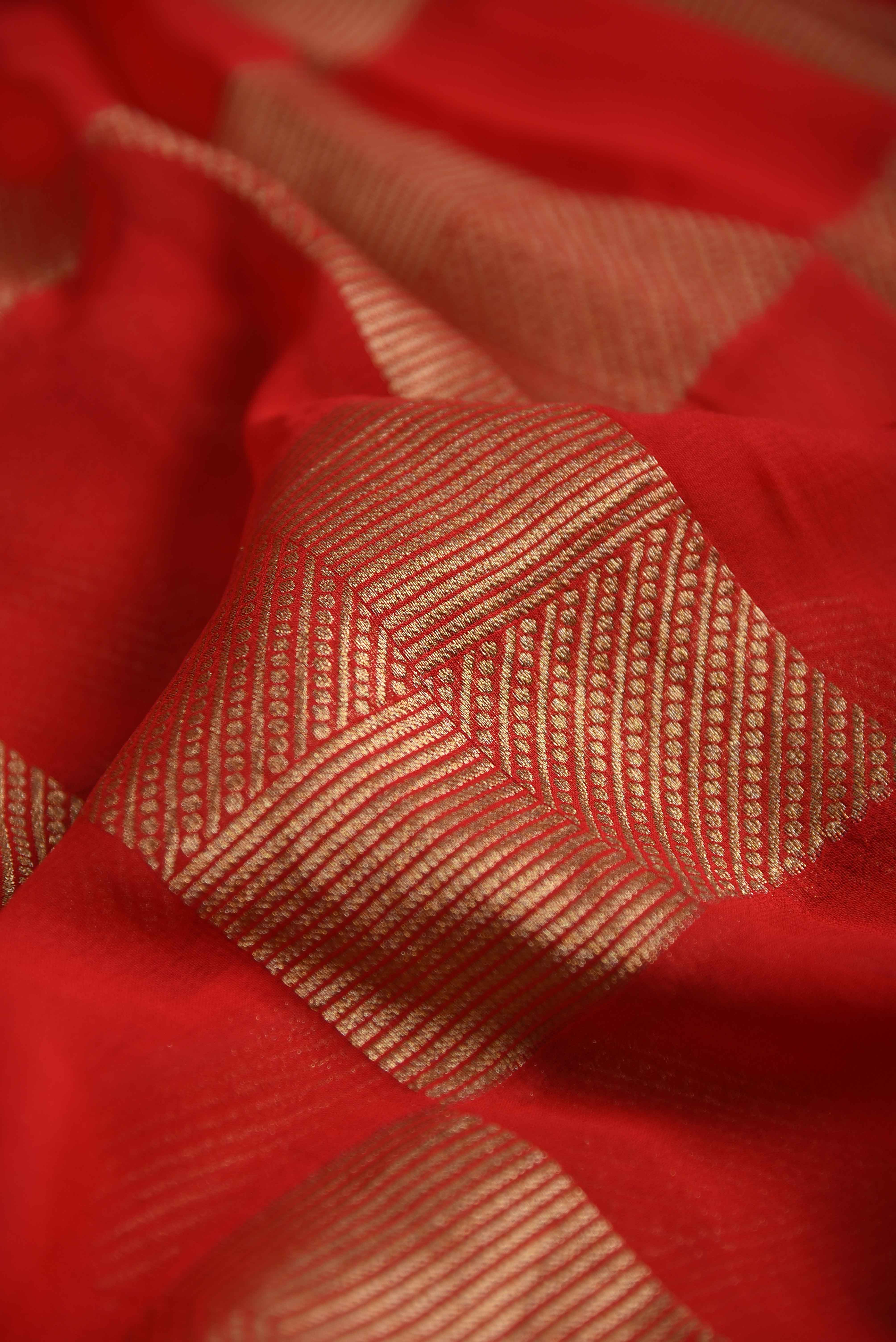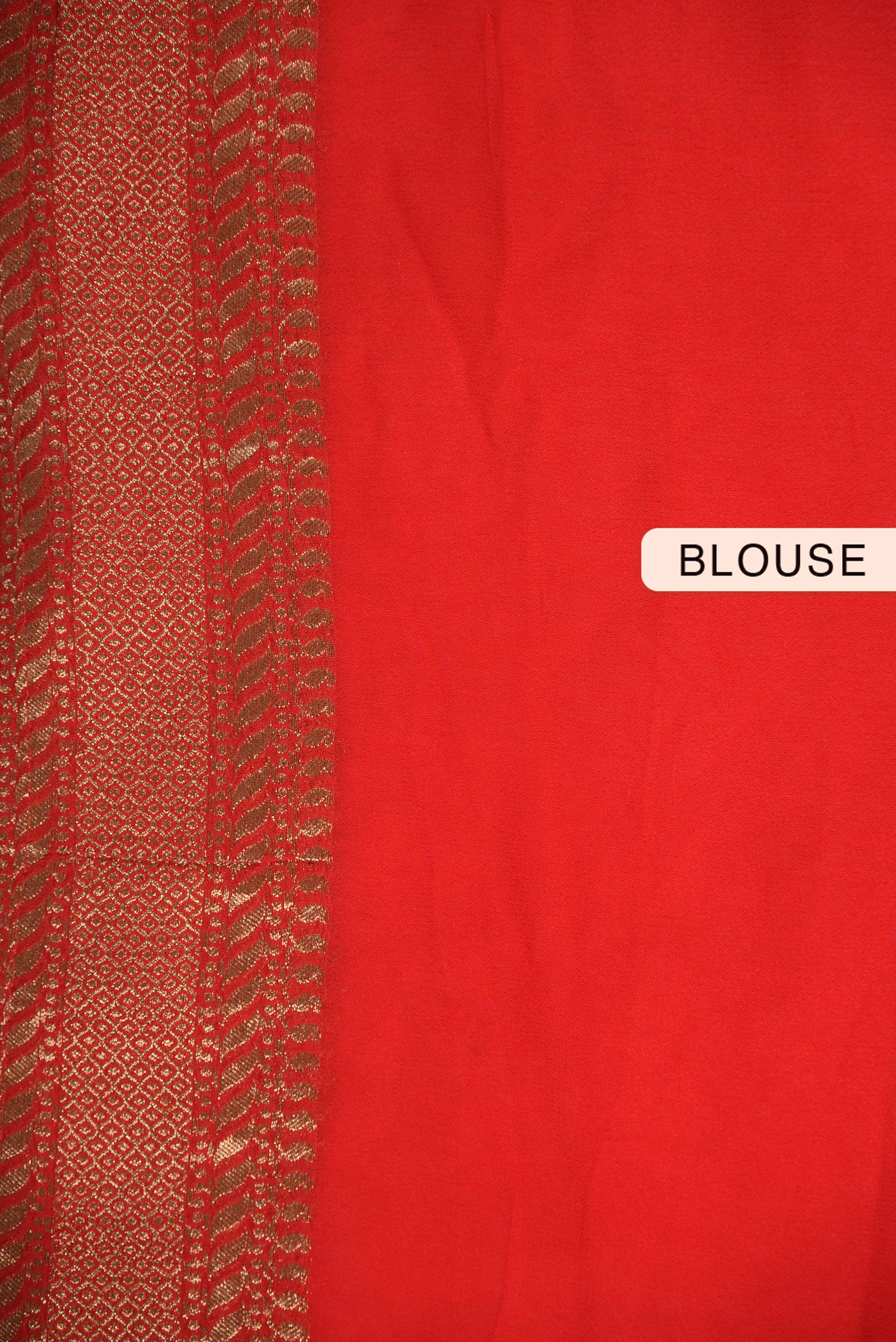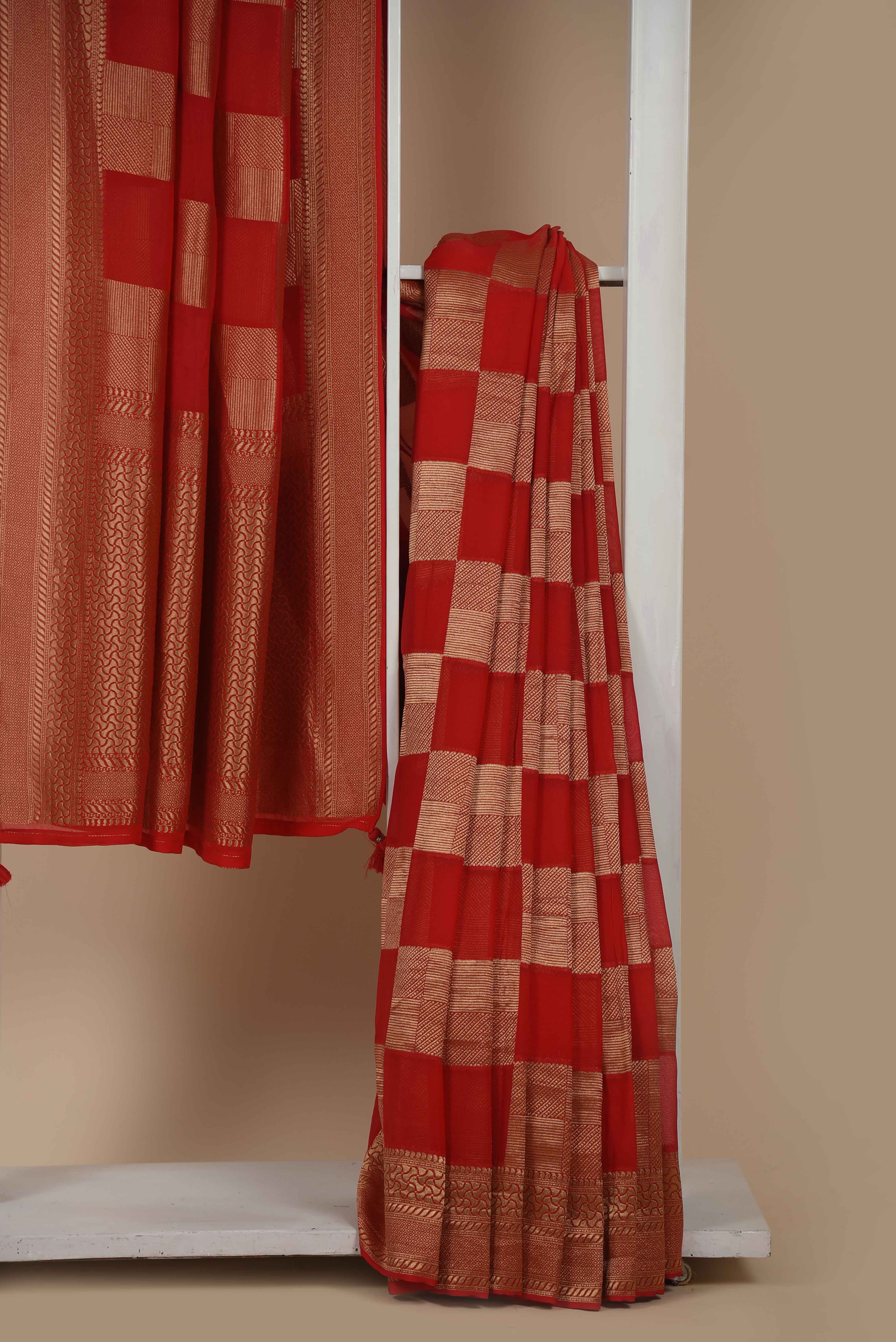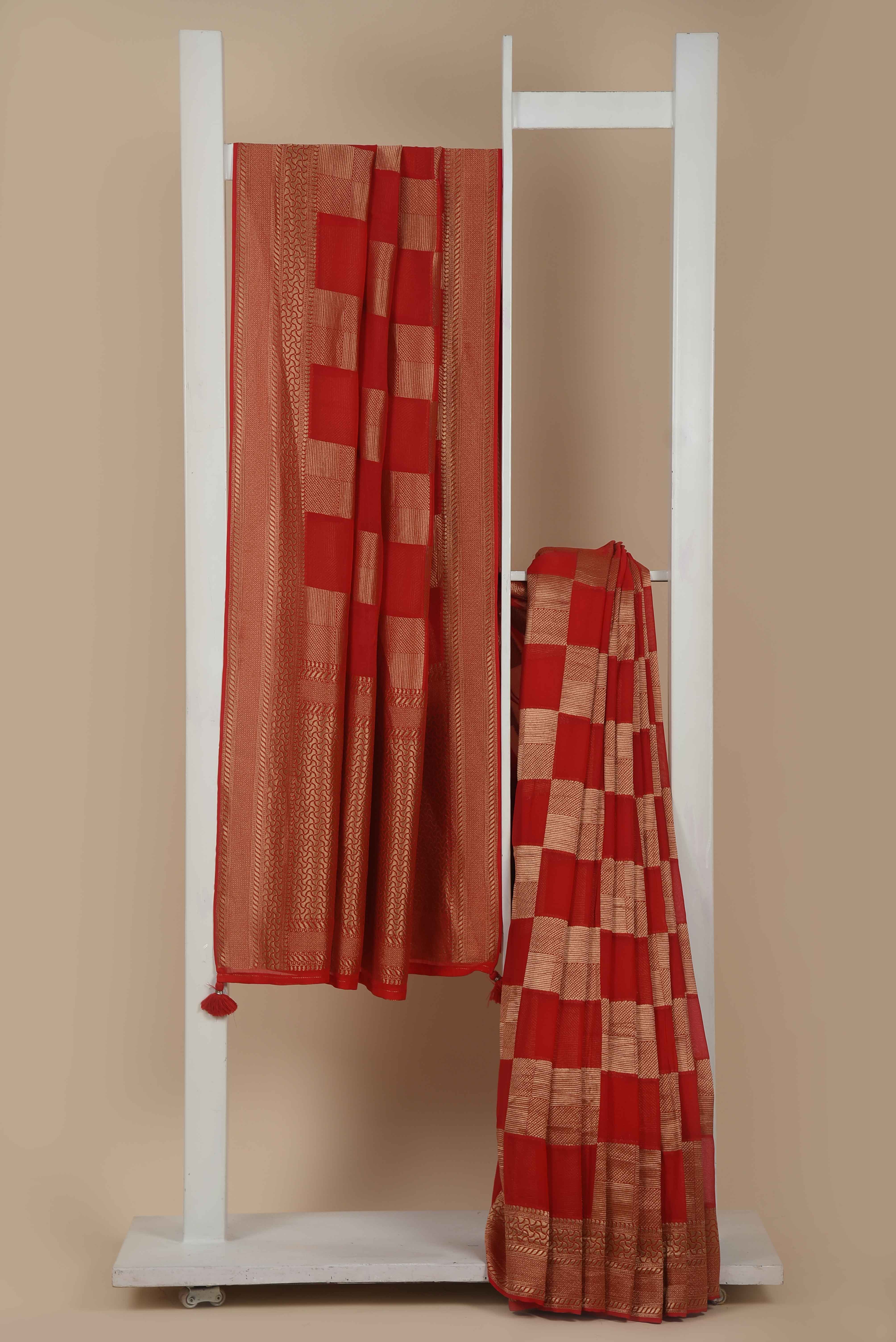 Experience timeless elegance with this Red Georgette Woven Saree, crafted from soft, breathable fabric that ensures comfort and graceful flow.