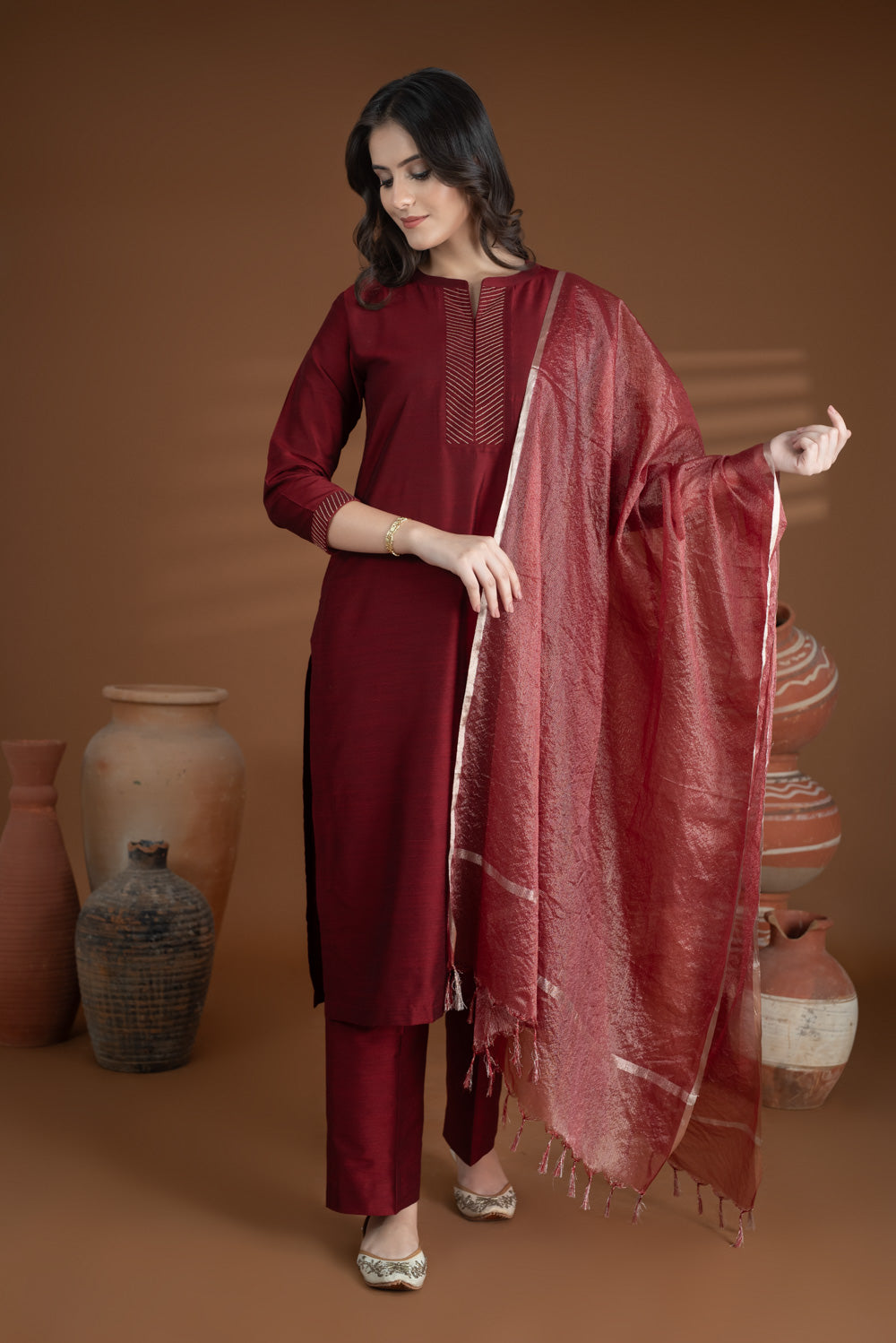 - Add a festive touch with our Maroon Cotton Silk Zari Work Kurta Set – Regular Fit.