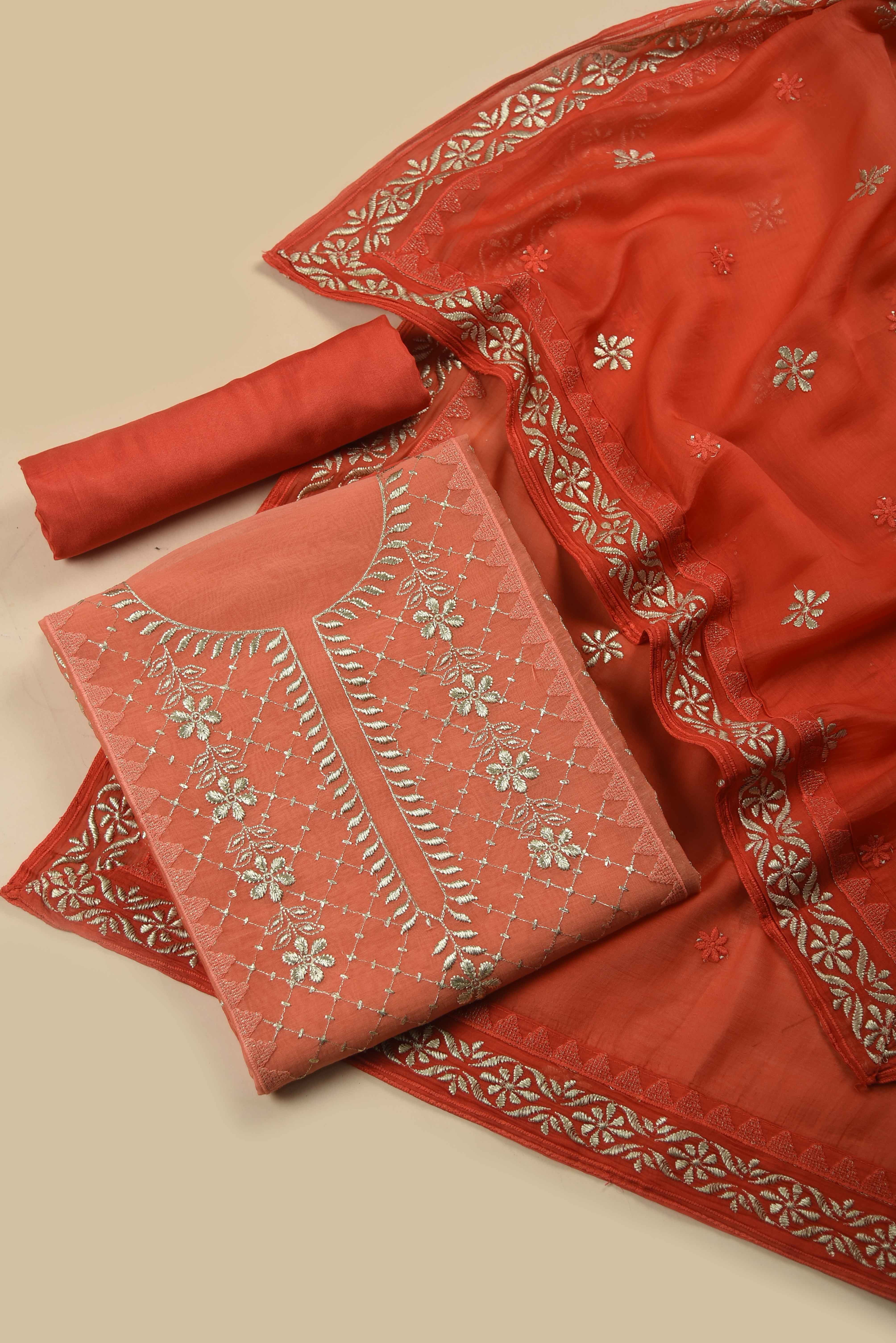 Orange Mul Chanderi Embroidered Unstitched Suit Fabric Set With Mul Chanderi Embroidered Dupatta