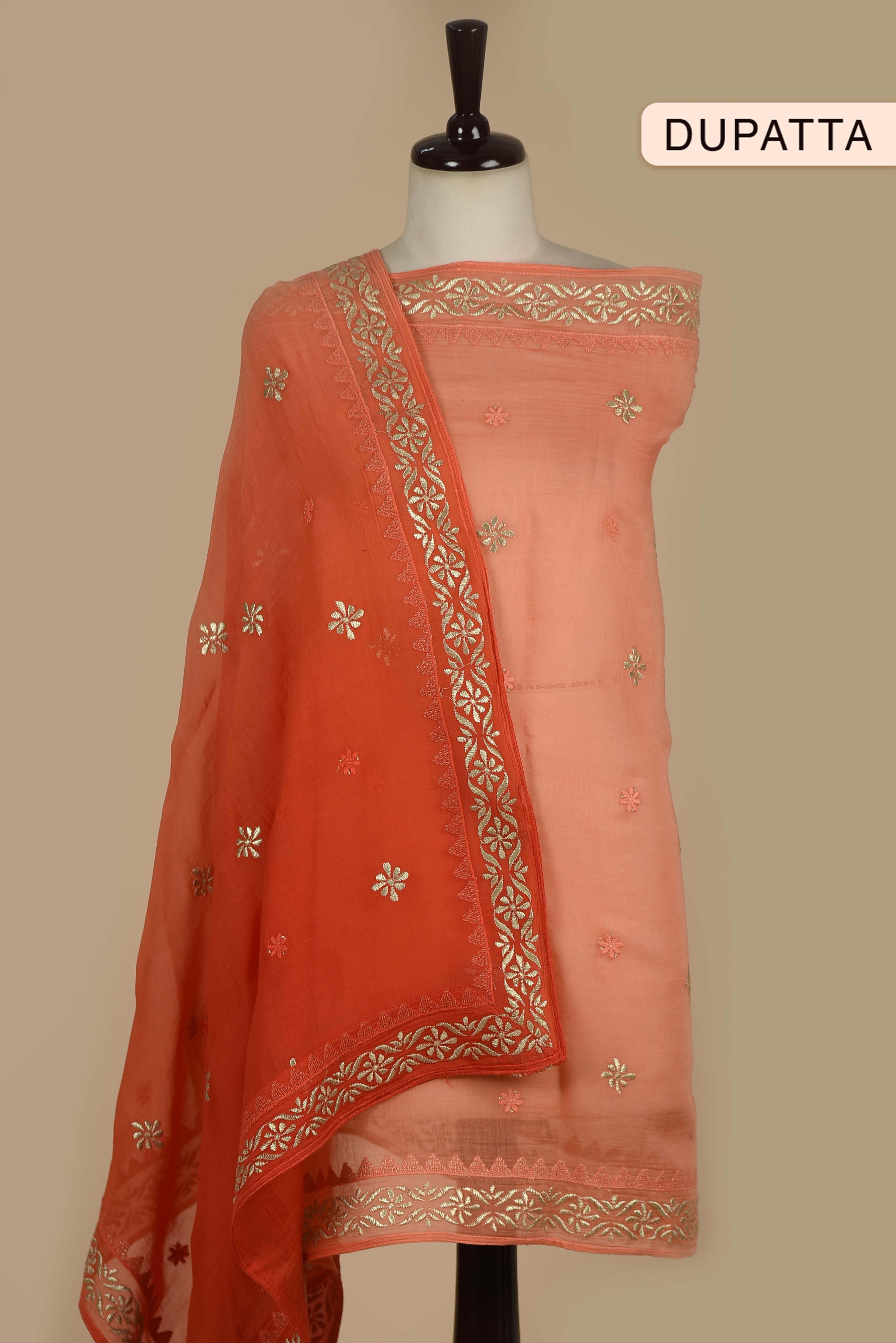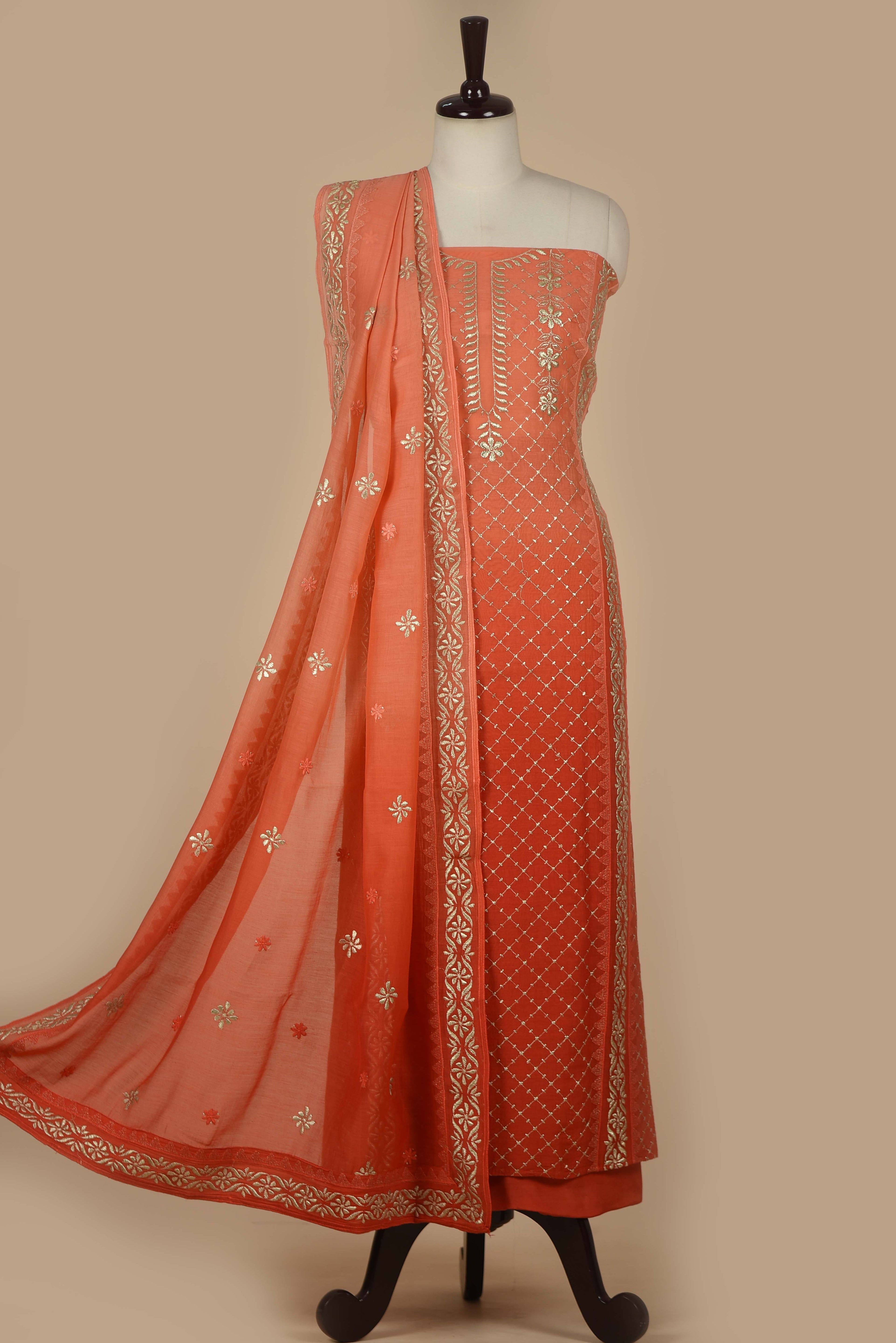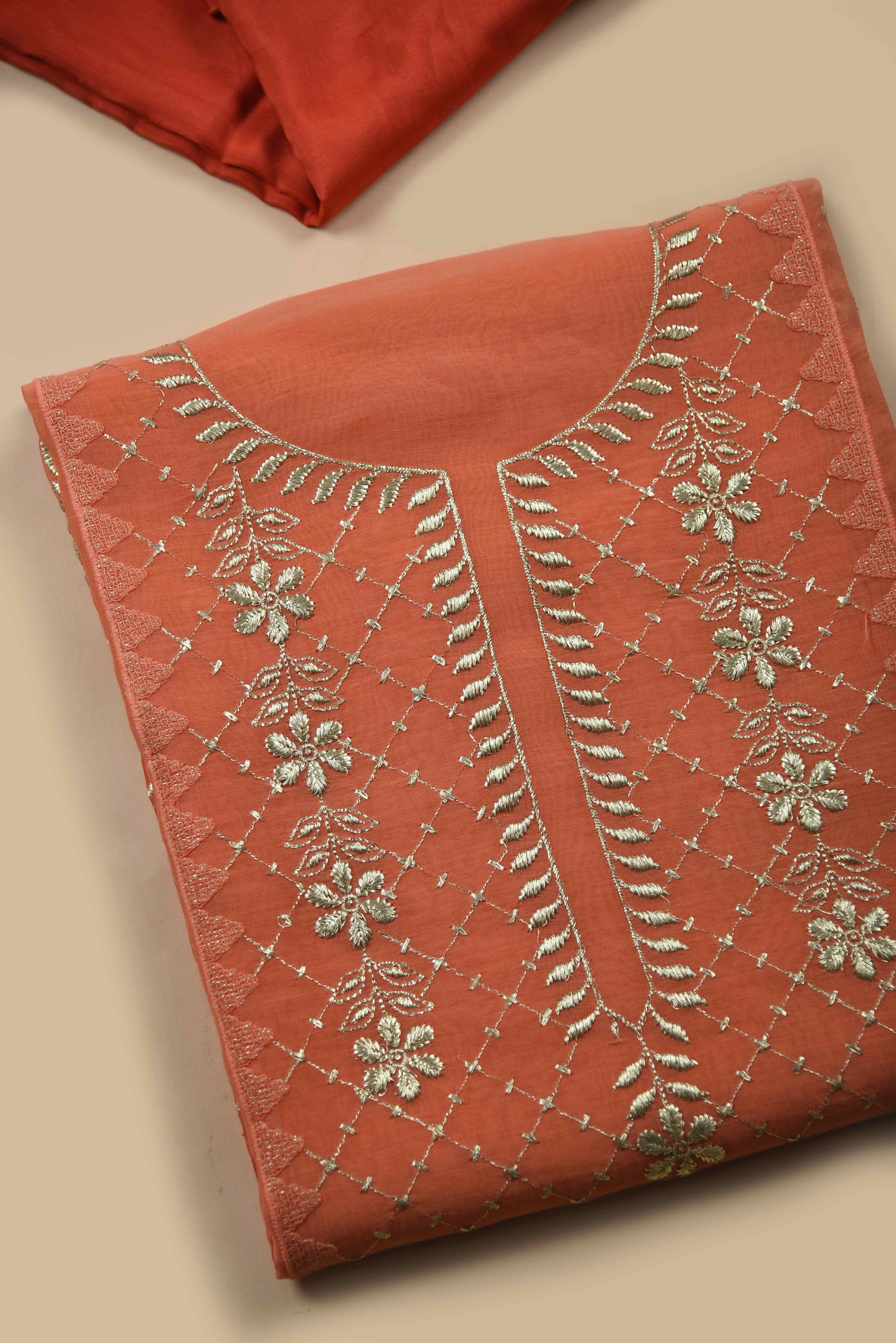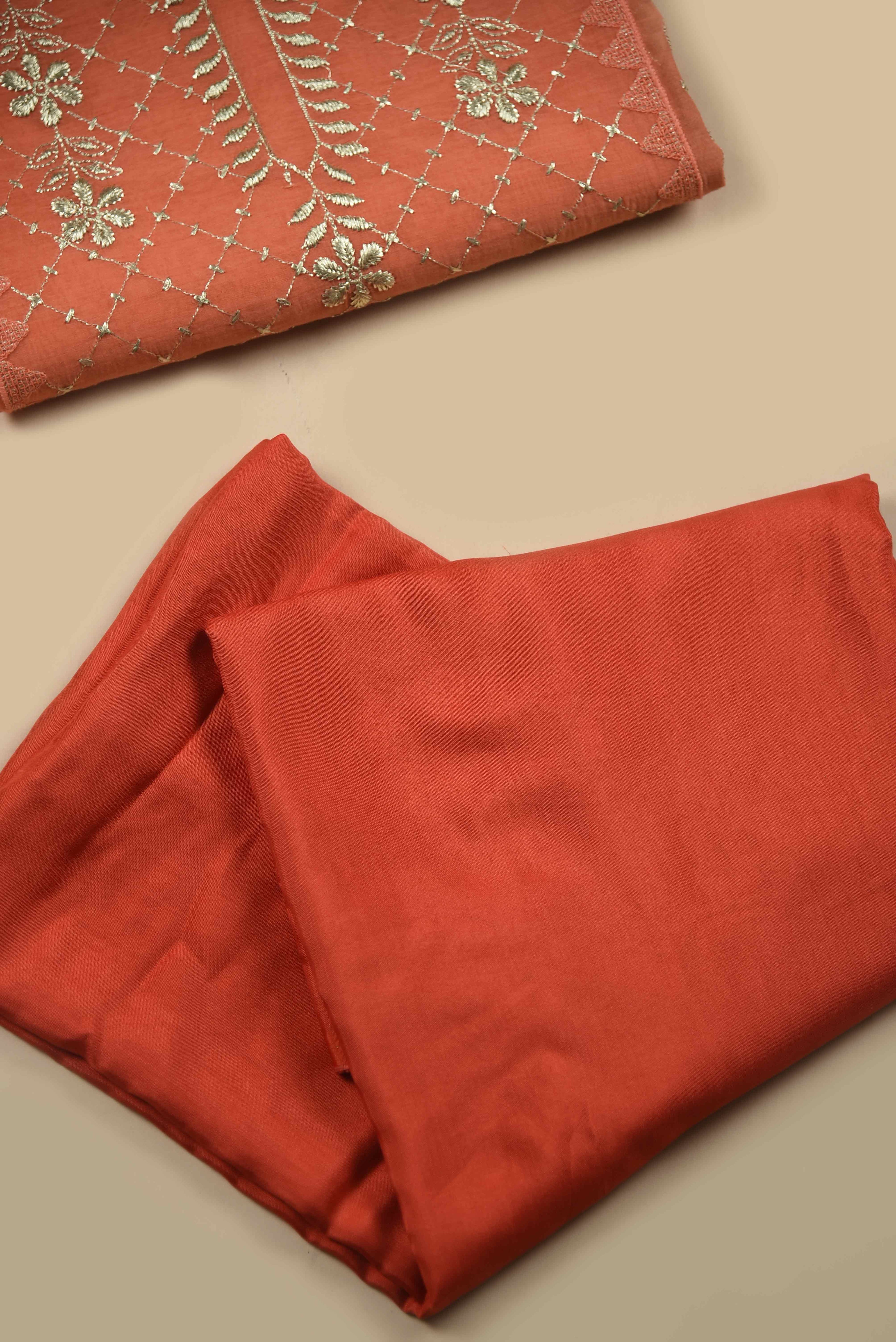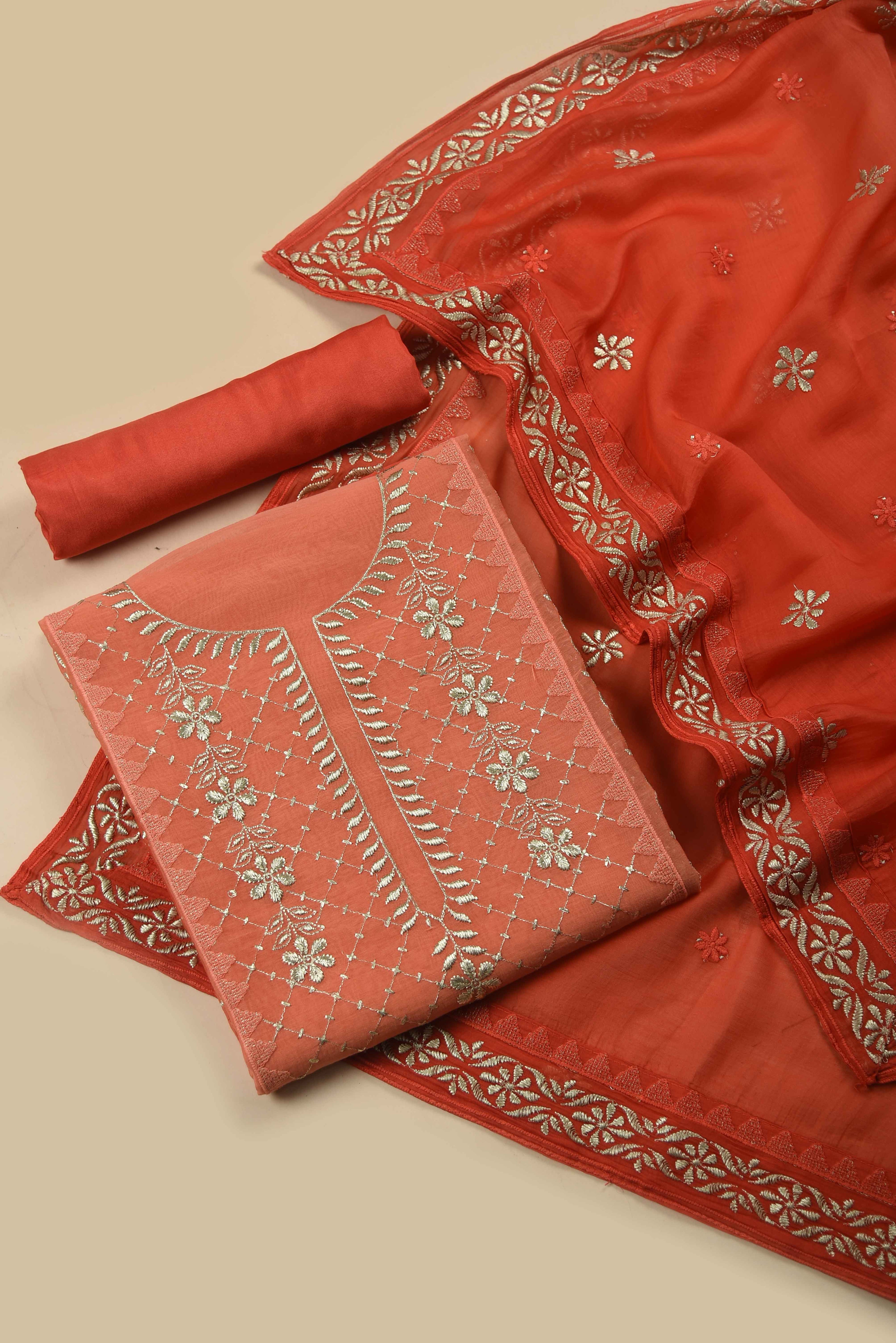 Red Mul chanderi Embroidered Unstitched Suit Fabric Set With Mul Chanderi Embroidered Dupatta