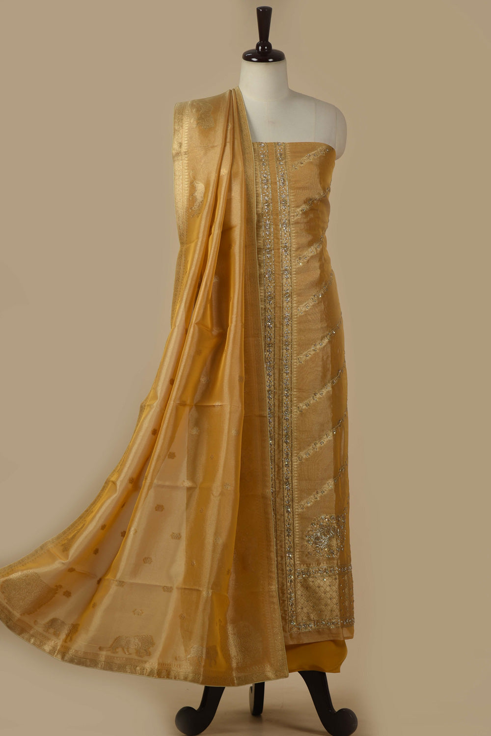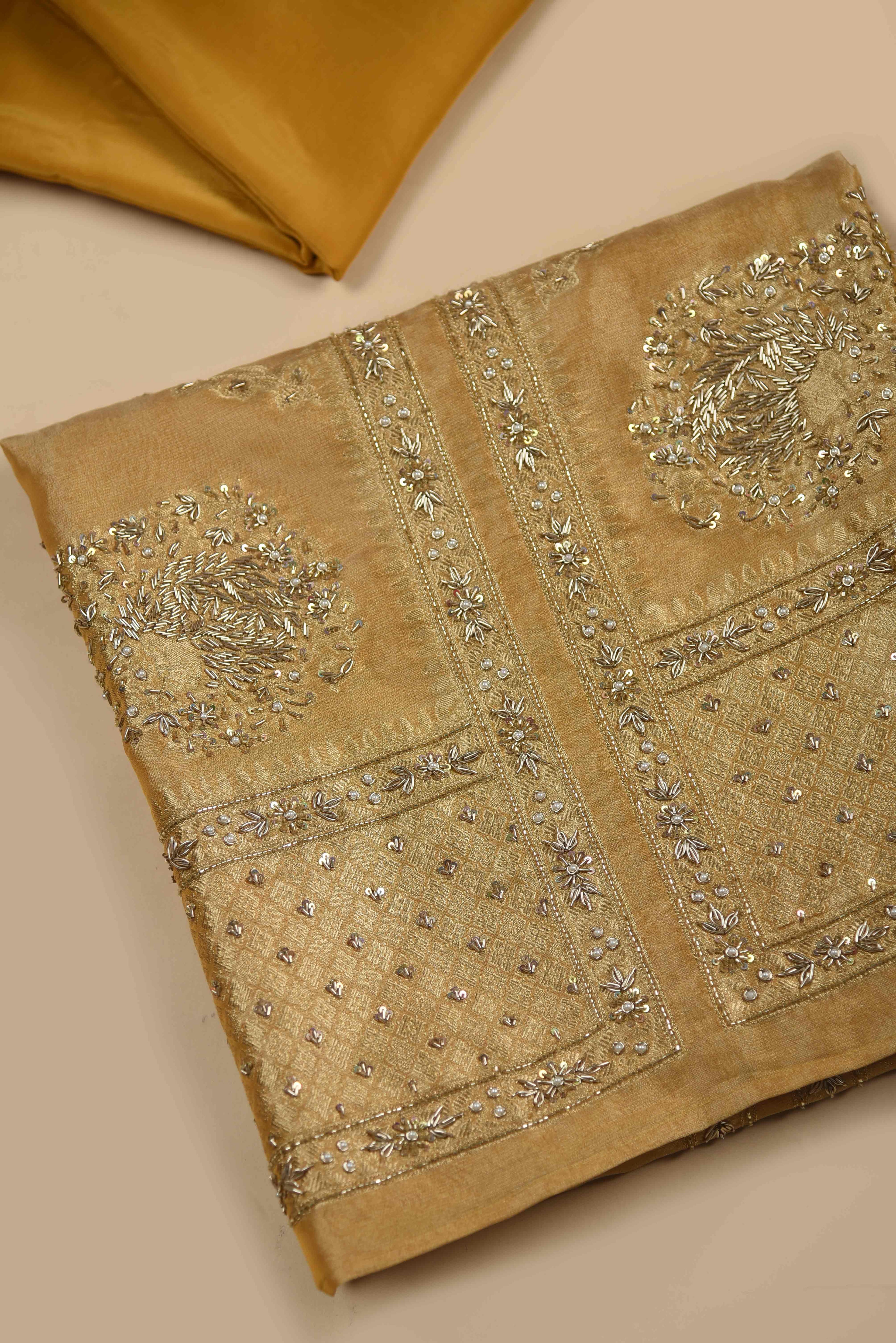 Beige With Mustard Chanderi Embroidered Unstitched Suit Fabric Set With Chanderi Woven Dupatta