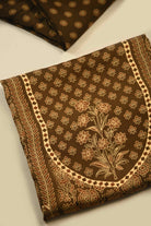 - Elevate your wardrobe with this sophisticated unstitched suit fabric set featuring a striking black base with vibrant Brown modal satin, adorned with rich, intricate prints.
