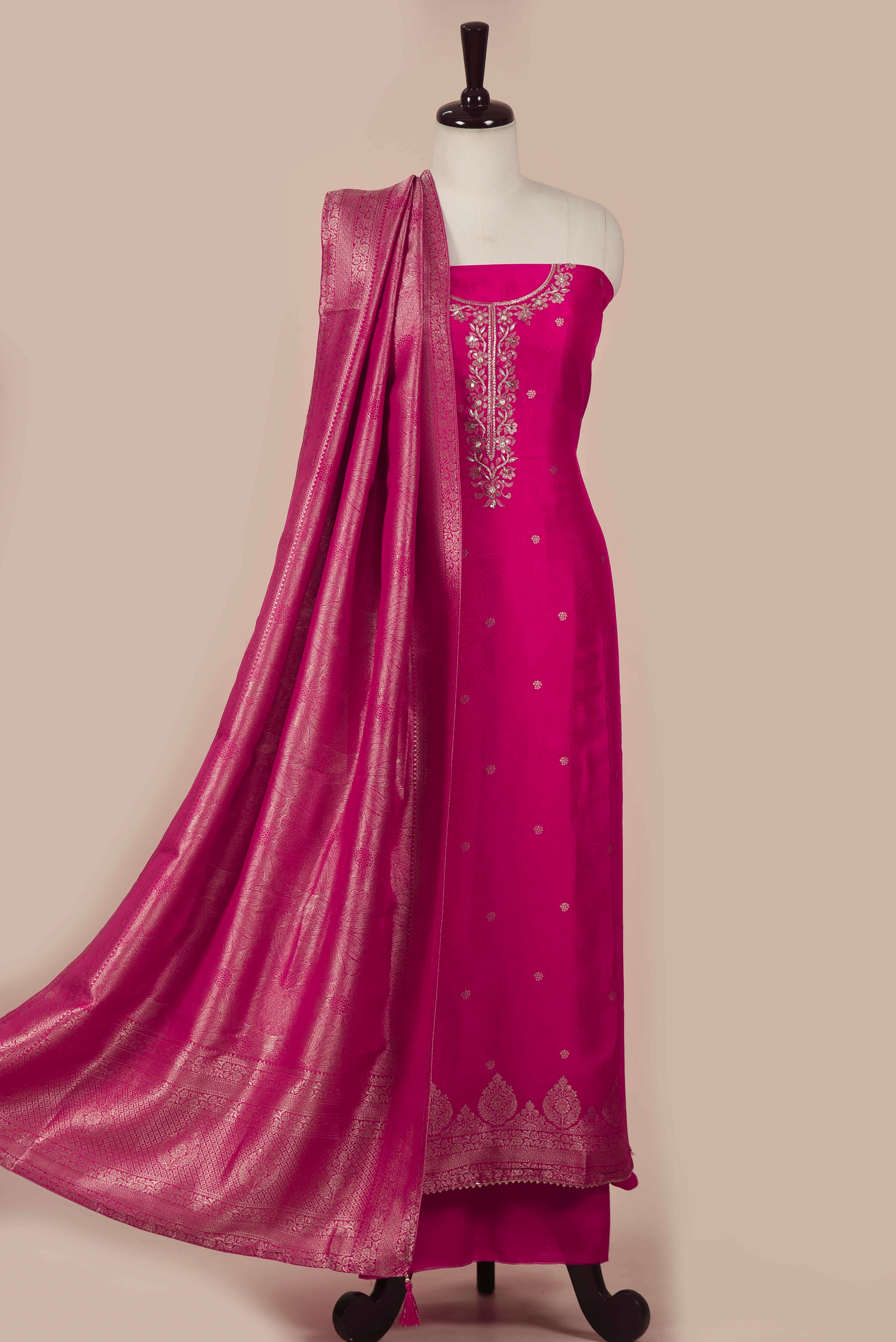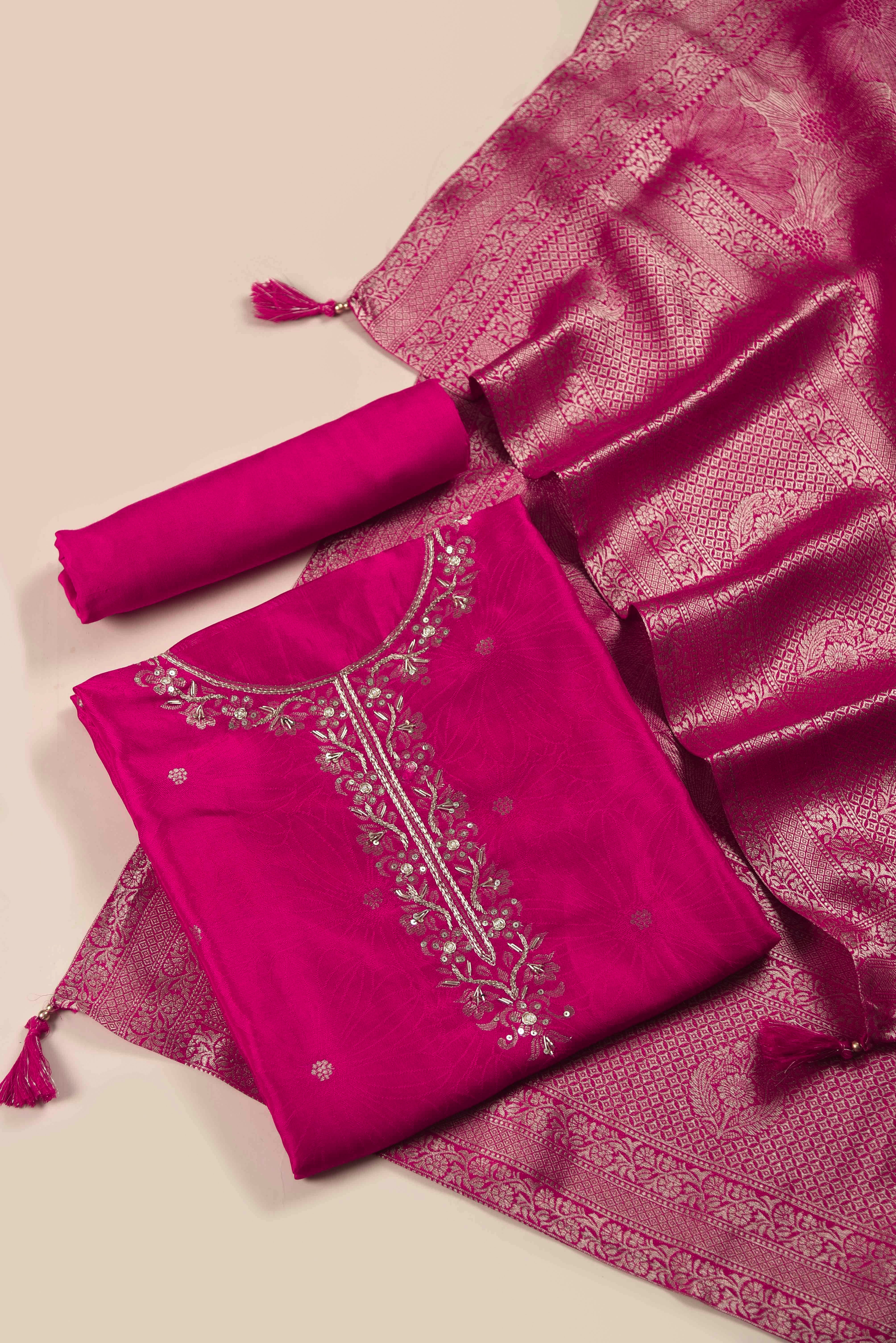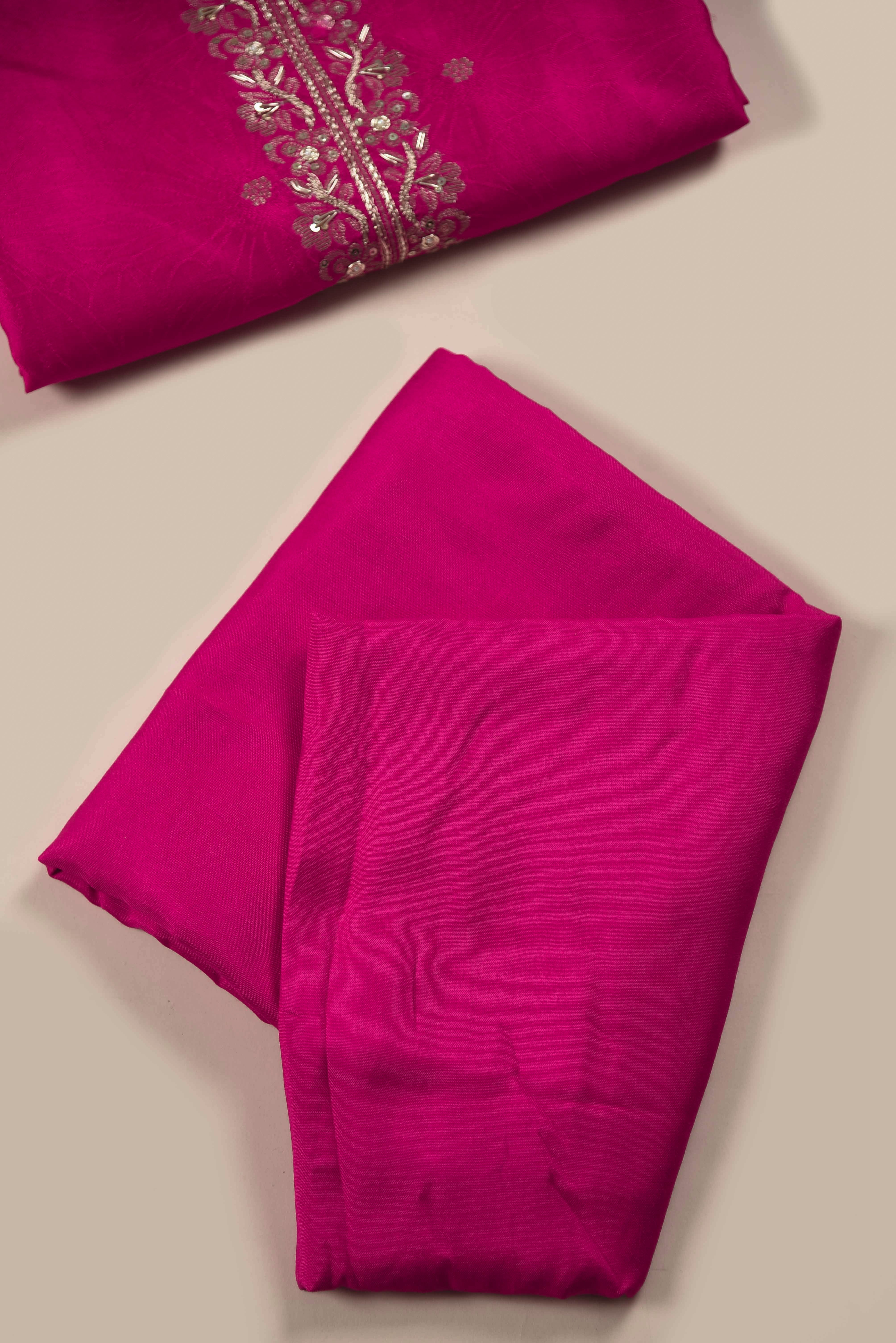 • Magenta Silk Viscose Woven & Embroidered Unstitched Suit Fabric Set with Silk Viscose Woven Dupatta Step into sophistication with this limited-edition new arrival, crafted from soft silk viscose fabric enriched with subtle self-textures for a luxurious yet comfortable feel.
