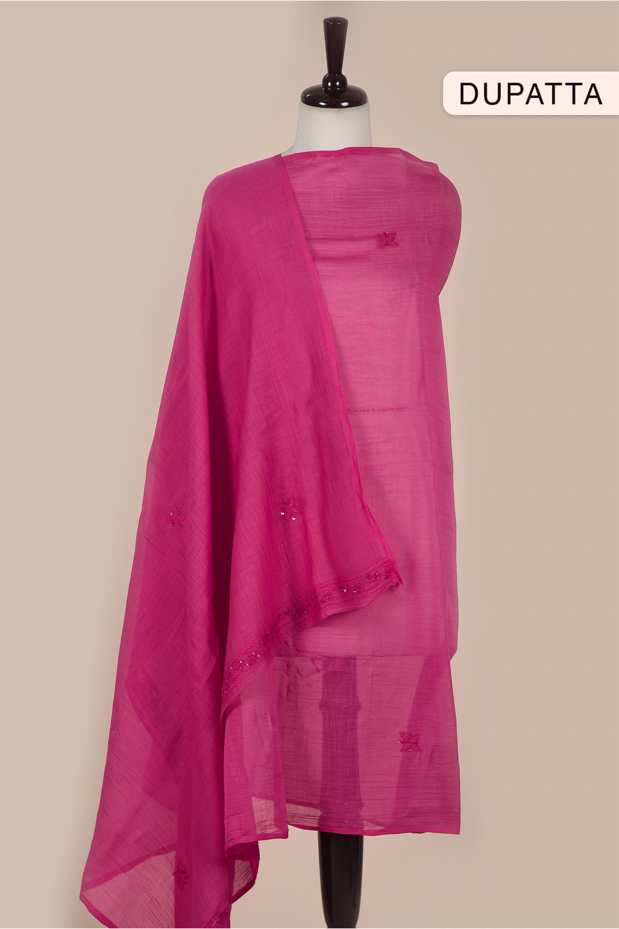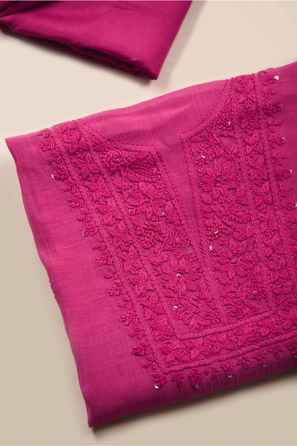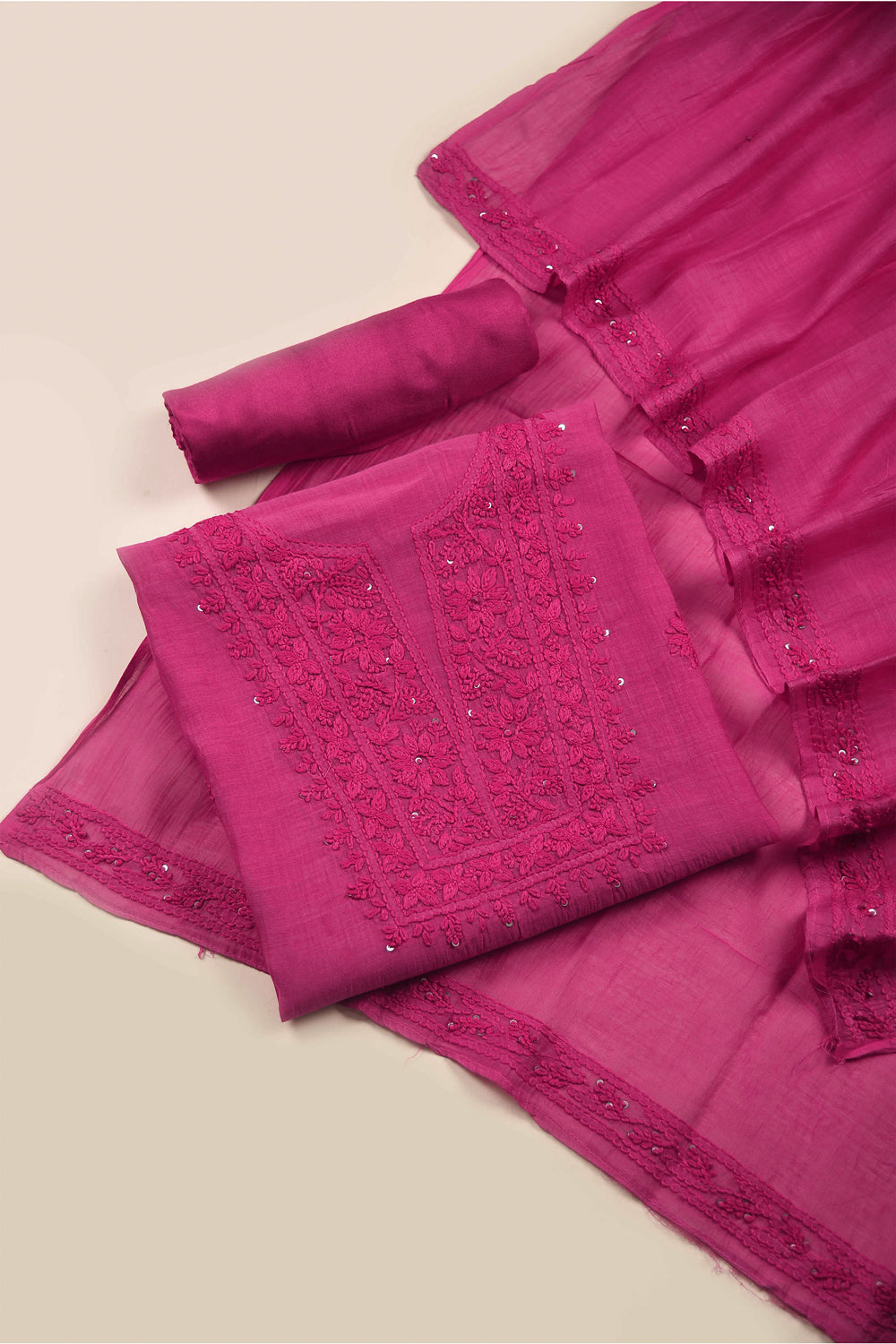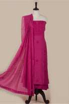 - This Pink Mul Chanderi Embroidered Unstitched Suit Fabric Set features delicate embroidery on soft, breathable Mul Chanderi fabric, radiating elegance and vibrancy.