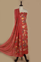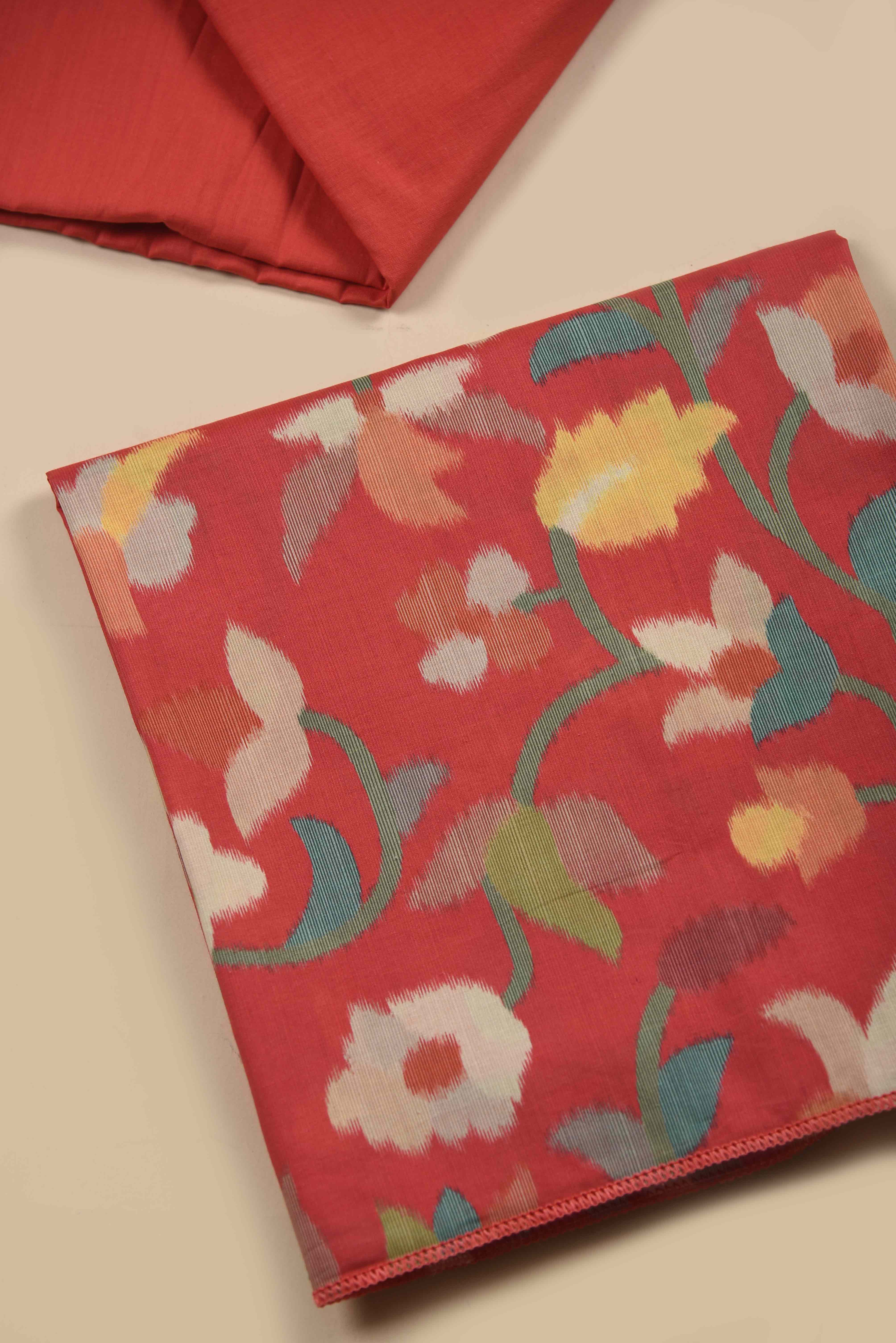- Discover timeless elegance with this Red Cotton Printed unstitched suit fabric set, featuring vibrant floral motifs that capture the essence of festive celebrations.