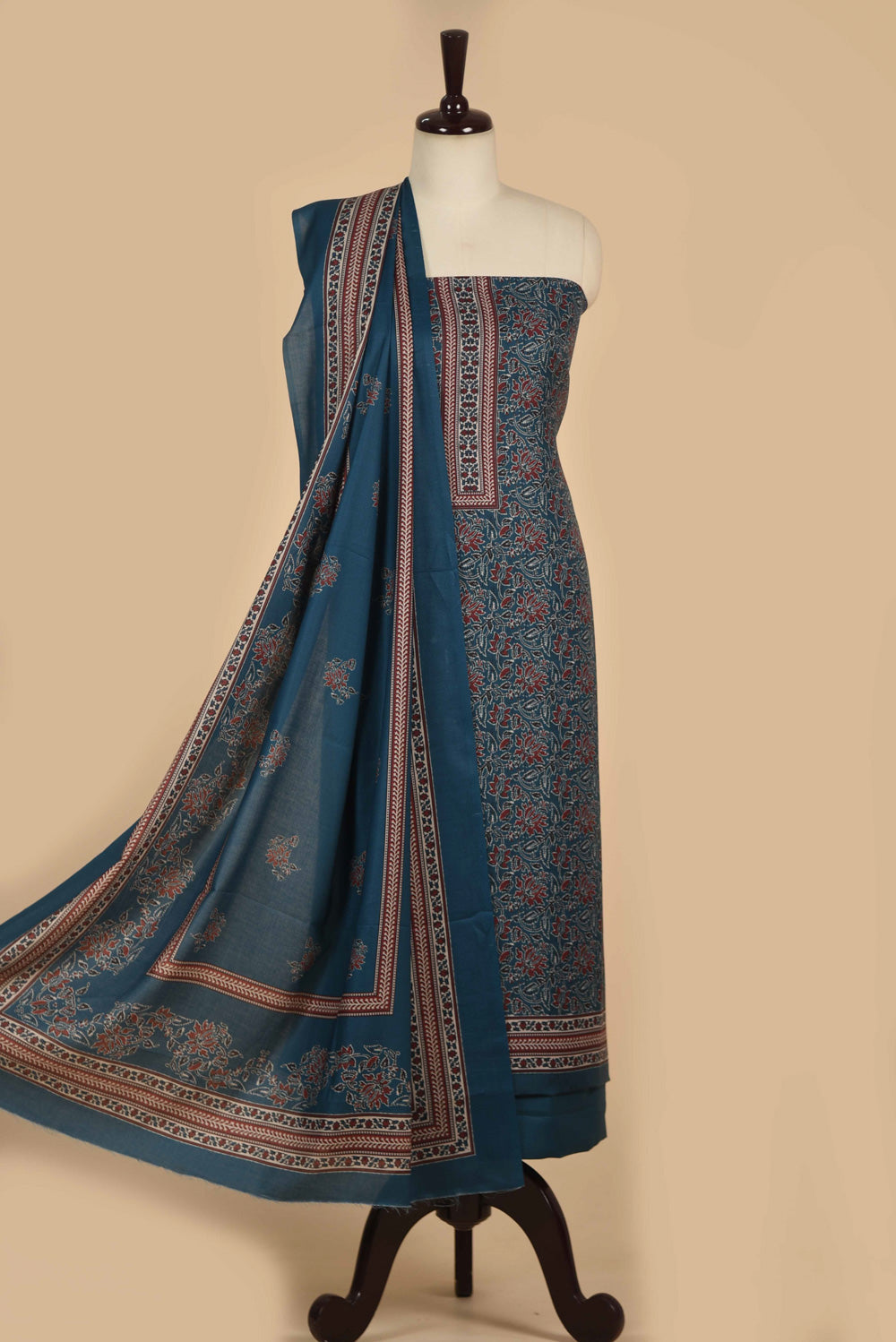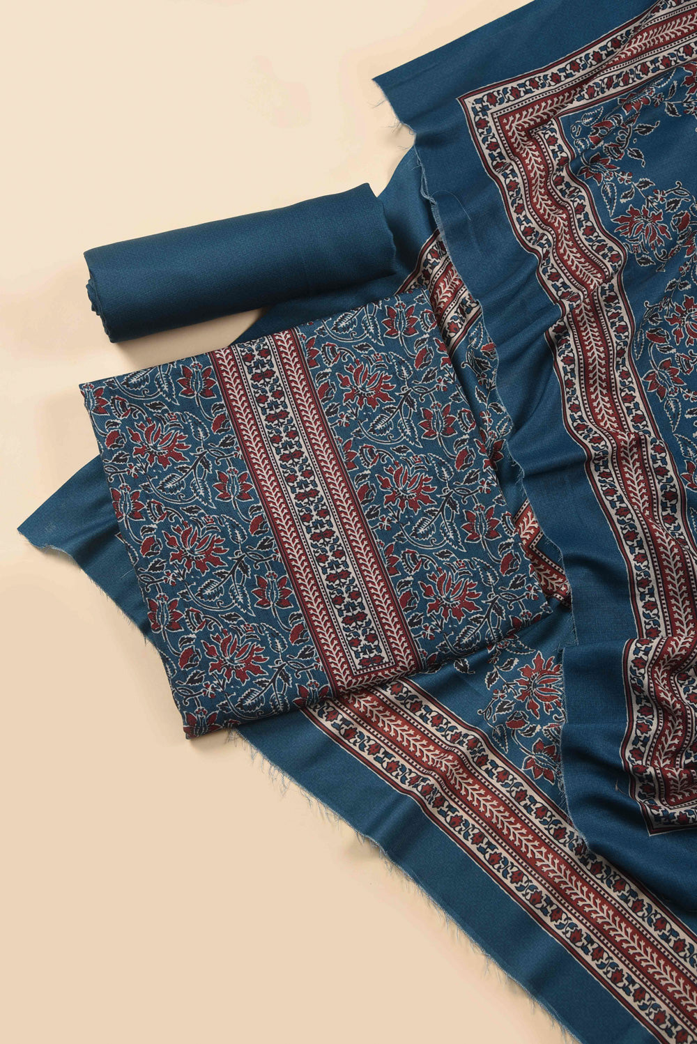 • Each piece the unstitched suit fabric and coordinating wool spun blend dupatta demonstrates meticulous attention to detail and quality construction.