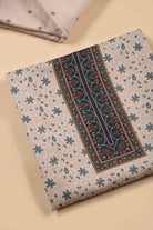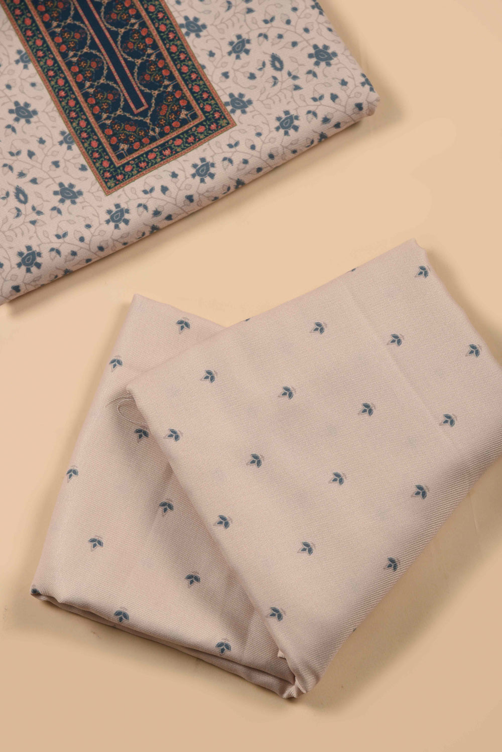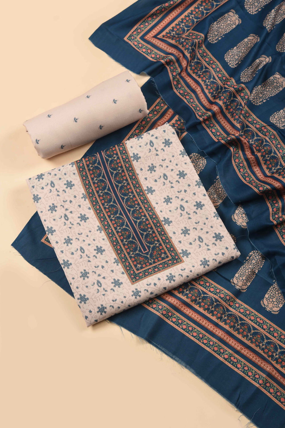 Cream With Blue Winter Wear Wool Spun Printed Unstitched Suit Fabric Set With Wool Blend Printed Dupatta