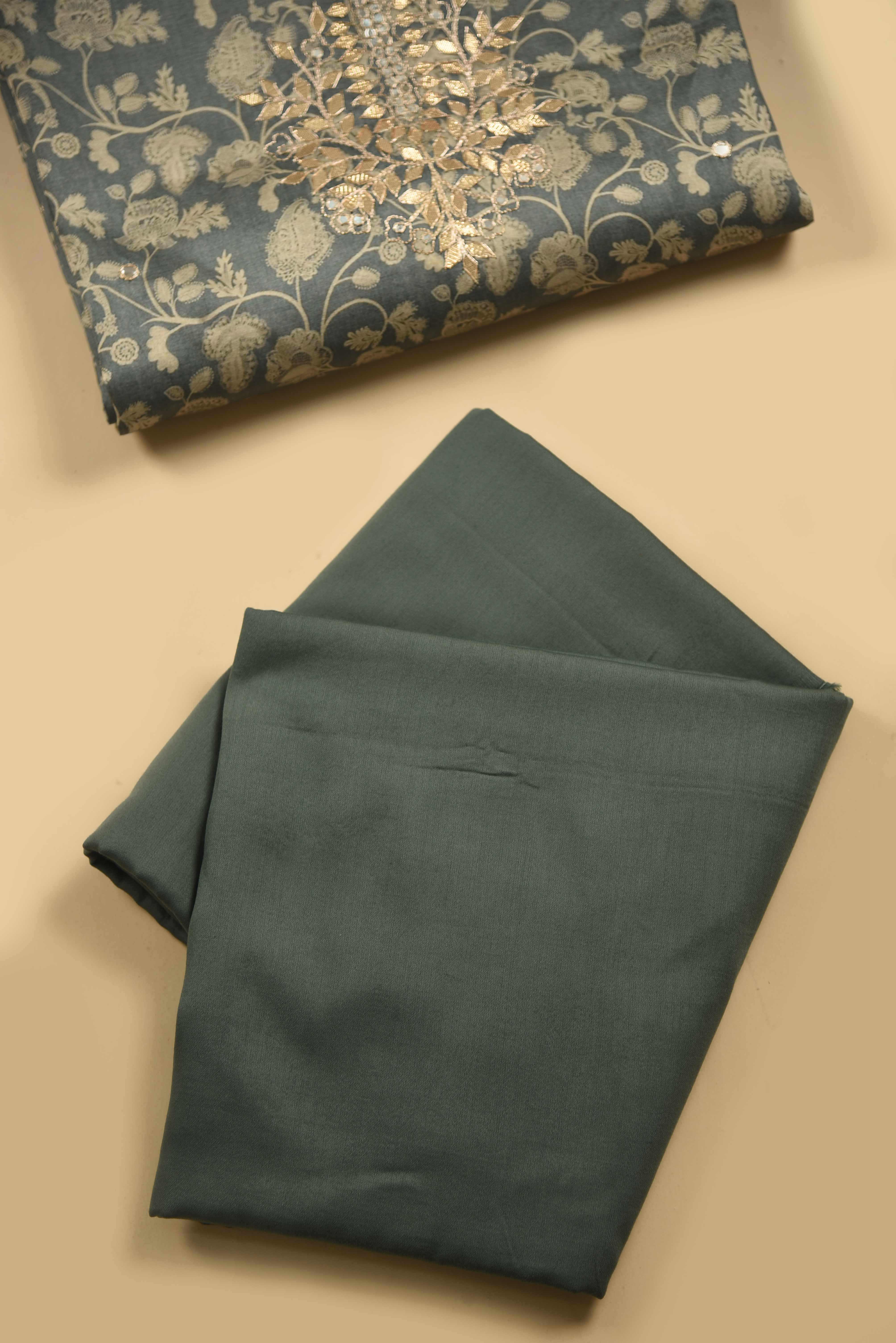 • Step into effortless elegance with our Green Chanderi Silk Blend Printed with Embroidery Unstitched Suit Fabric Set, designed to bring grace and charm to every occasion.