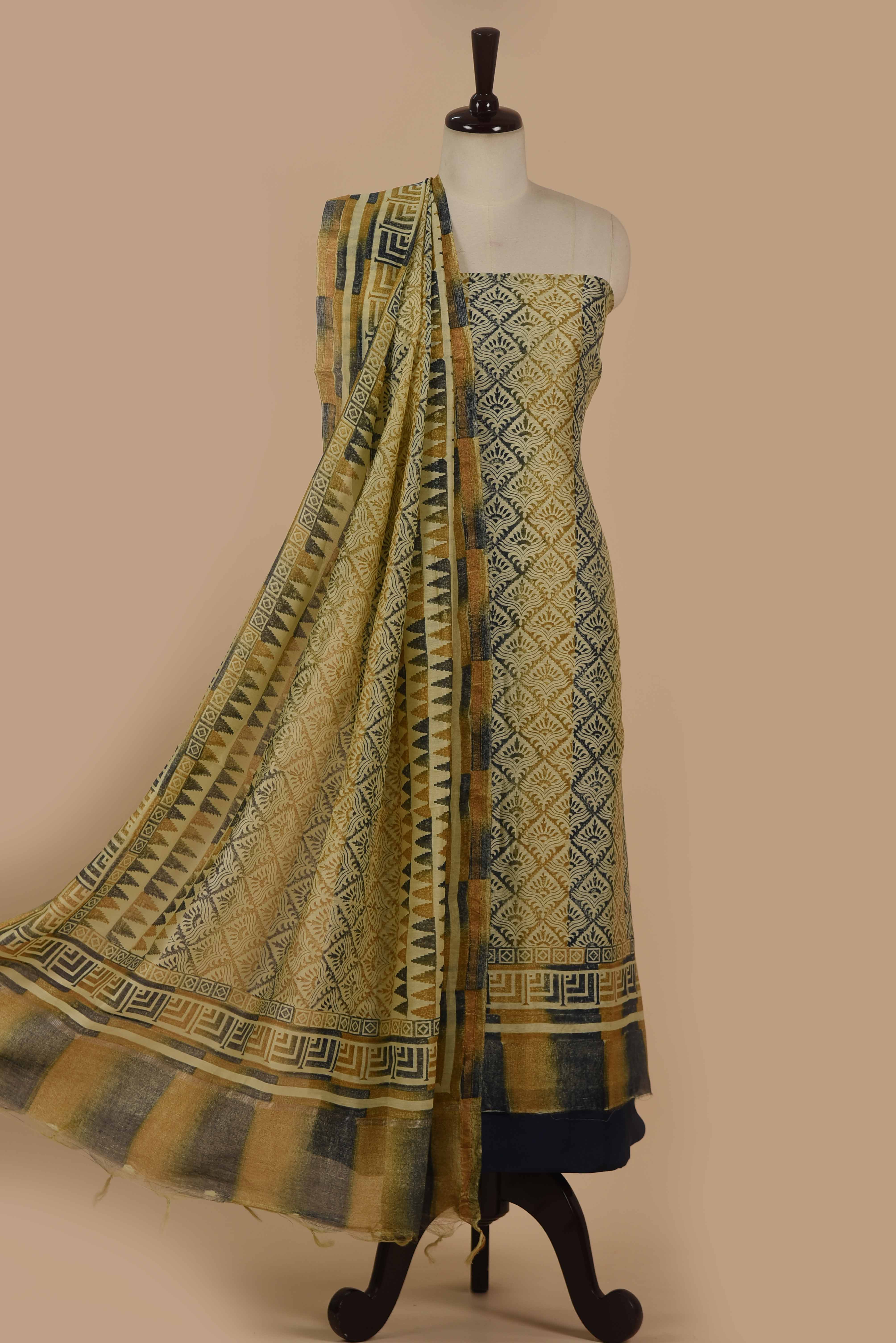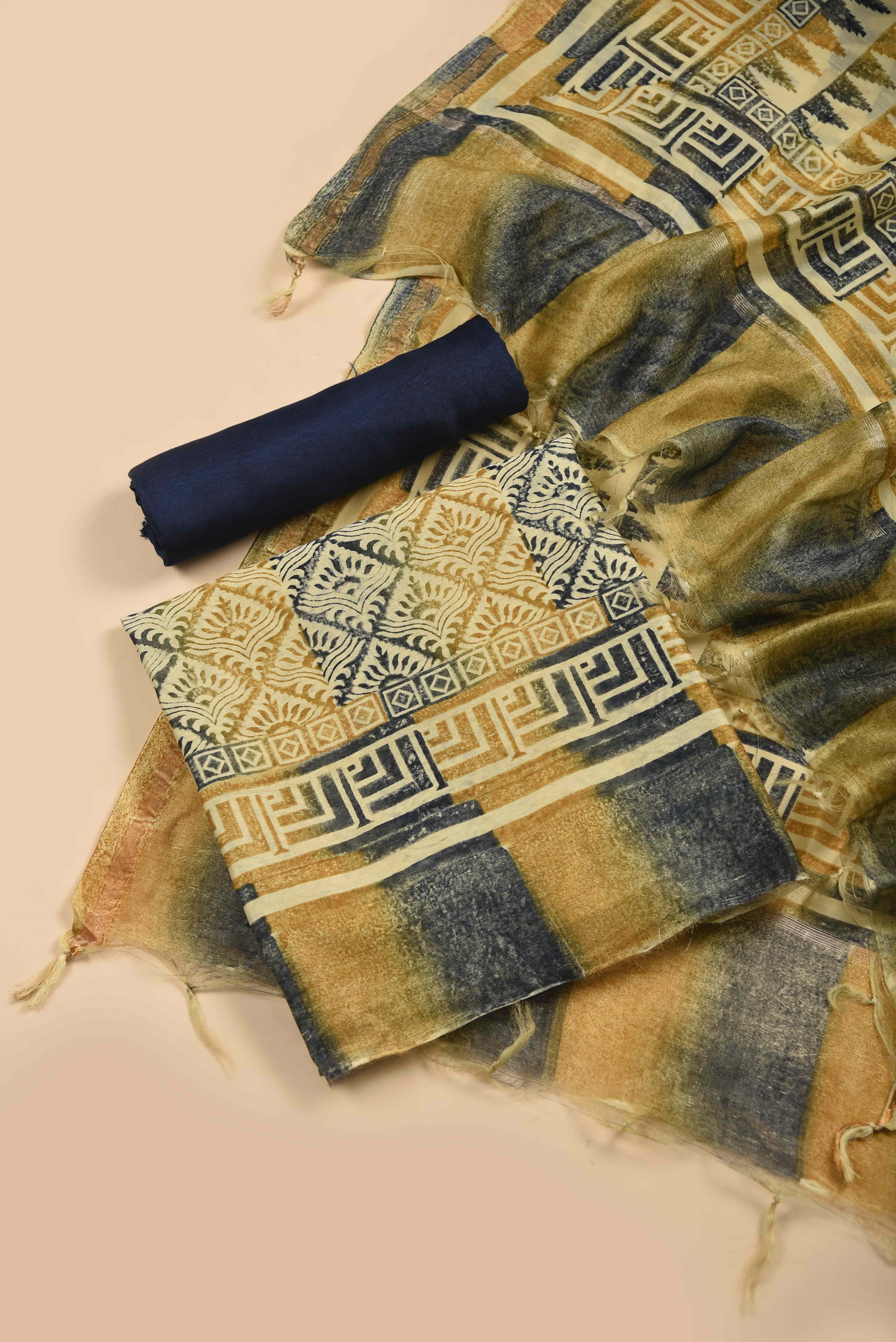 Mustard With Blue Chanderi Printed Unstitched Suit Fabric Set With Chanderi Printed Dupatta