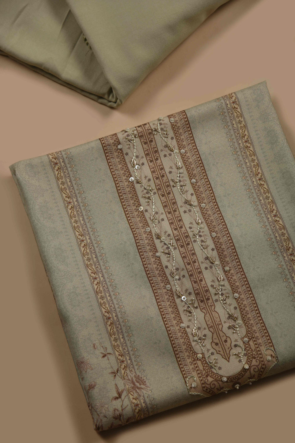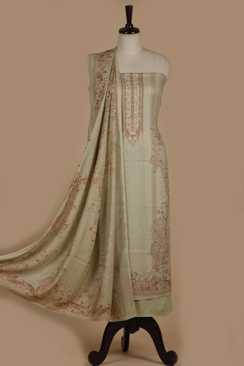 Pista Green Winter wear Wool Spun Blend Printed With Embroidered Unstitched Suit Fabric Set With Wool Spun Blend Dupatta