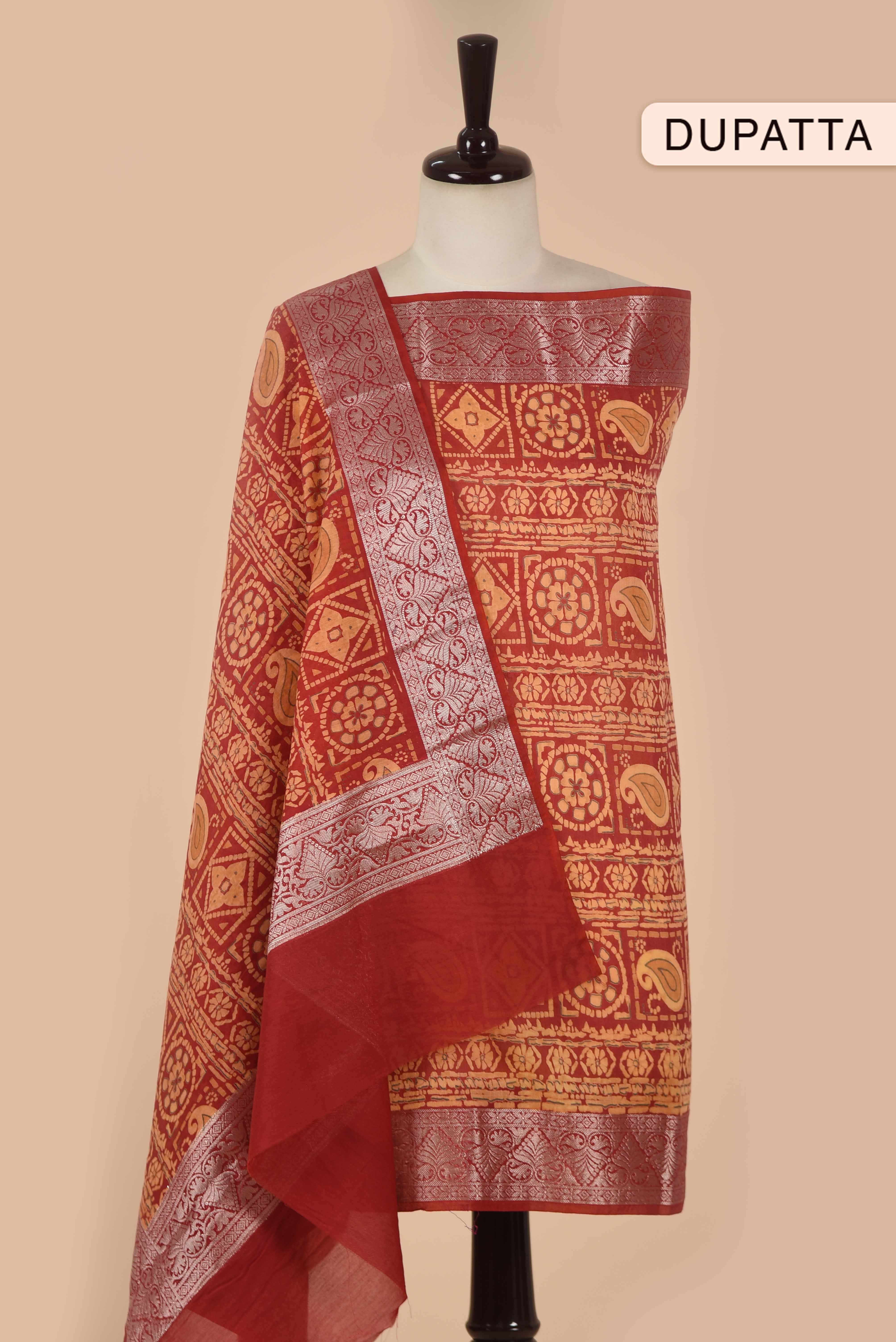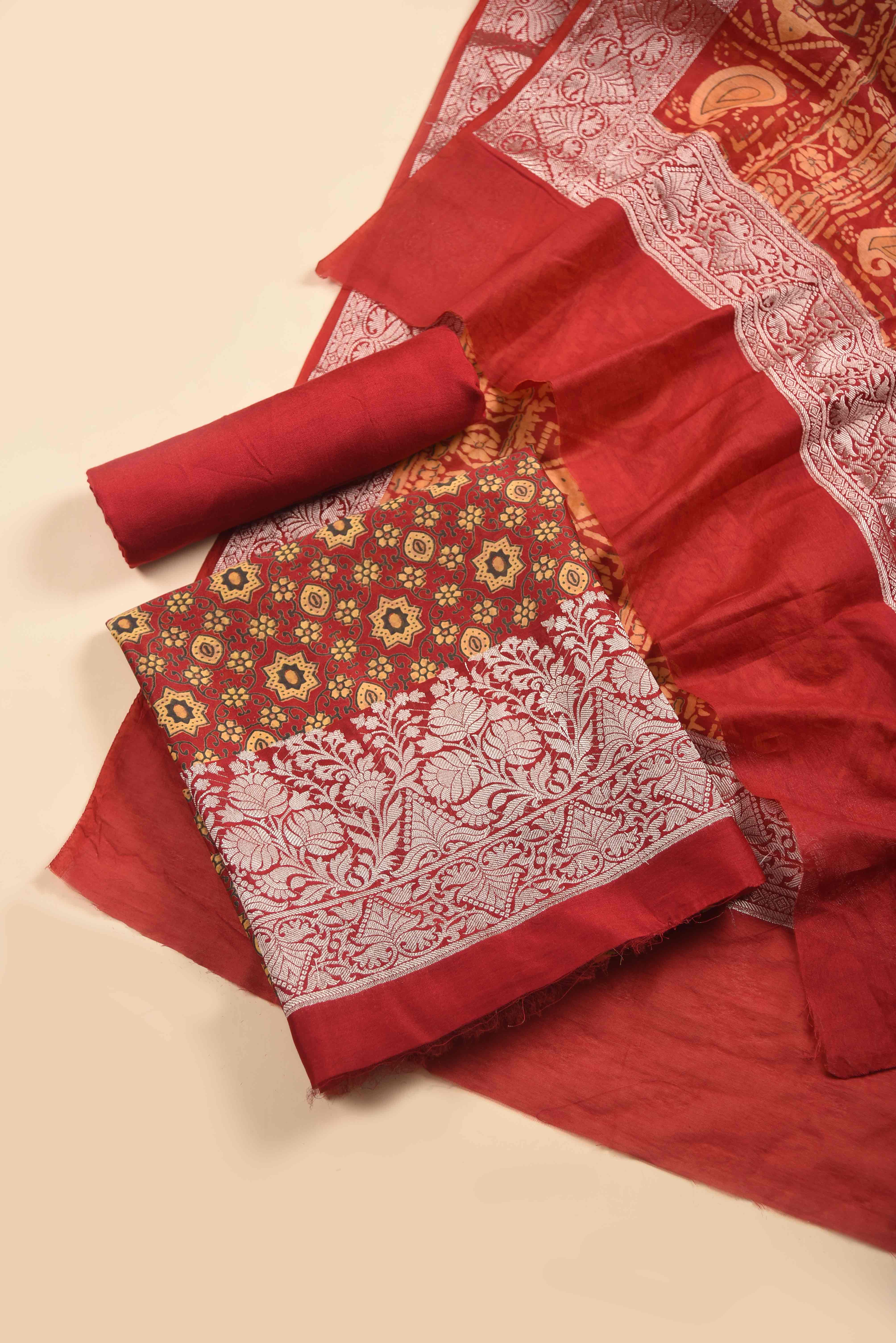 Red Chanderi Silk Printed With Woven Unstitched Suit Fabric Set With Chanderi Printed Dupatta