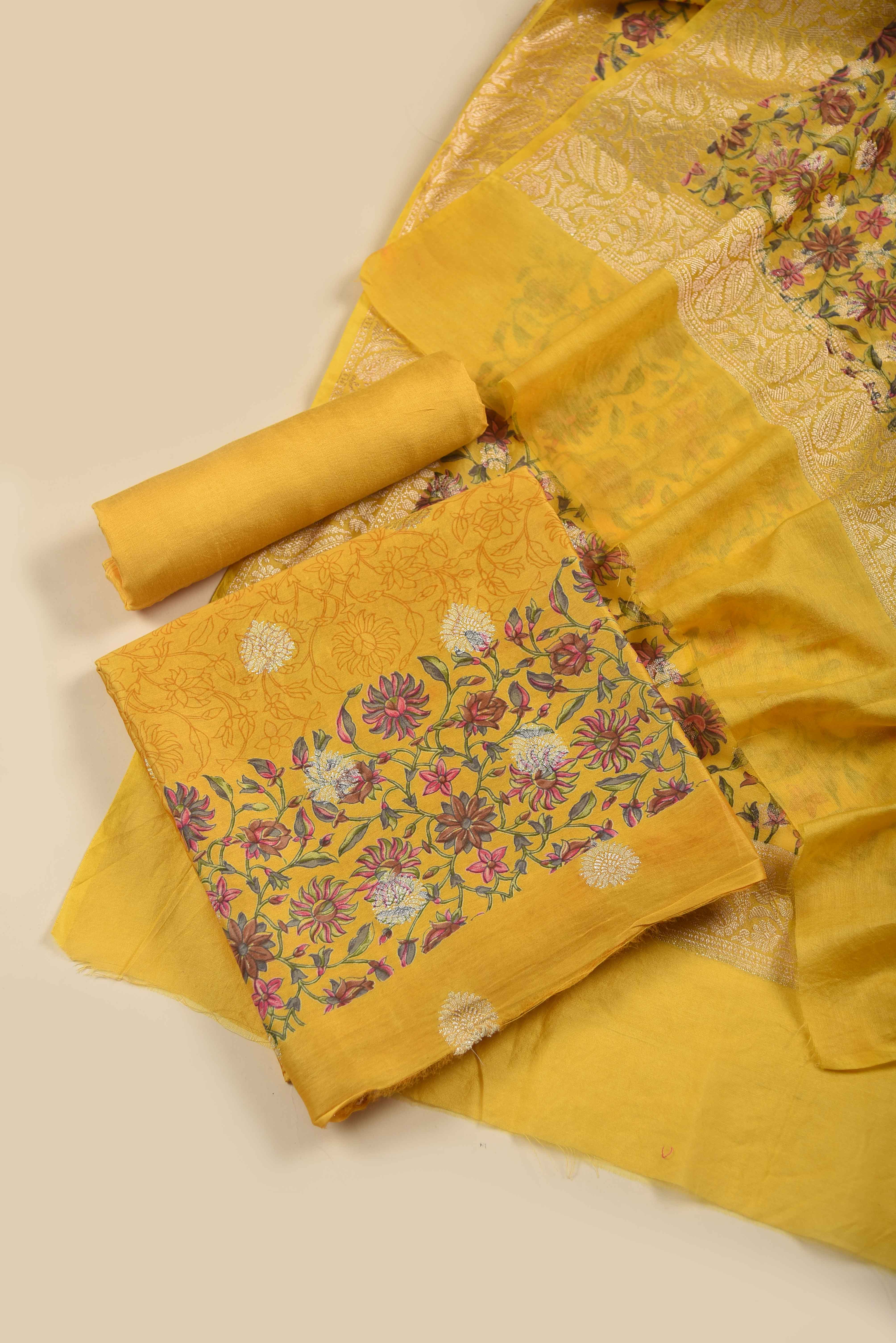 - Radiate timeless charm with our Yellow Chanderi Silk Printed & Woven Unstitched Suit Fabric Set, paired with a matching Chanderi Printed Woven Dupatta.