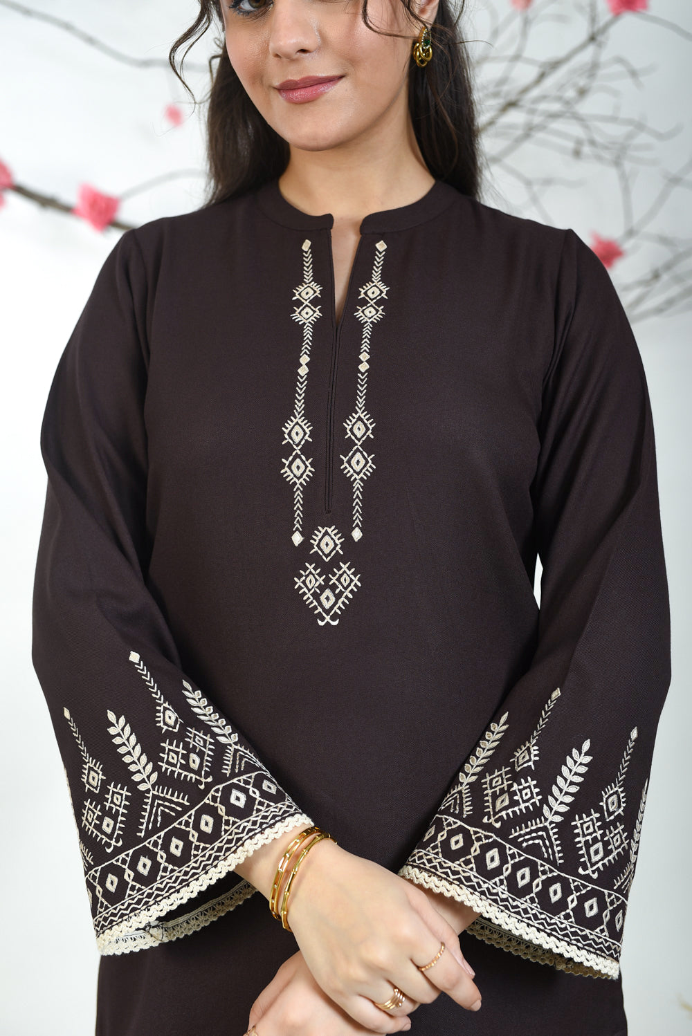 Brown Winter Wear Wool Spun Blend Tribal Embroidered Short Kurti-Regular Fit