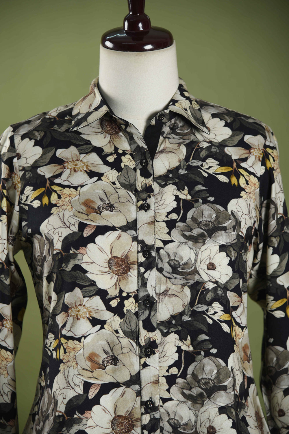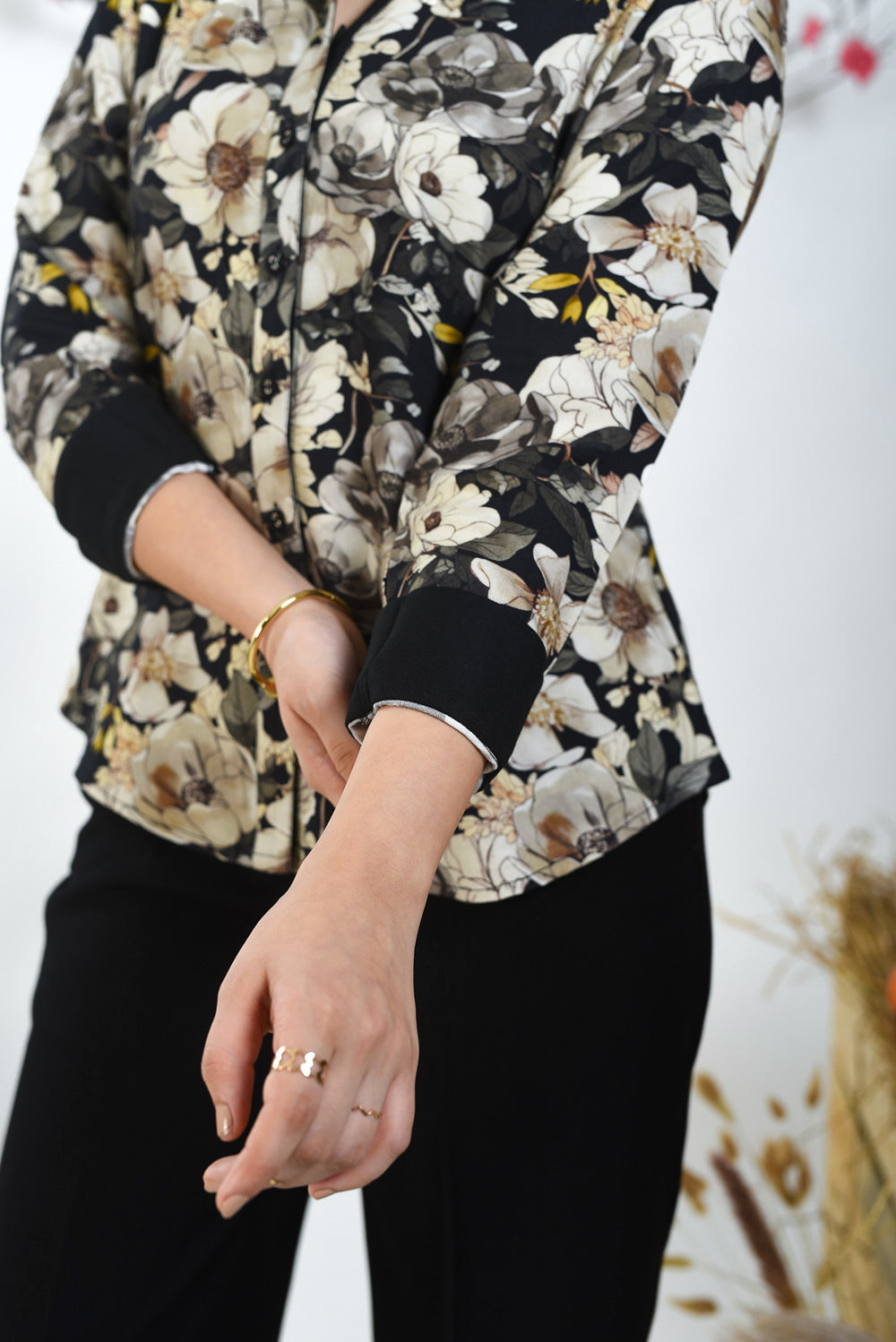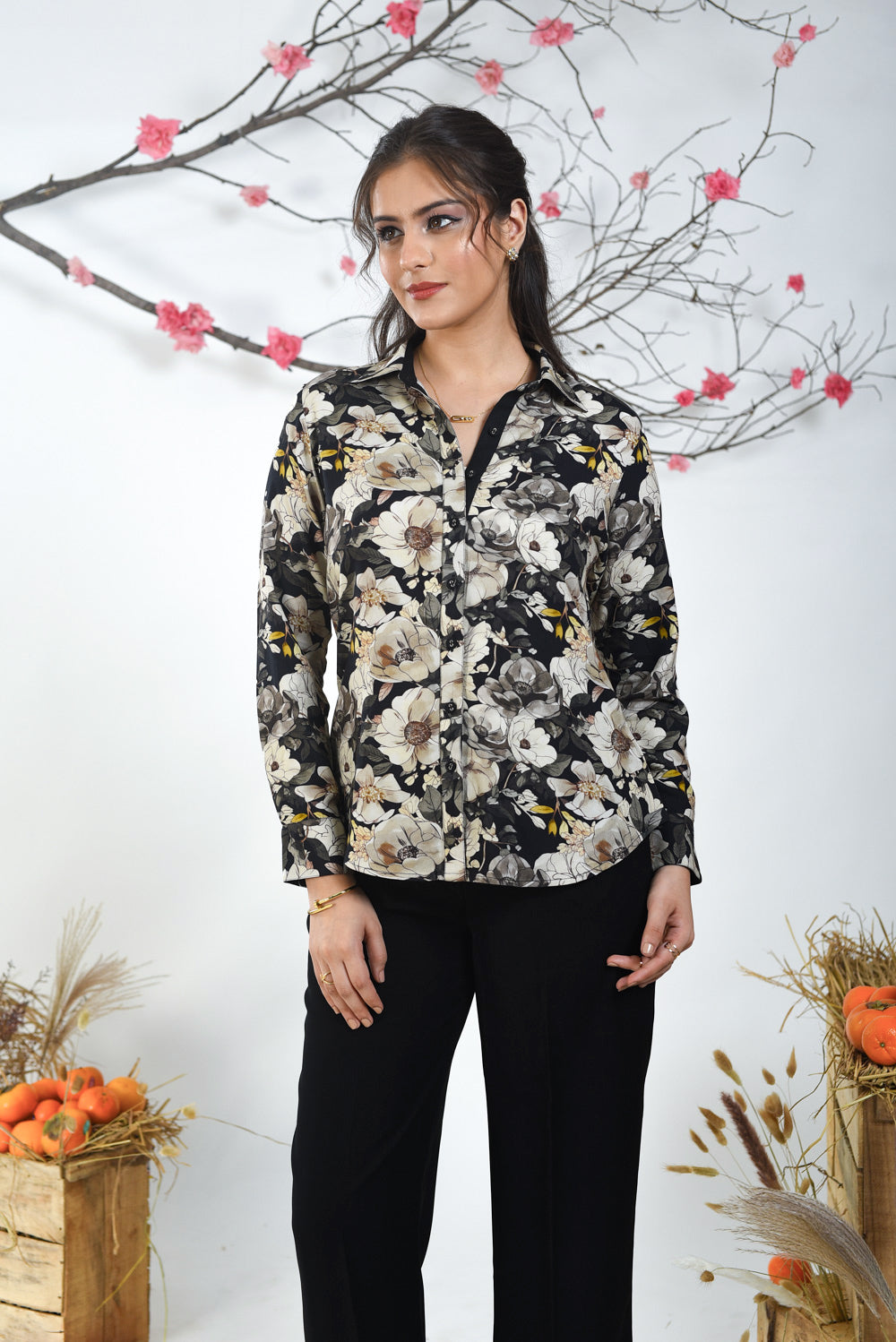 - Black Floral printed shirt in breathable winter wear wool spun fabric with a muted beige base and black detailing for a classy touch.