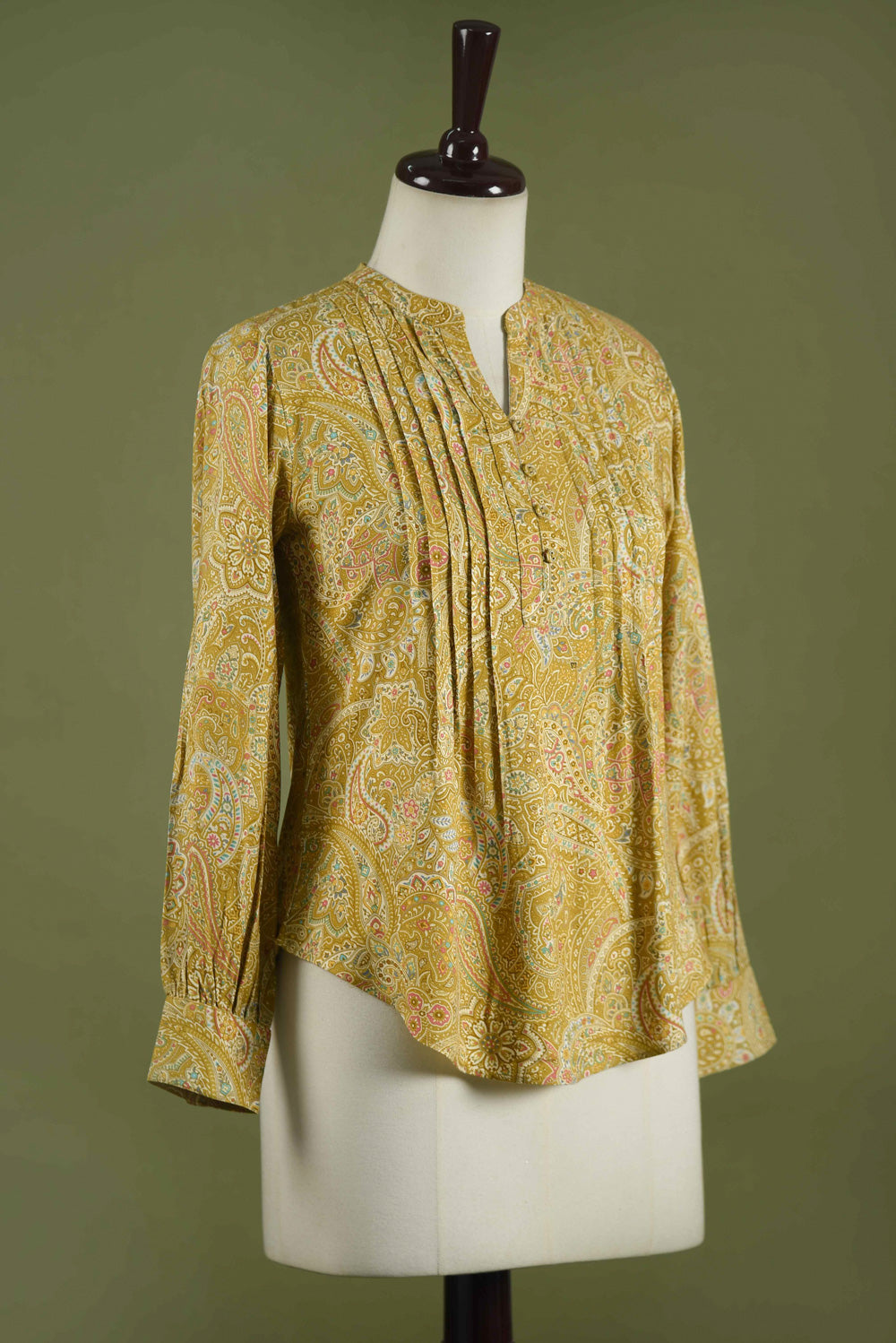 - Classy mustard printed shirt featuring delicate paisley motifs, pintuck detailing on the yoke, and long sleeves with buttoned cuffs.