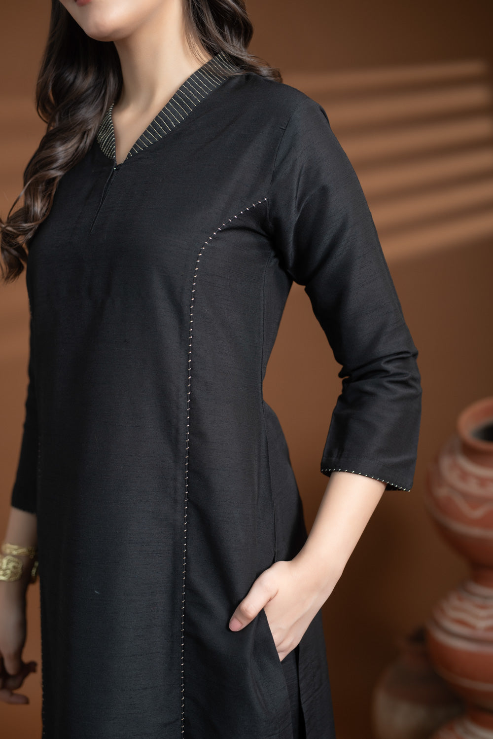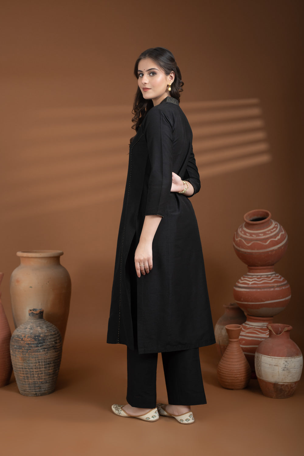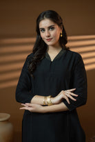 Black Cotton Silk Collared Zari Work Kurta Set – Regular Fit Celebrate elegance and tradition with this Black Kurta Set from the Noor Collection.