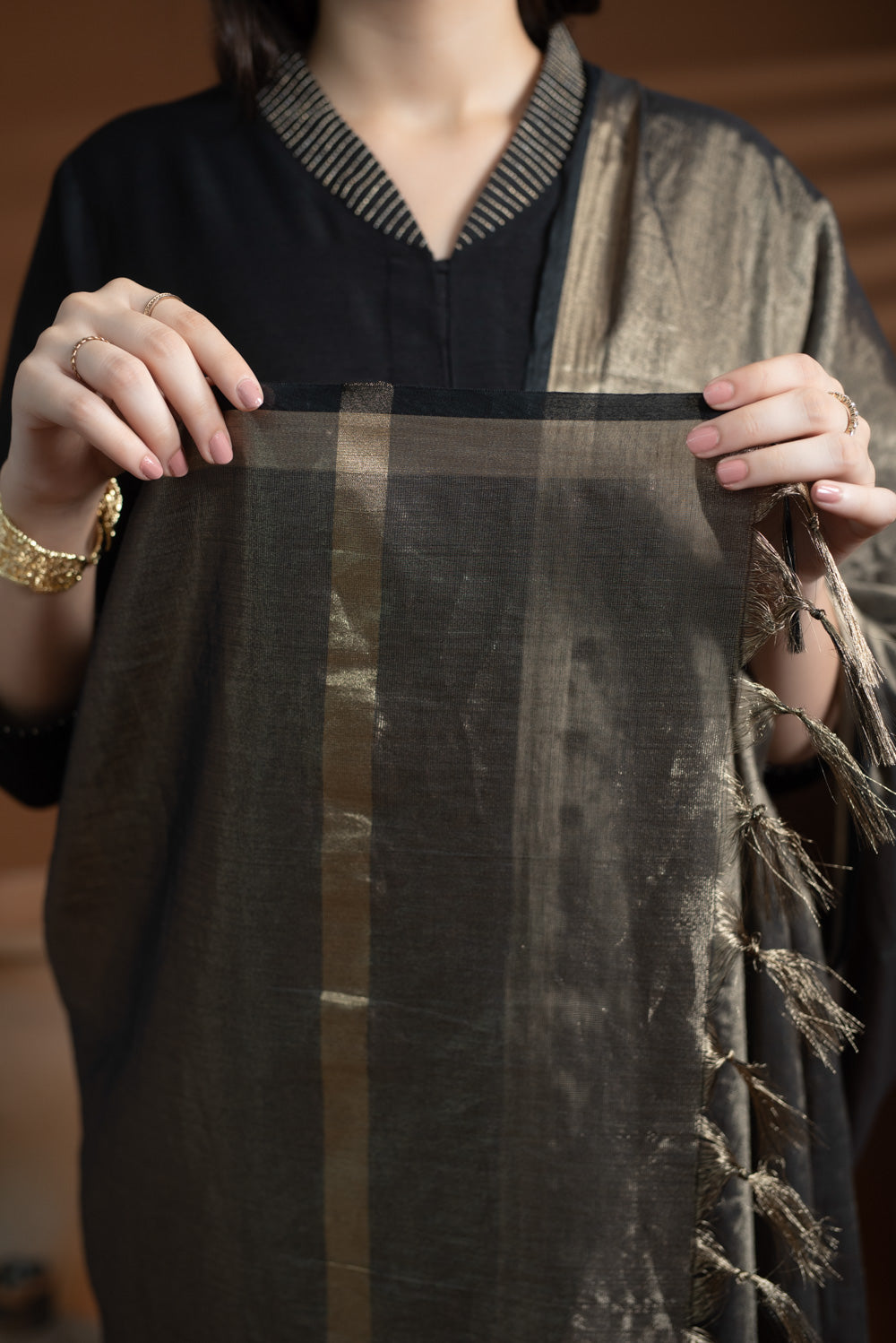 Adorned with delicate zari work, the kurta exudes subtle shimmer and refined sophistication.