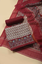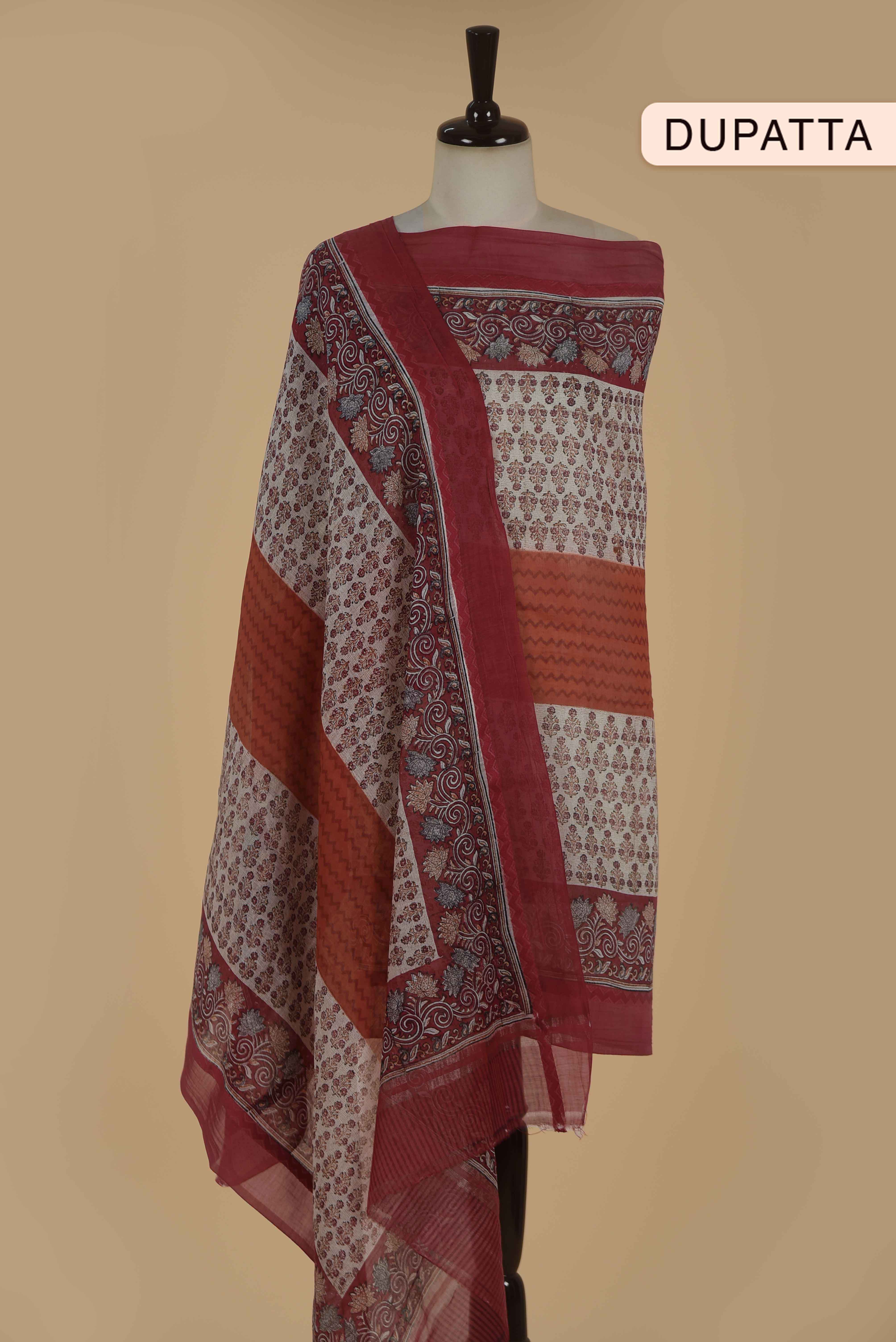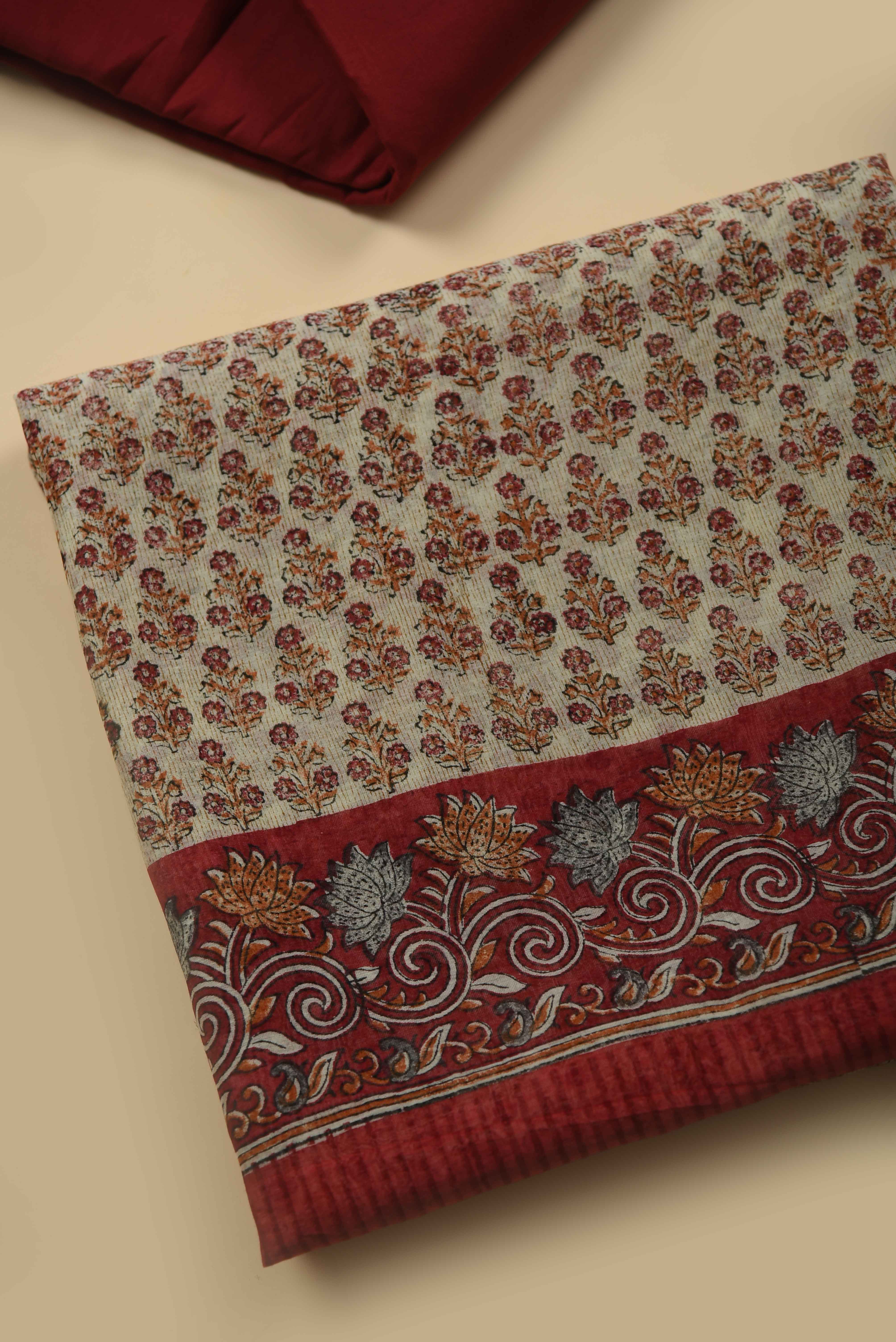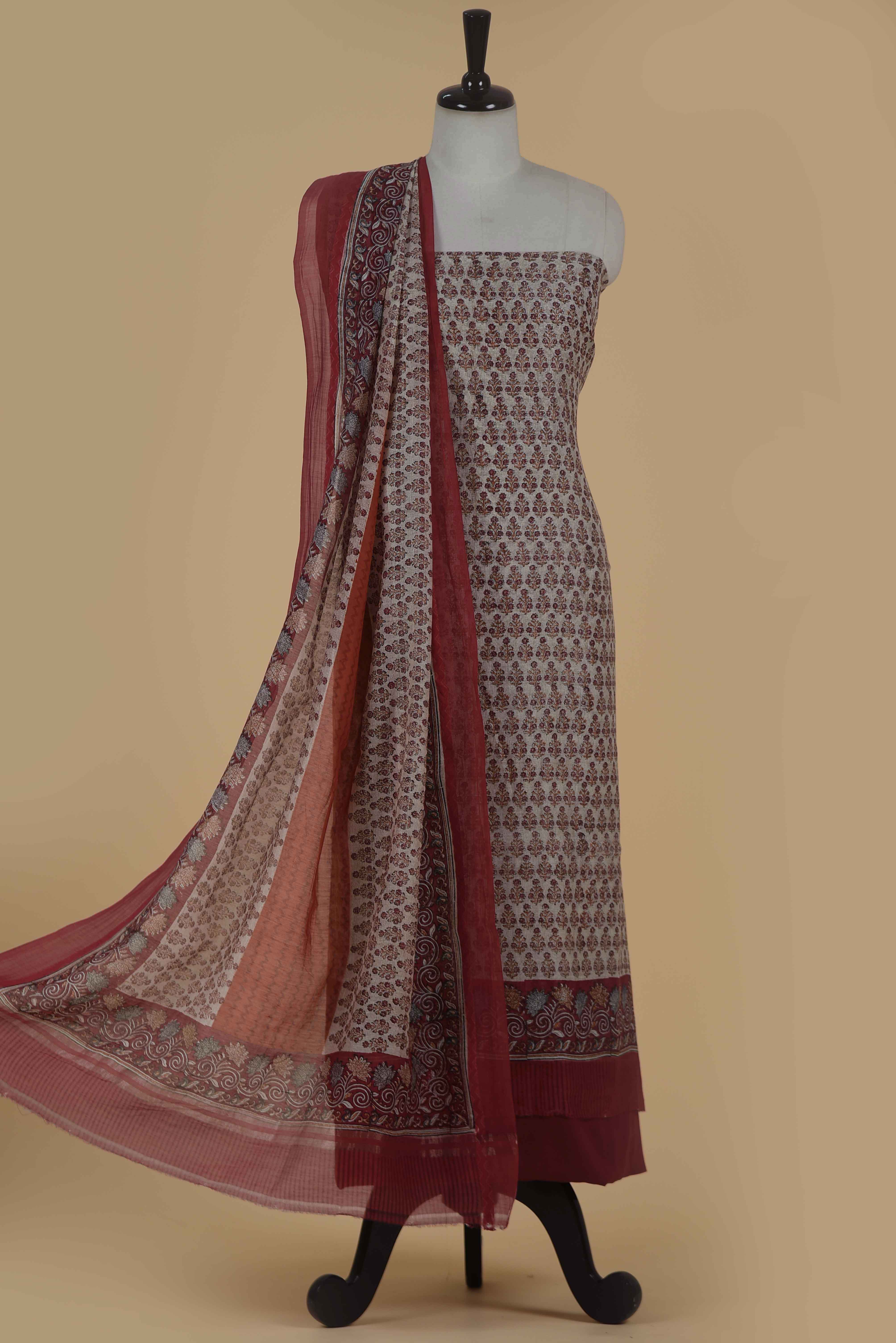 Beige With Maroon Chanderi Blend Printed Unstitched Suit Fabric Set With Chanderi Blend Printed Dupatta