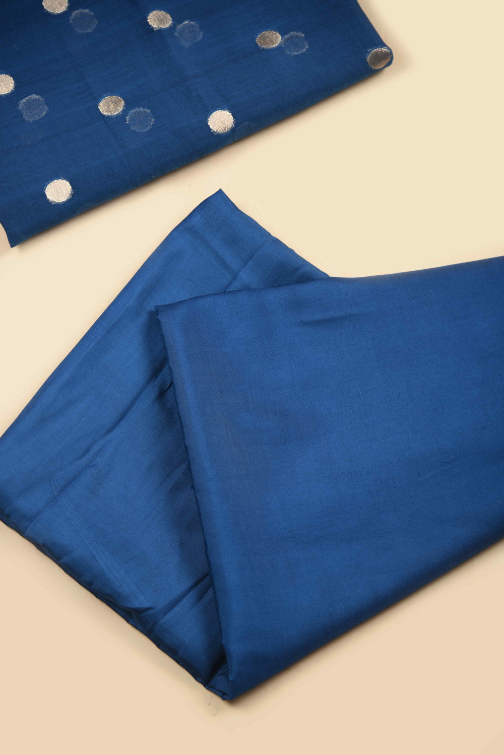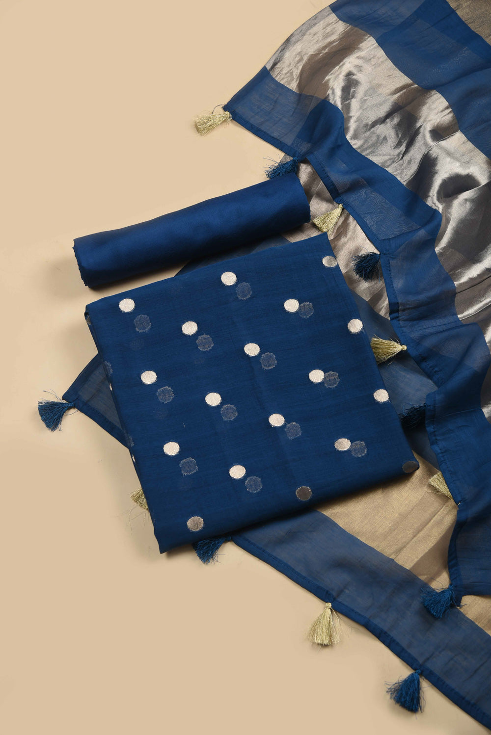 • Elevate your festive wardrobe with this exquisite Blue Chanderi Silk Blend Unstitched Suit Fabric Set.