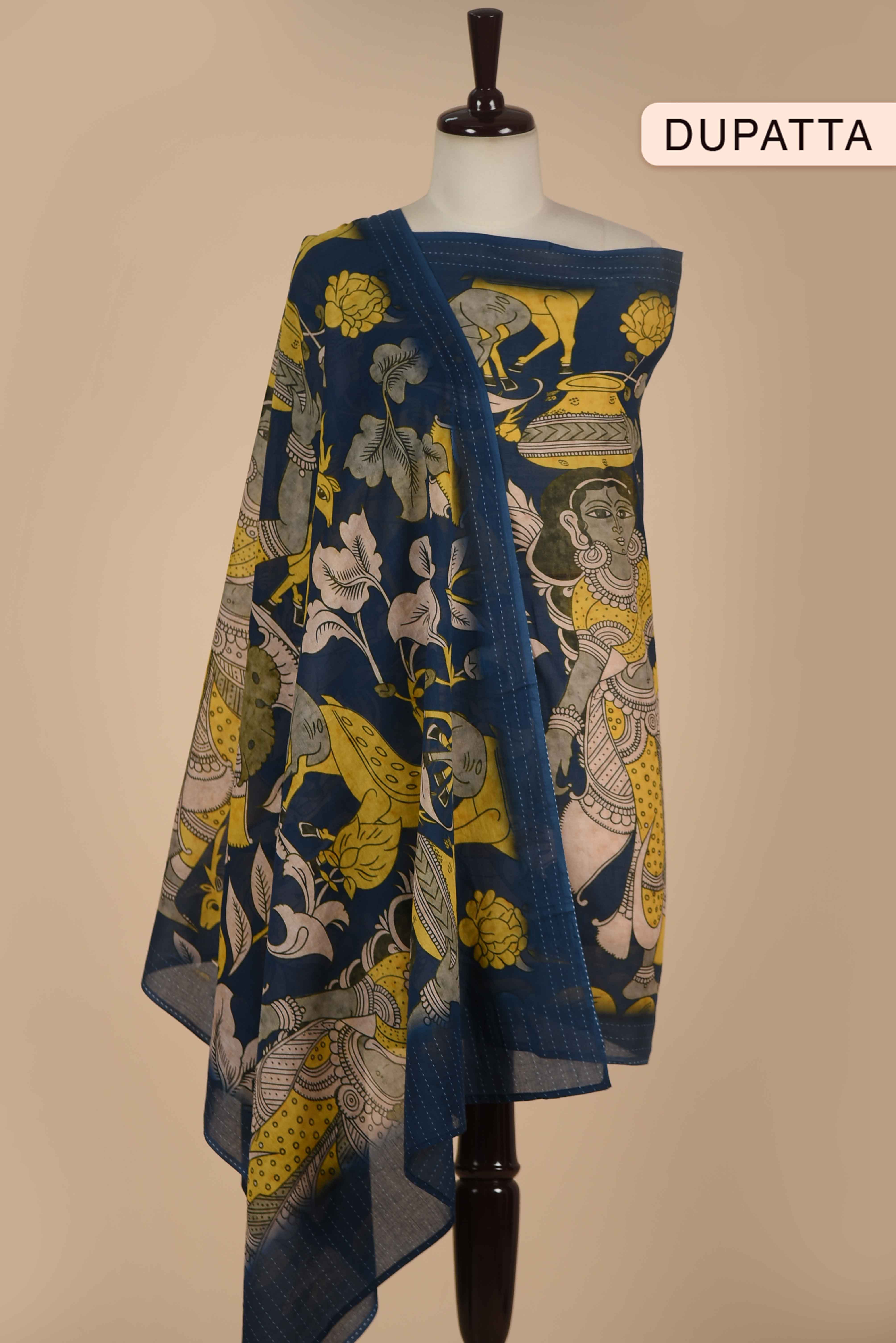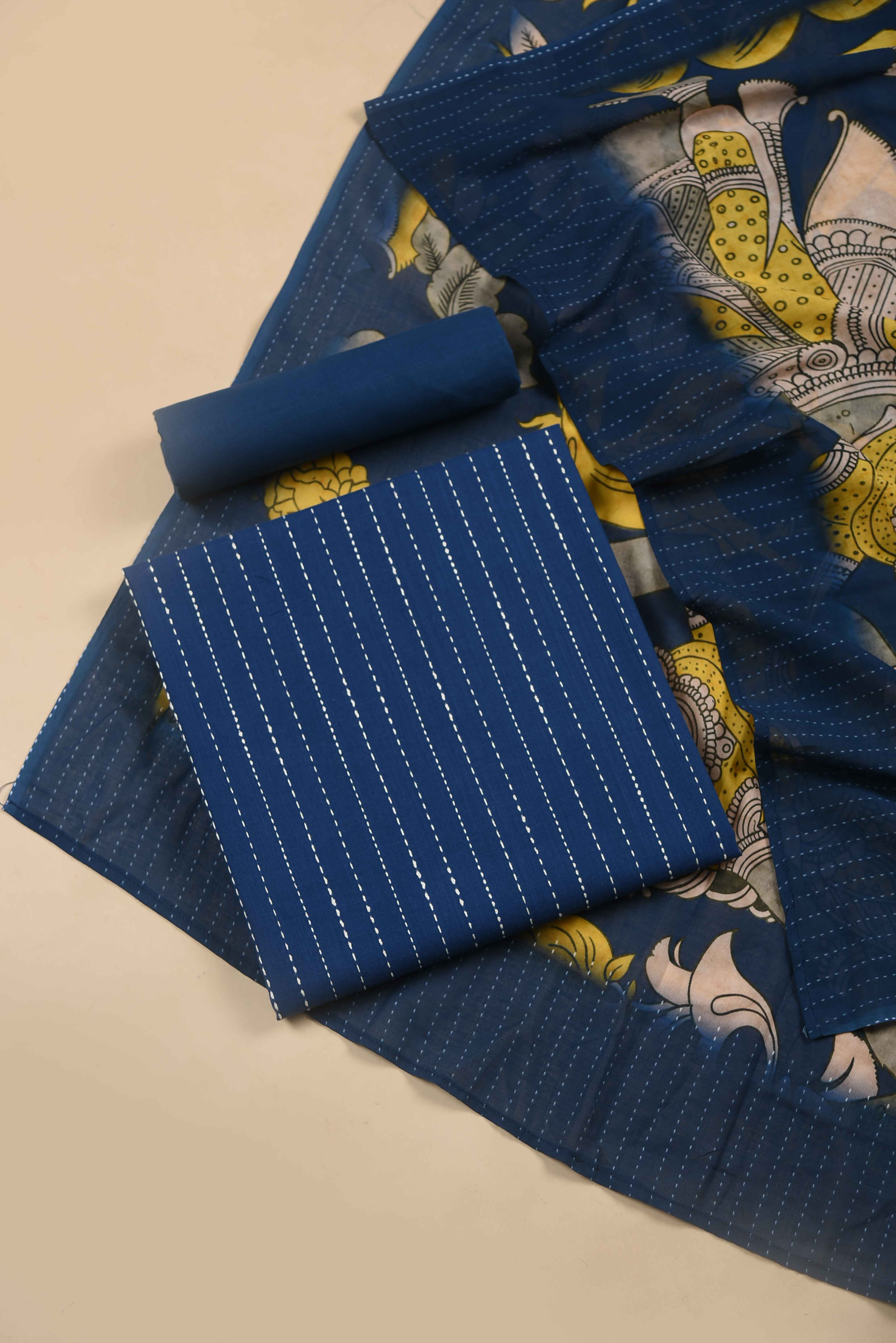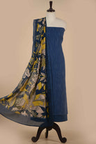 Blue Cotton Embroidered Unstitched Suit Fabric Set With Cotton Printed Dupatta