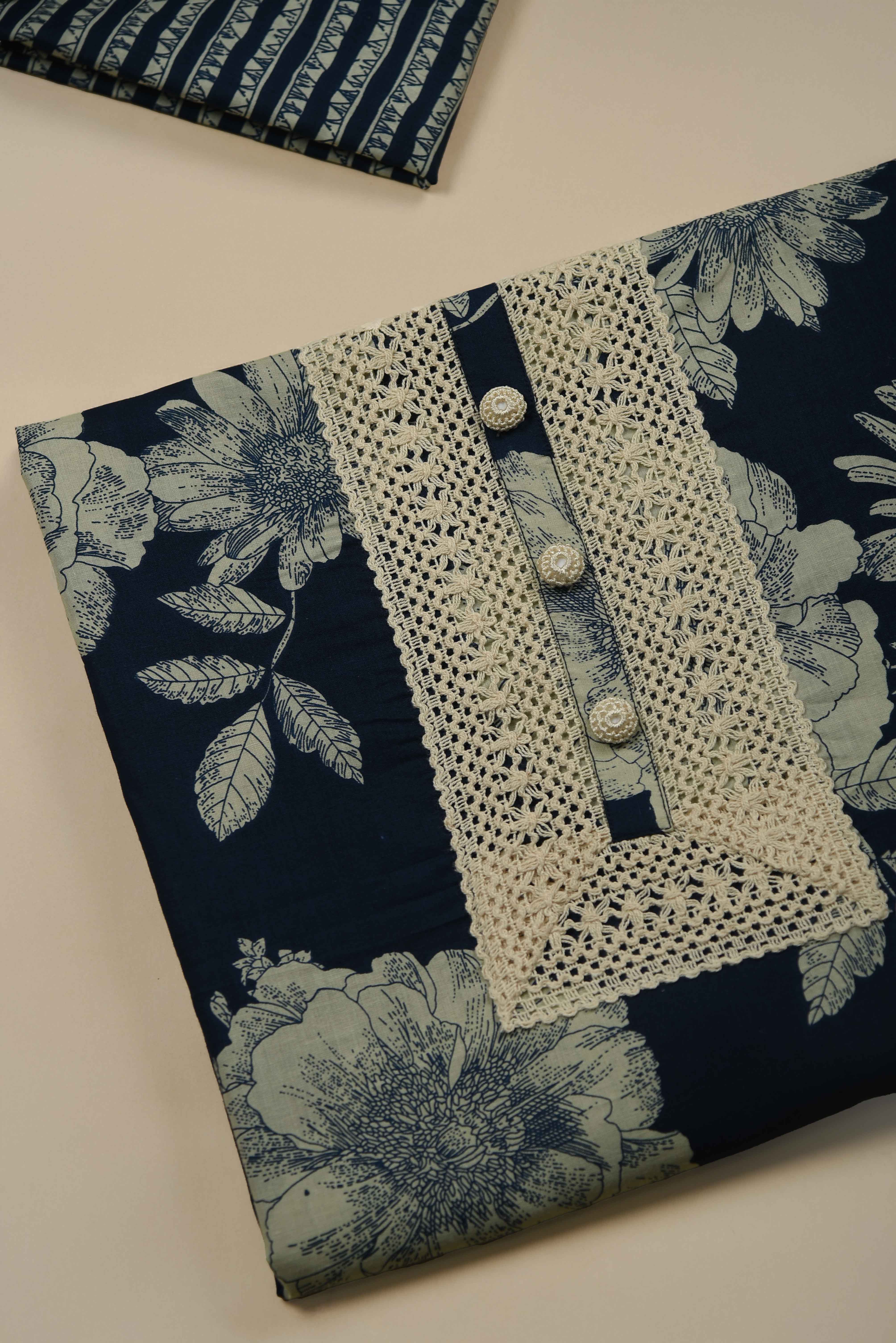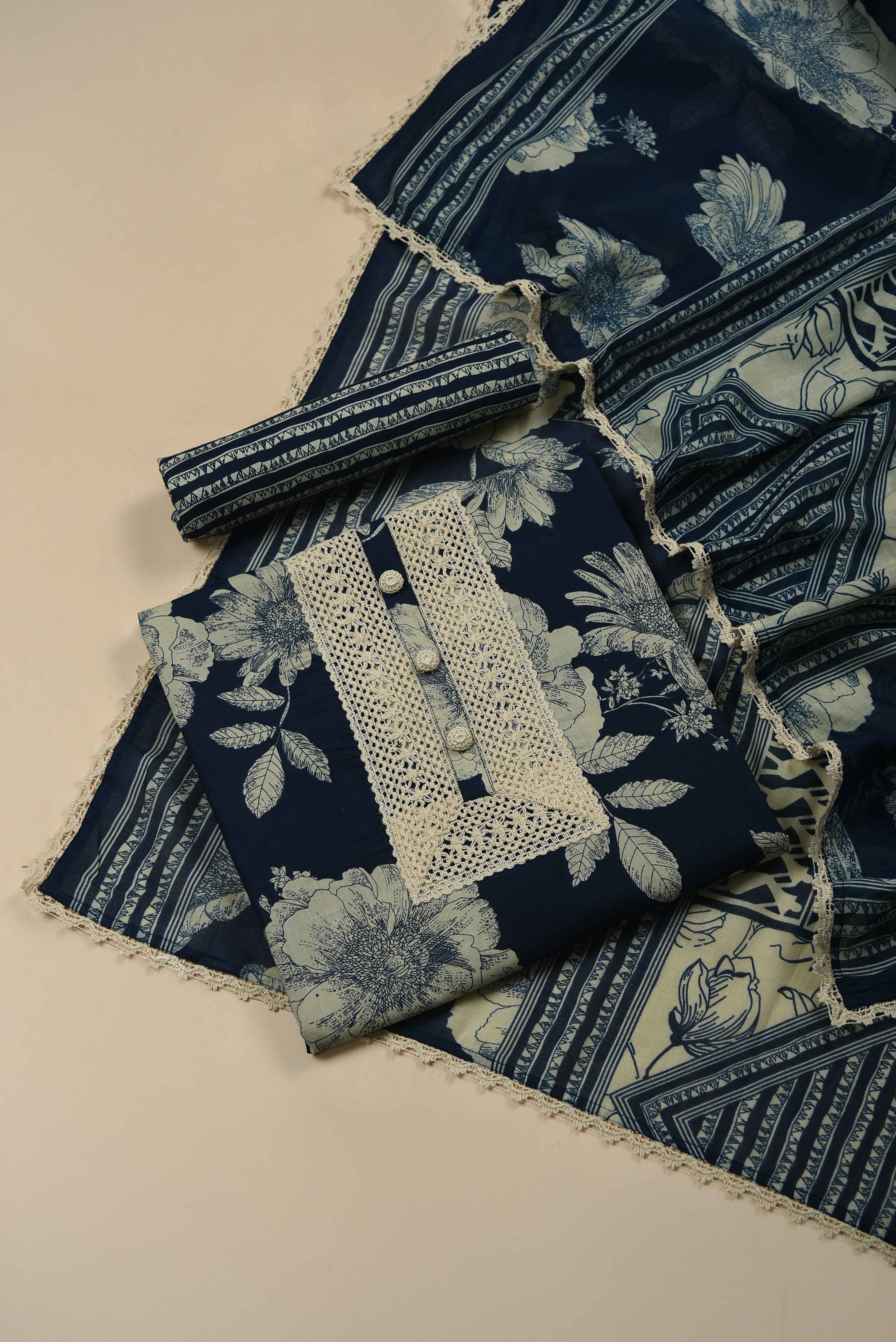 Experience refined elegance with this Blue pure cotton unstitched suit fabric set, a premium choice for those who appreciate quality and craftsmanship.