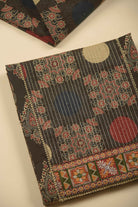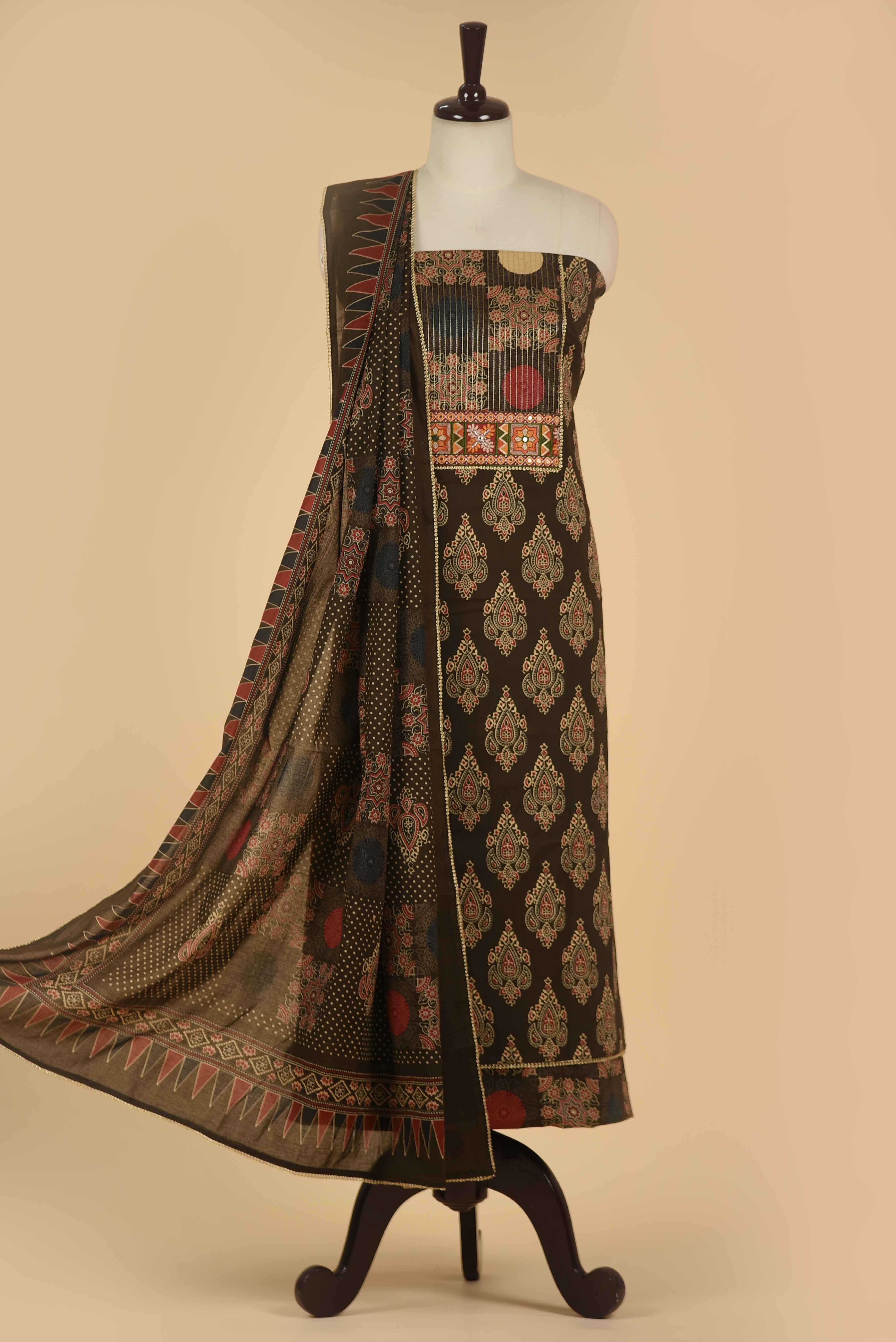 Celebrate artisanal craftsmanship with this exquisite Brown pure cotton suit fabric set, featuring authentic hand block printing combined with intricate embroidery and shimmering mirror work.
