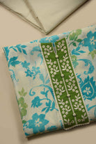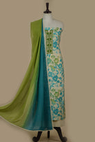 Cream With Green Muslin Silk Blend Printed With Embroidery Unstitched Suit Fabric Set With Muslin Ombre Dupatta