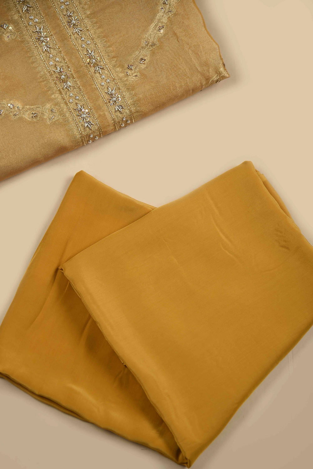 • Transform your festive wardrobe with this magnificent Golden Tissue Silk suit set, expertly crafted for those who appreciate refined luxury.