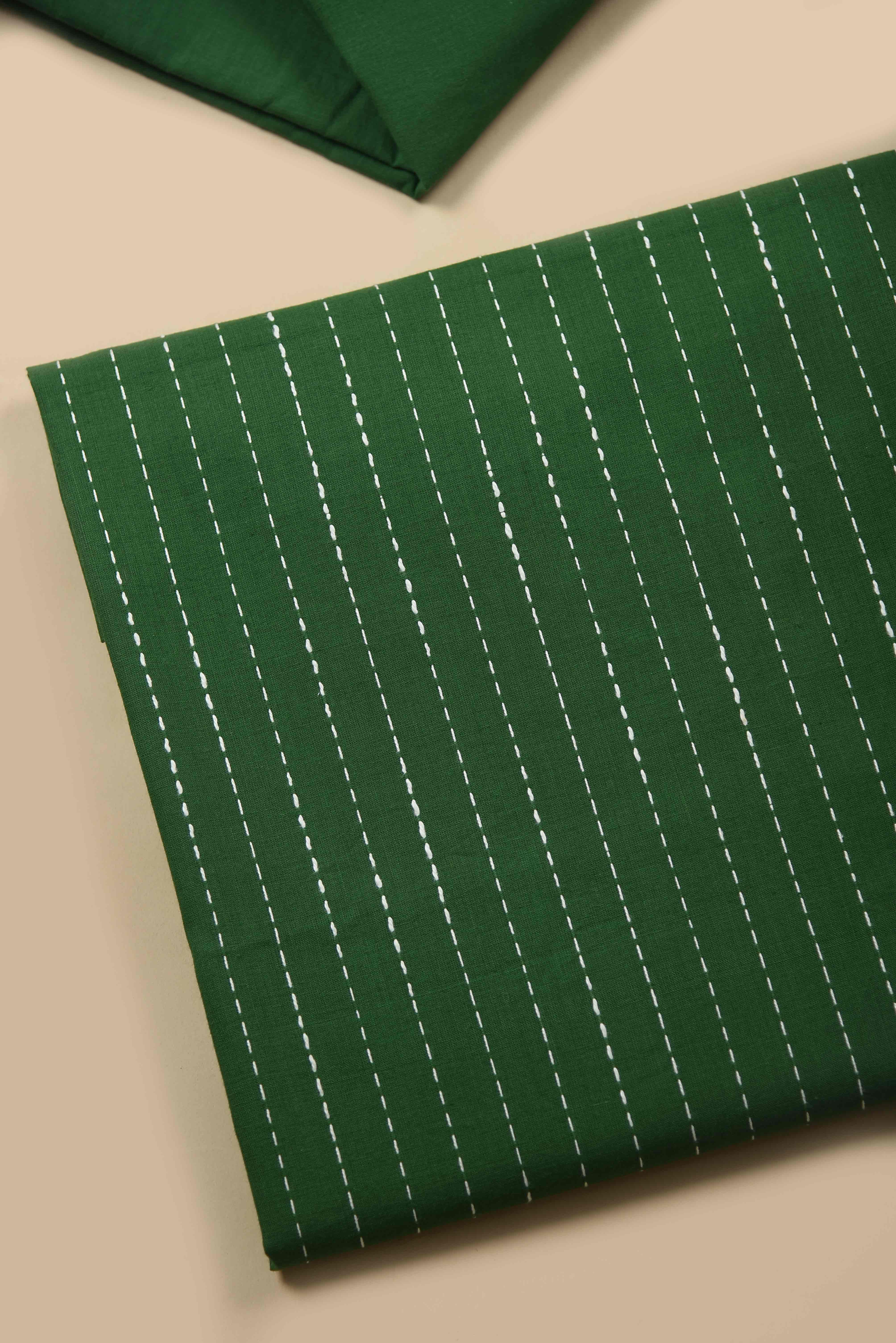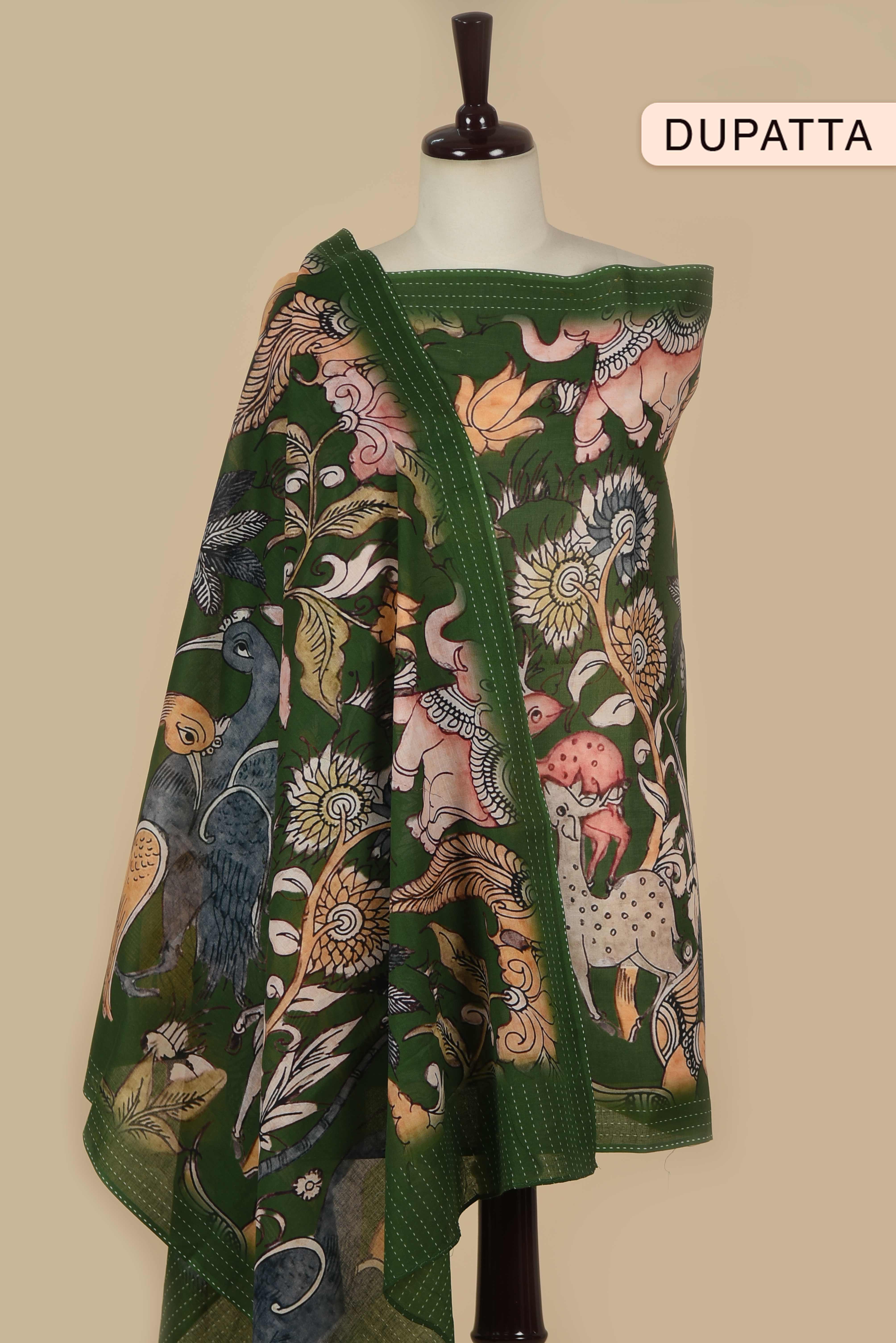 Green Cotton Embroidered Unstitched Suit Fabric Set With Cotton Printed Dupatta