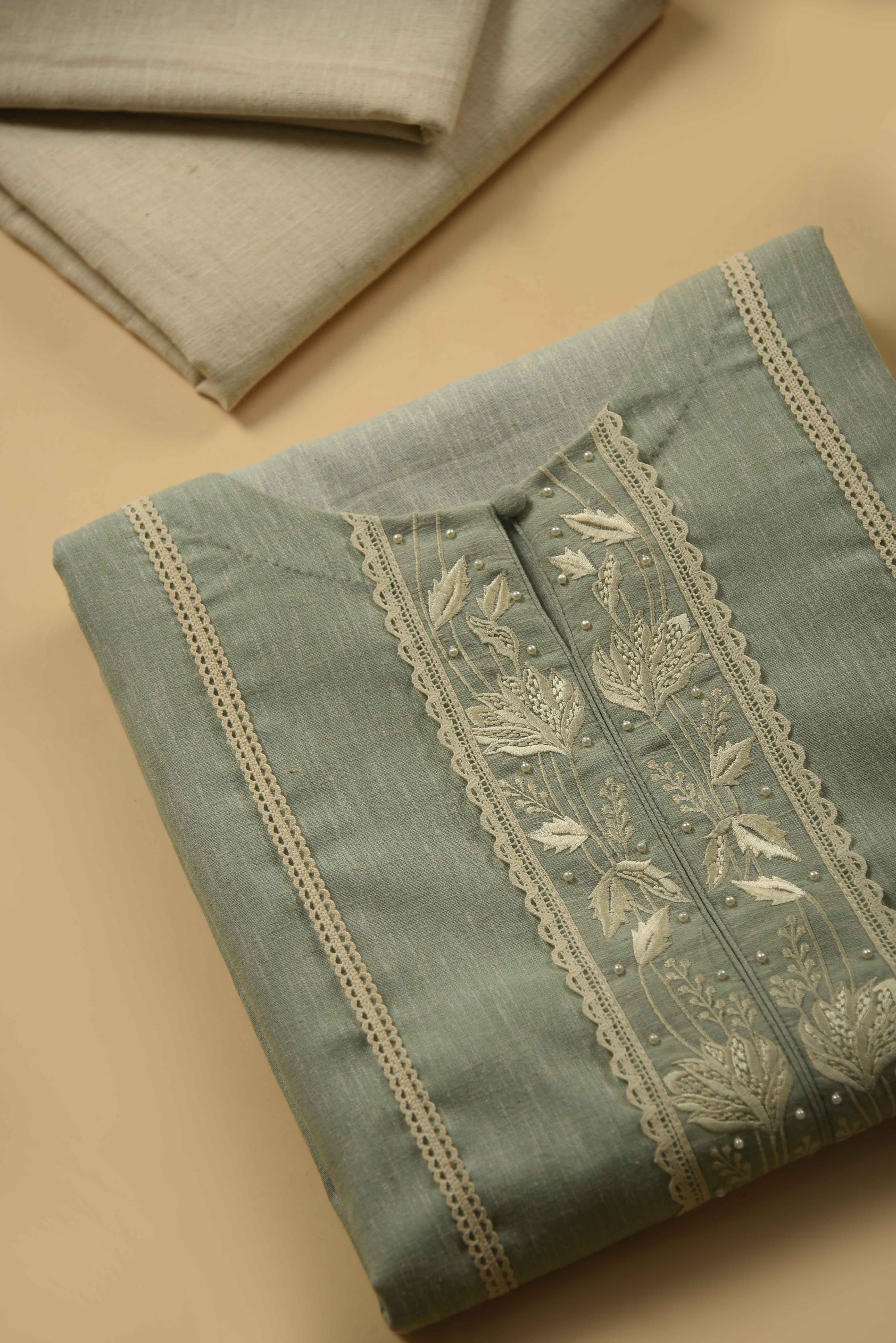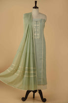 Green Linen Embroidery Unstitched Suit Fabric Set With Kota Embroidery Dupatta