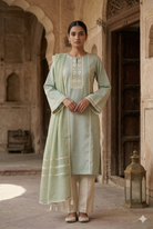 Made for women who care as much about fit as they do about fabric, this green embroidered features delicate lacework suit and a Kota dupatta finished with subtle lace accents is designed for effortless, polished dressing.