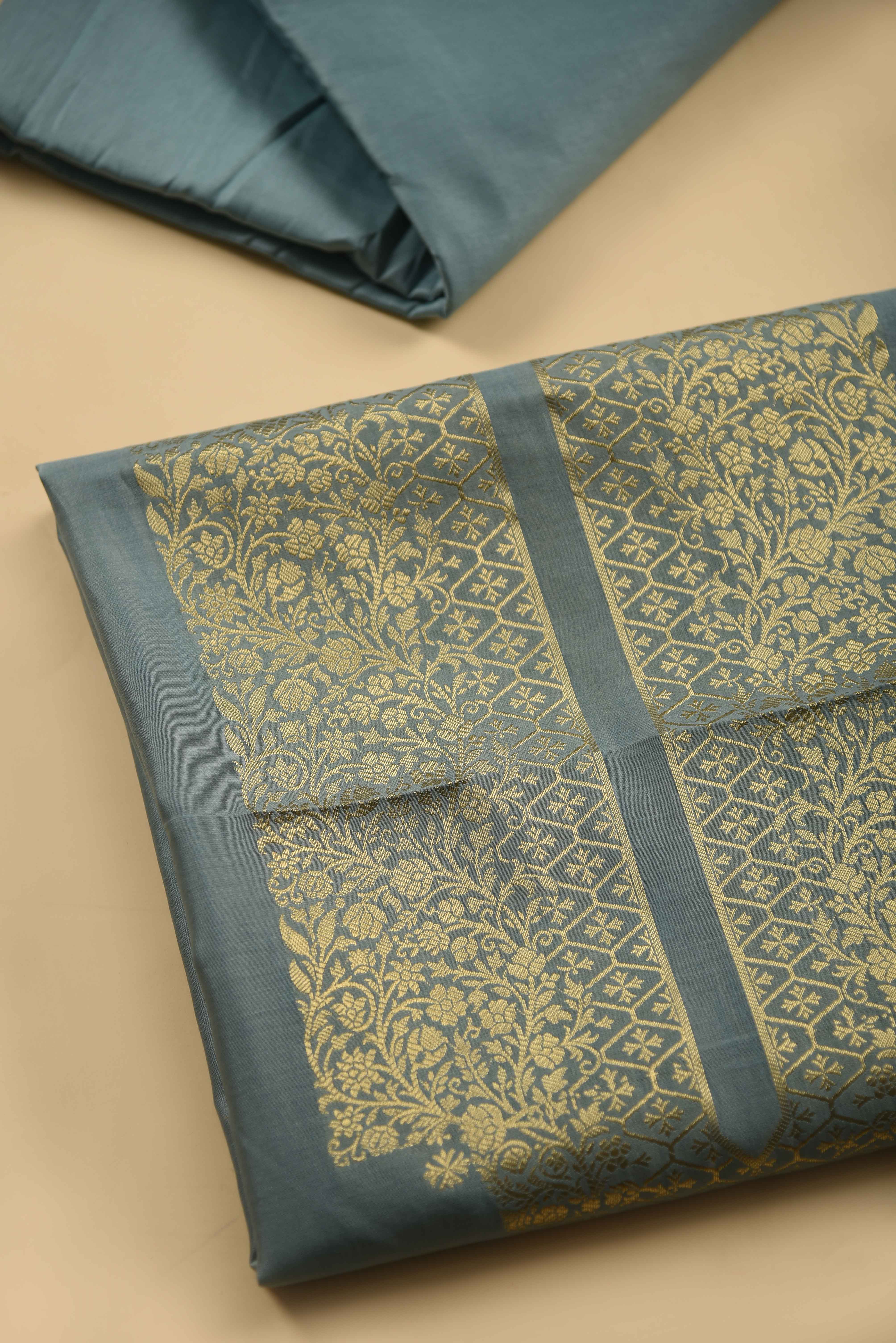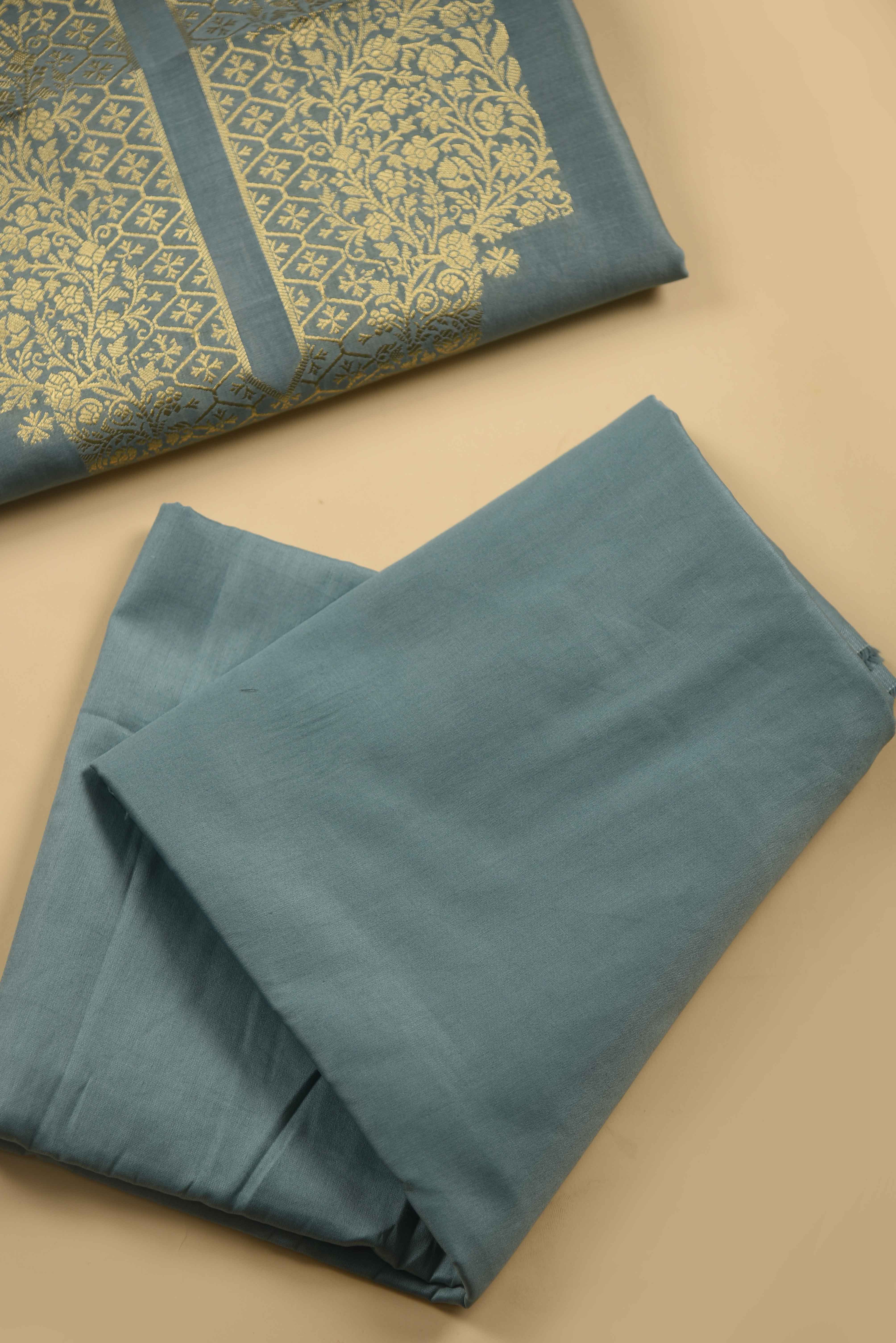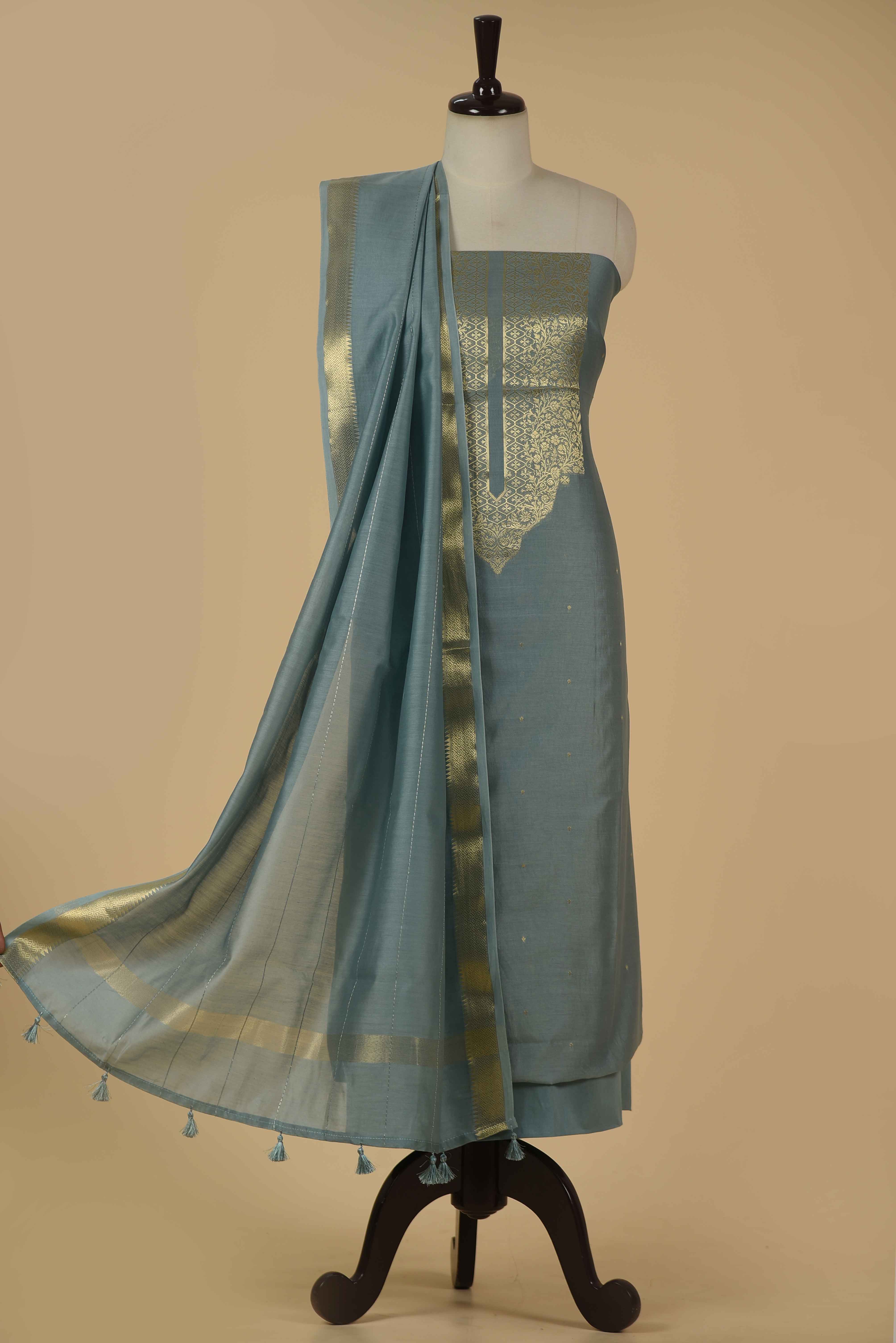 - Elevate your ethnic wardrobe with this Light Blue Chanderi Silk Woven Unstitched Suit Fabric Set, designed to offer a perfect blend of elegance and comfort.