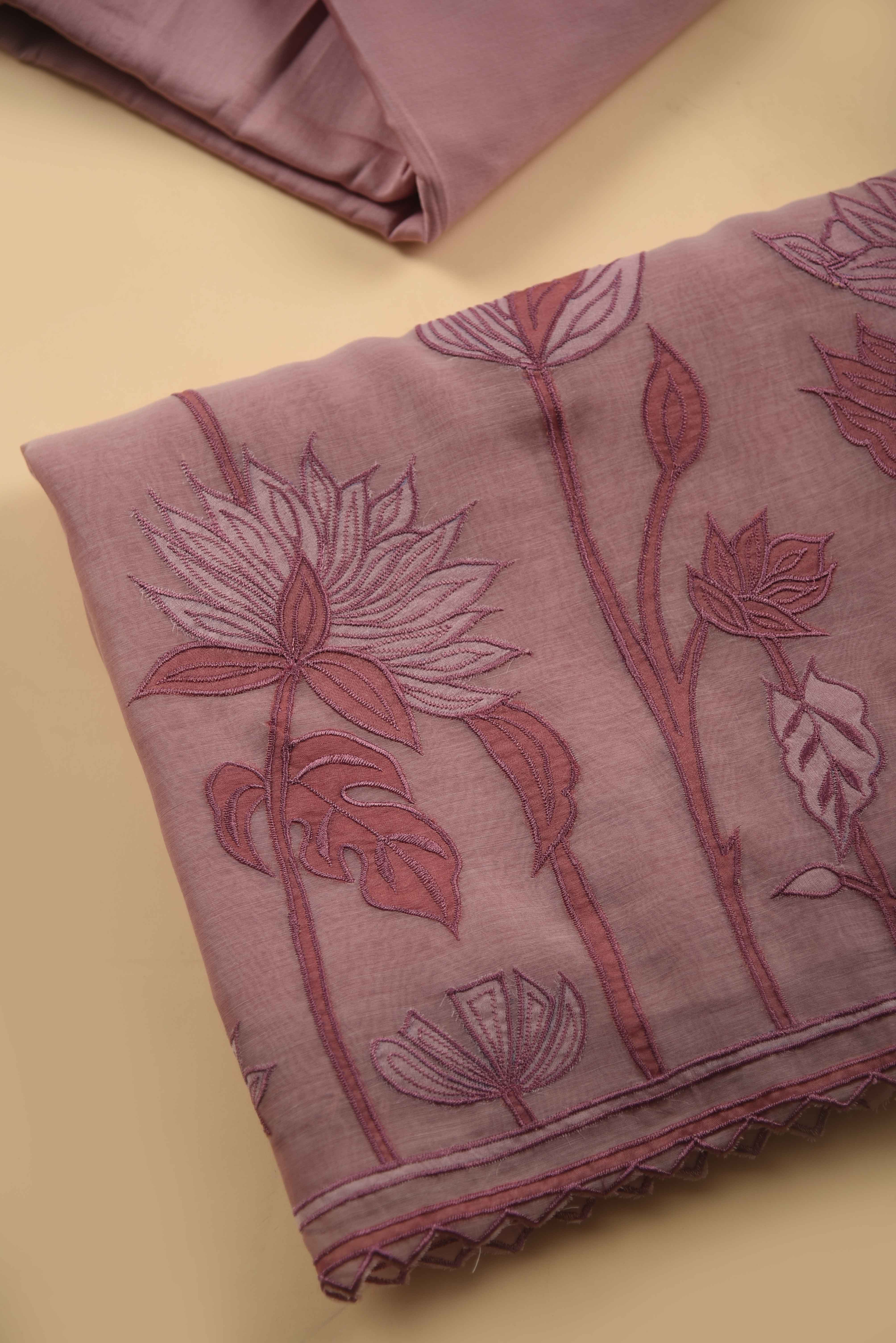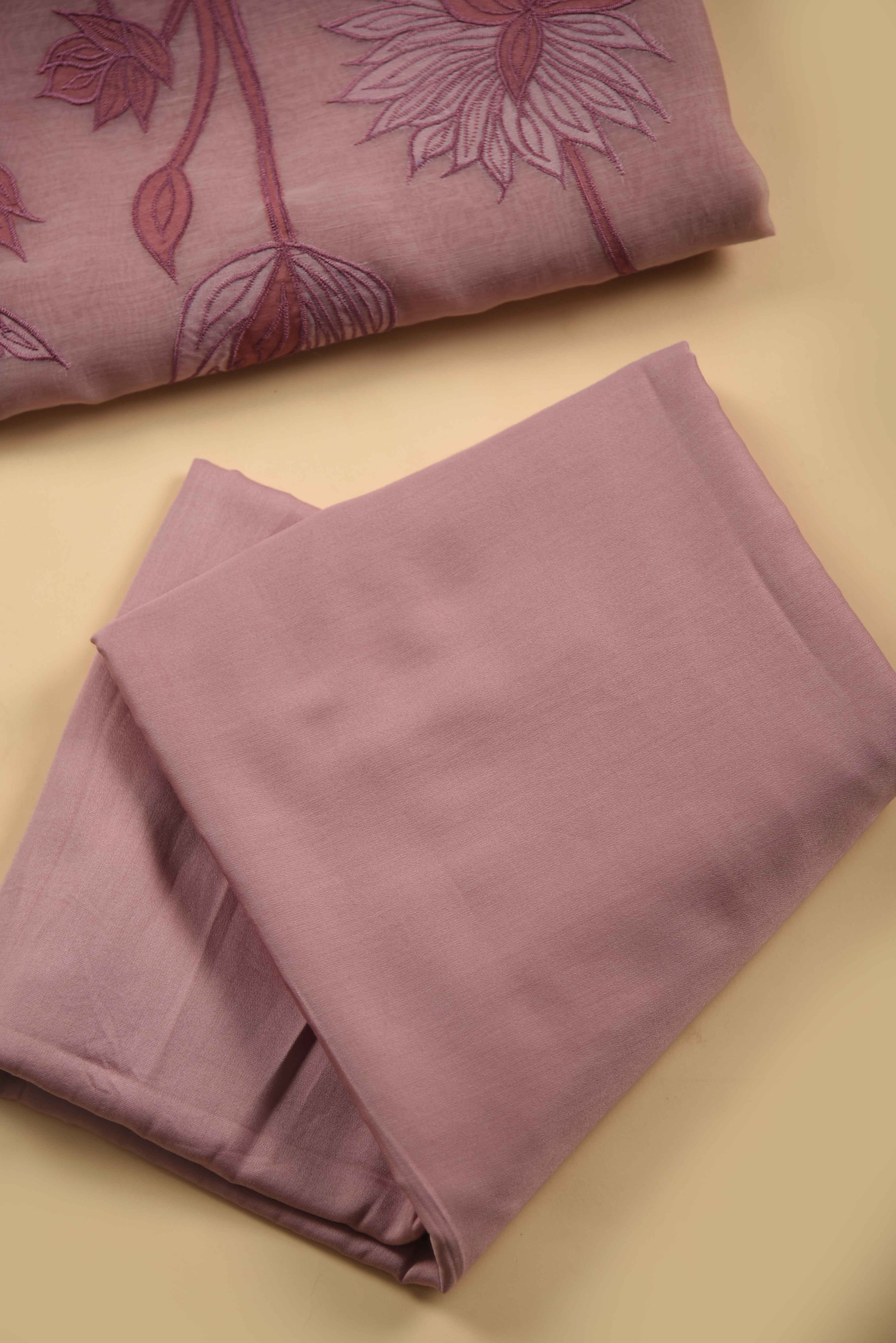 - Experience effortless elegance with this Light Mauve Mul Chanderi Embroidered Unstitched Suit Fabric Set, thoughtfully designed for a graceful and refined look.