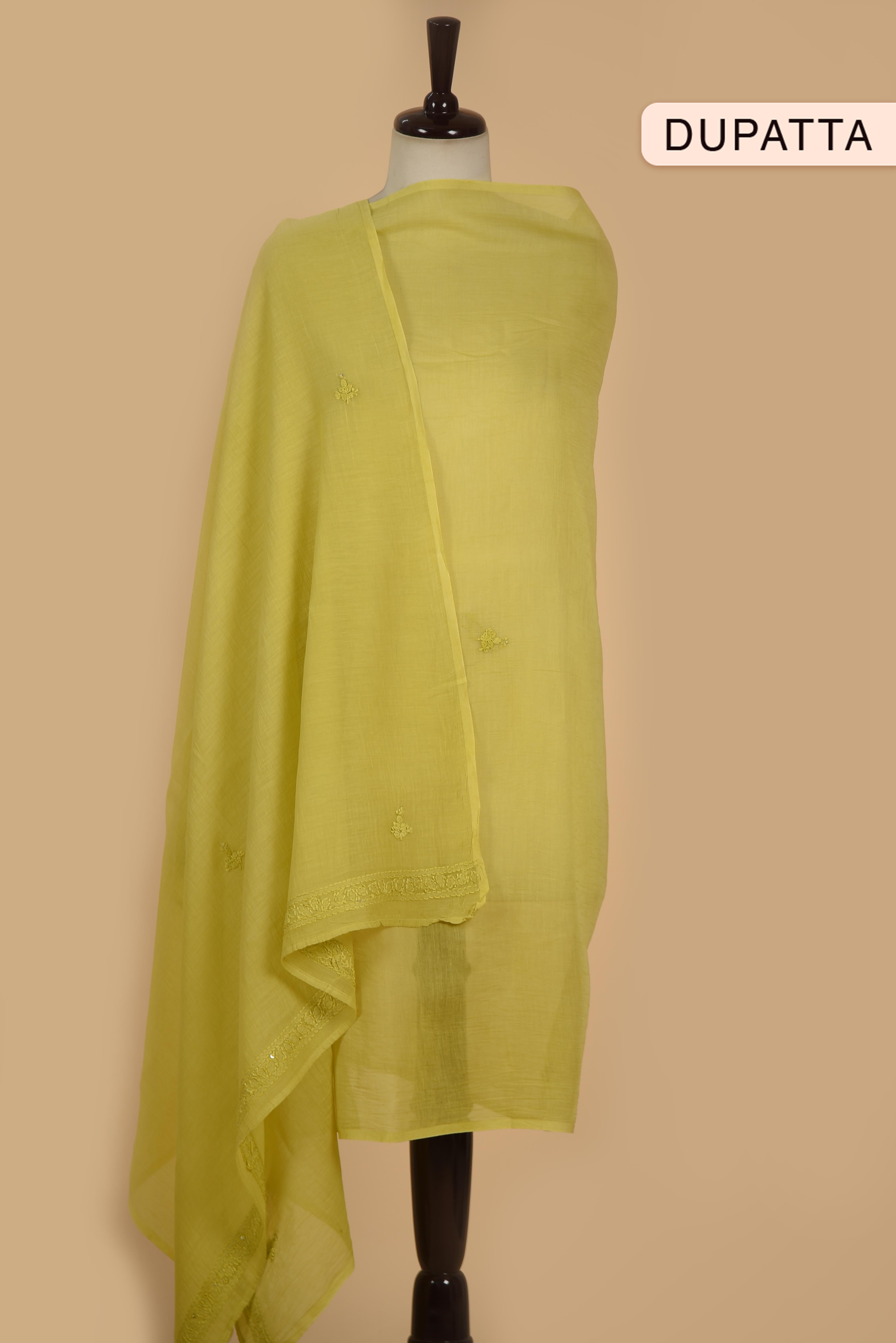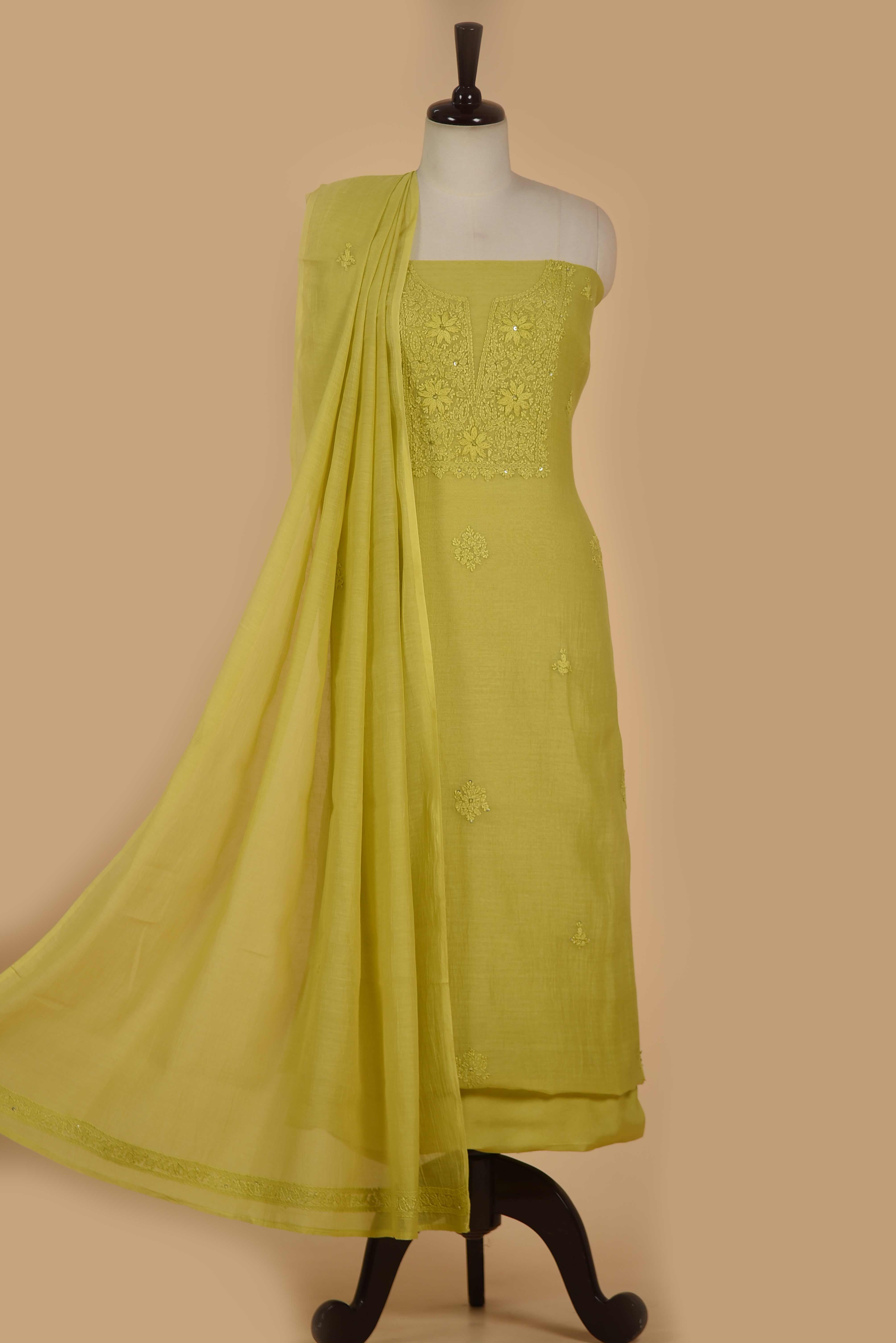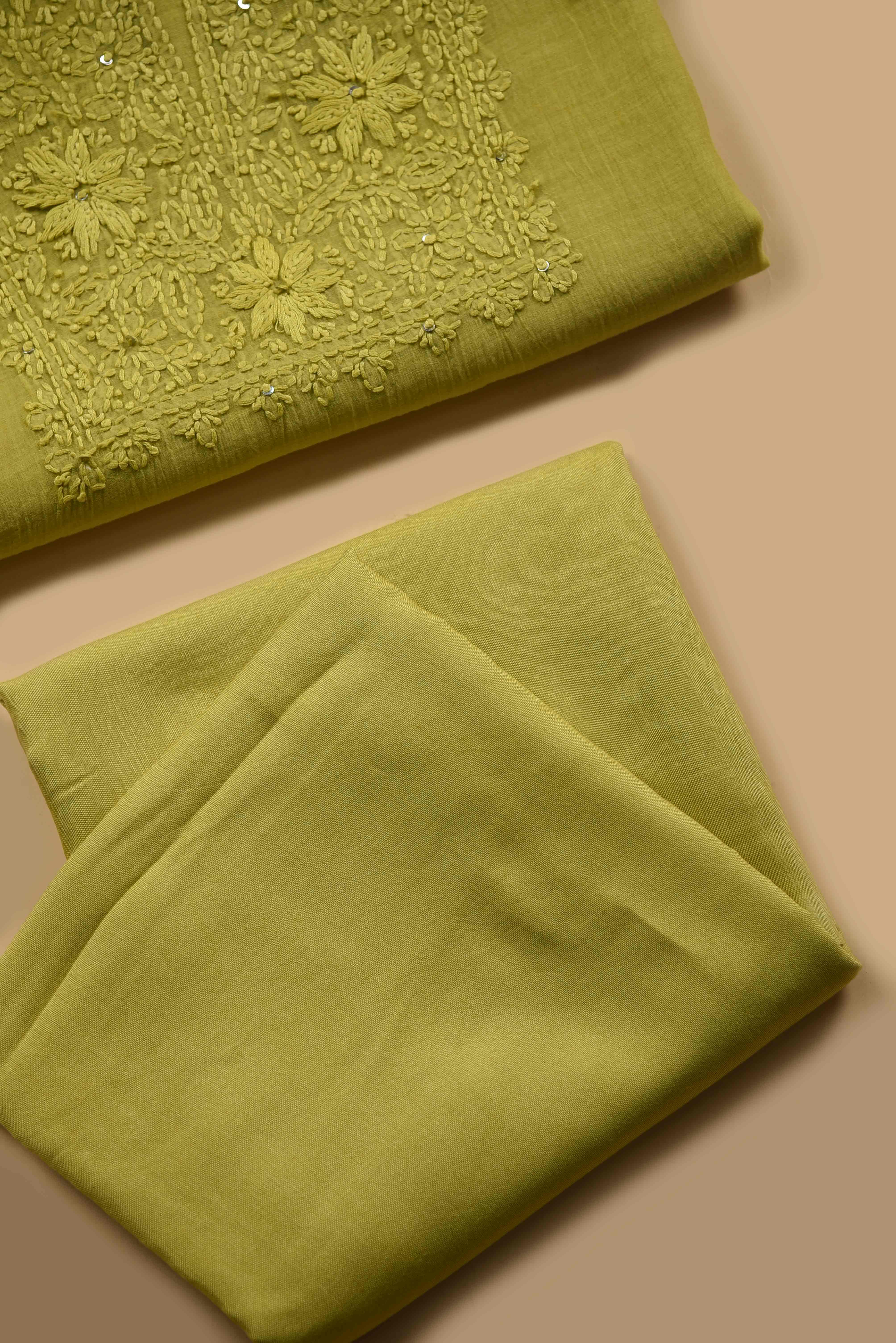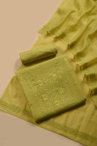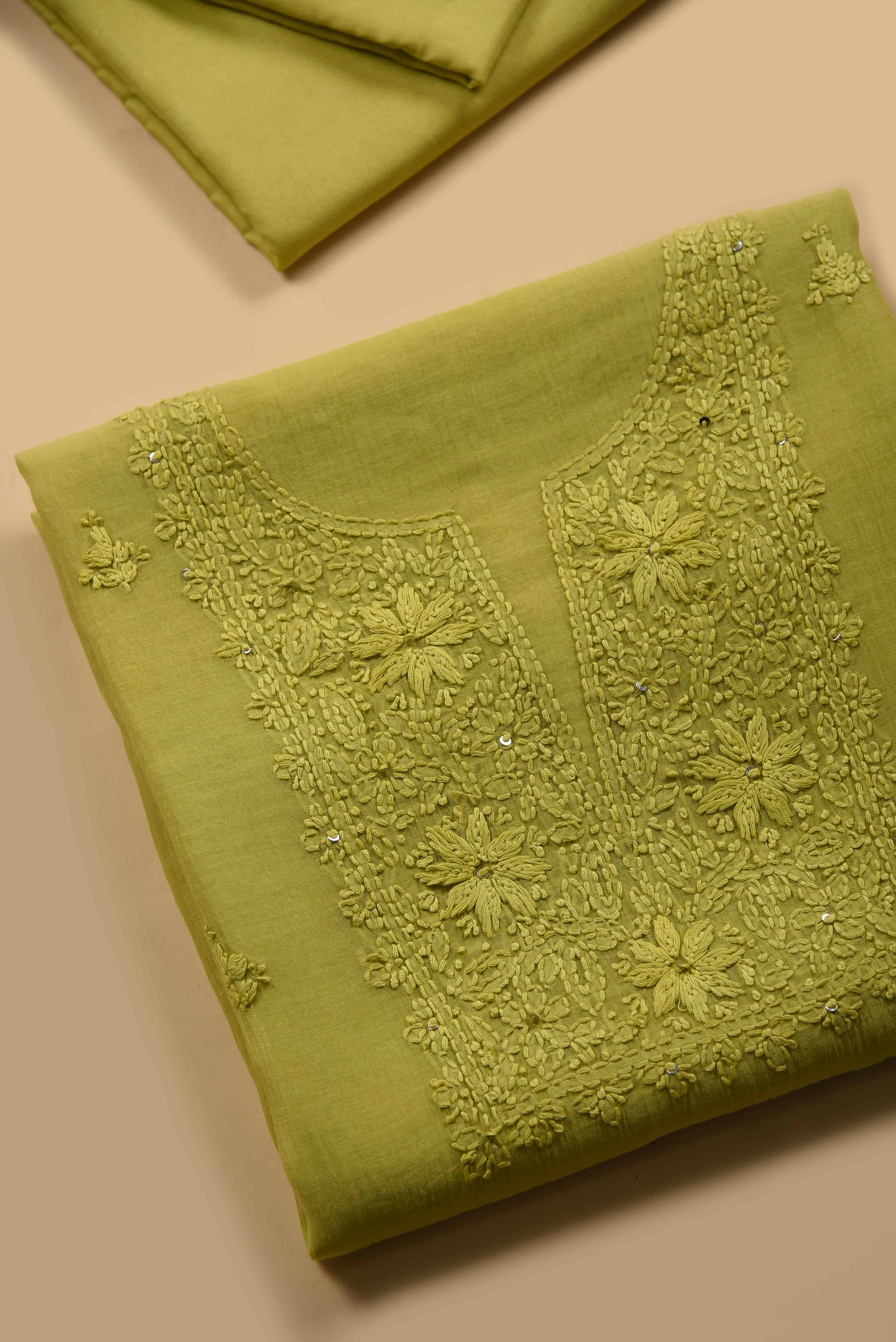 Lime Green Mul Chanderi Embroidered Unstitched Suit Fabric Set With Mul Chanderi Dupatta