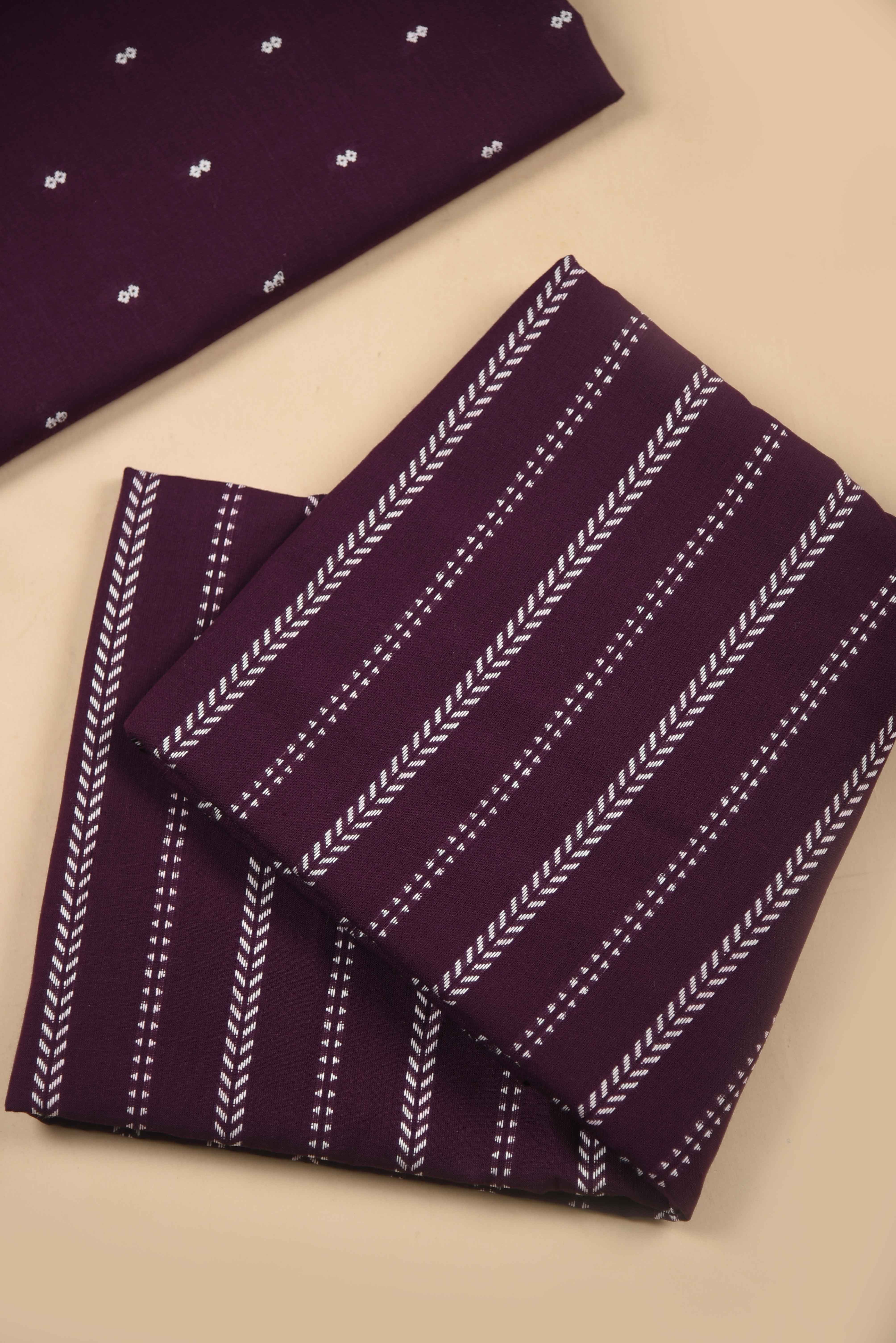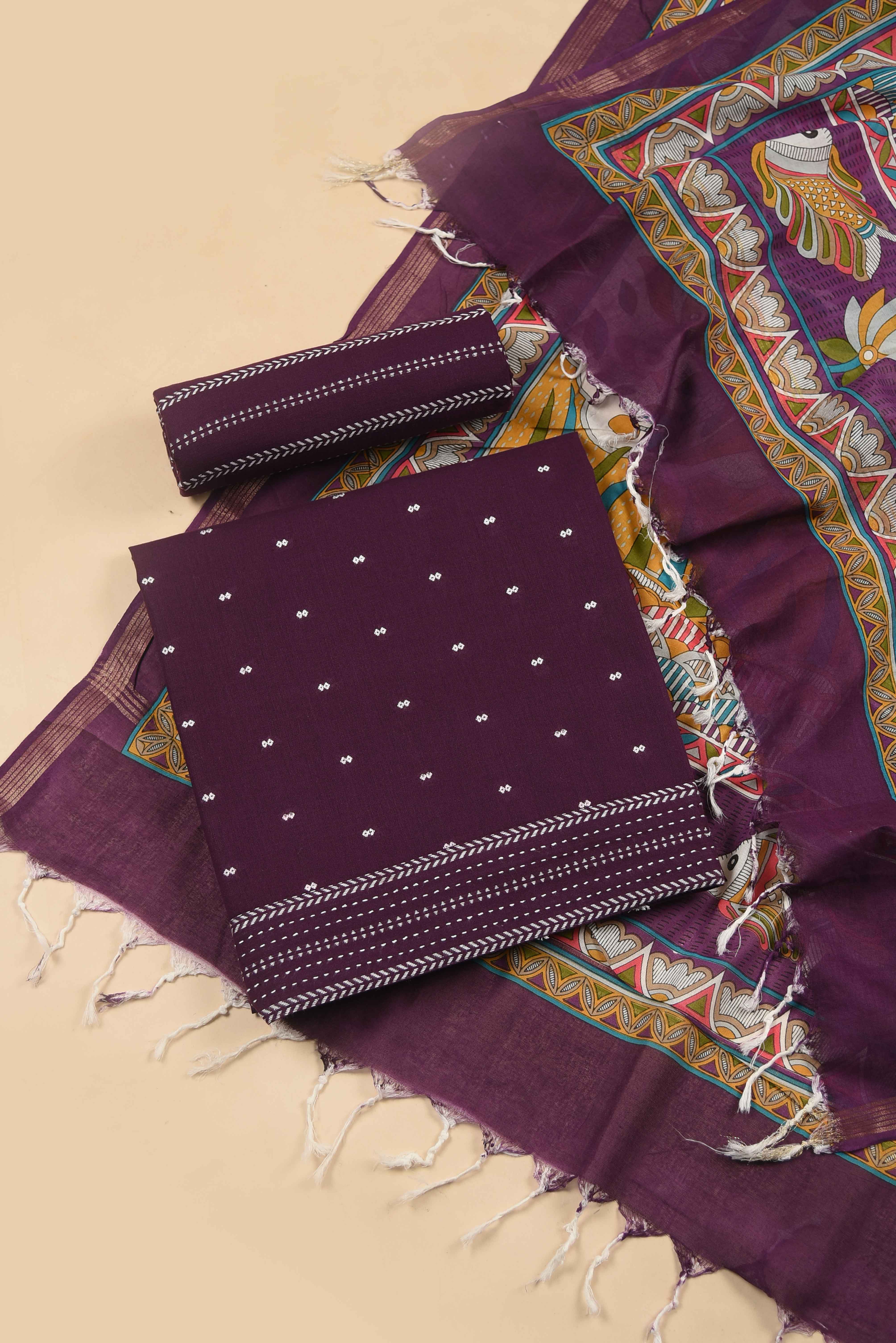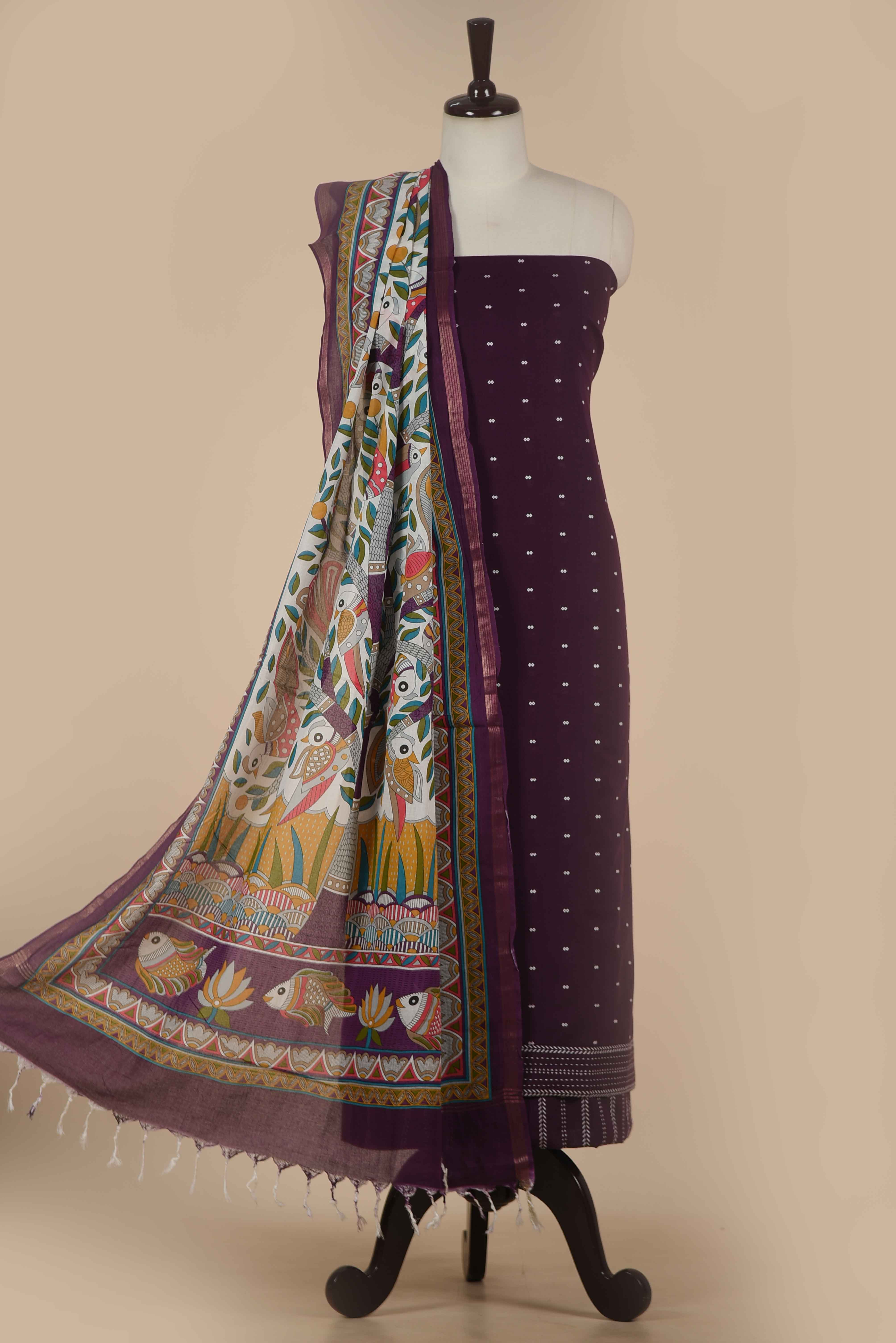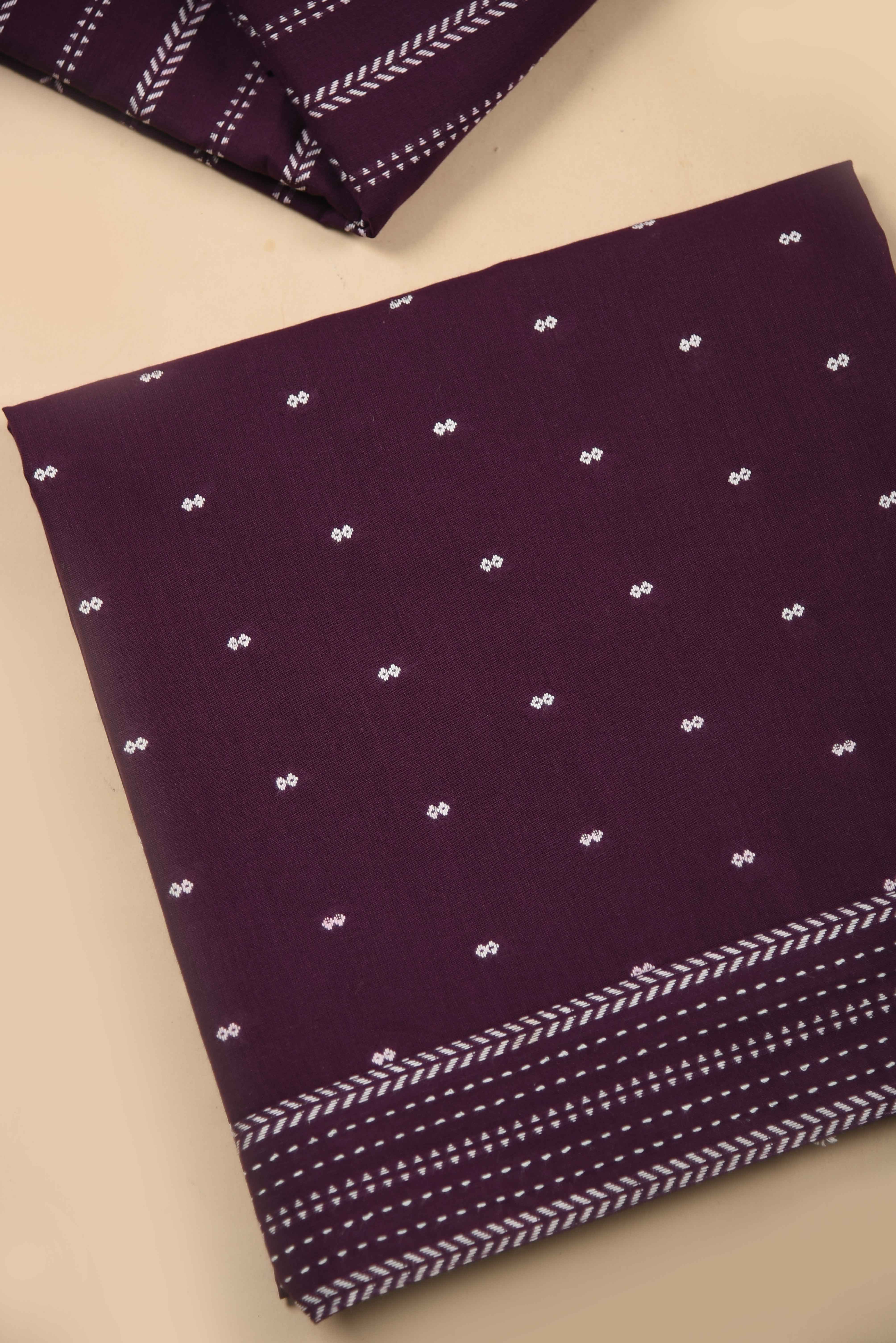 - Transform your fabric collection with this sophisticated Purple pure cotton suit set, featuring hand-woven construction enhanced by delicate embroidery work.
