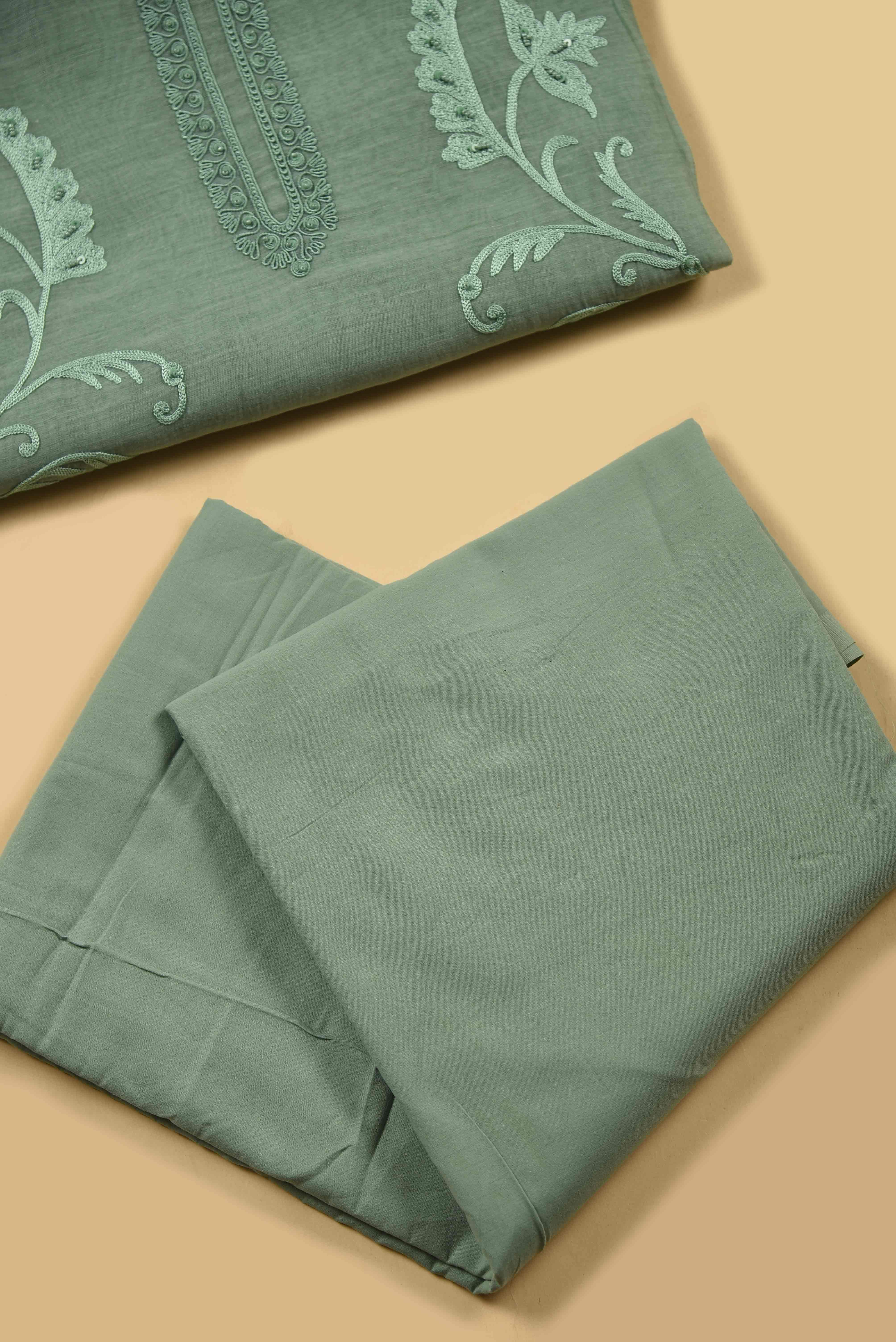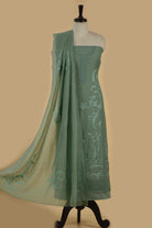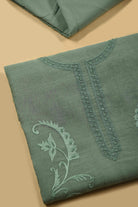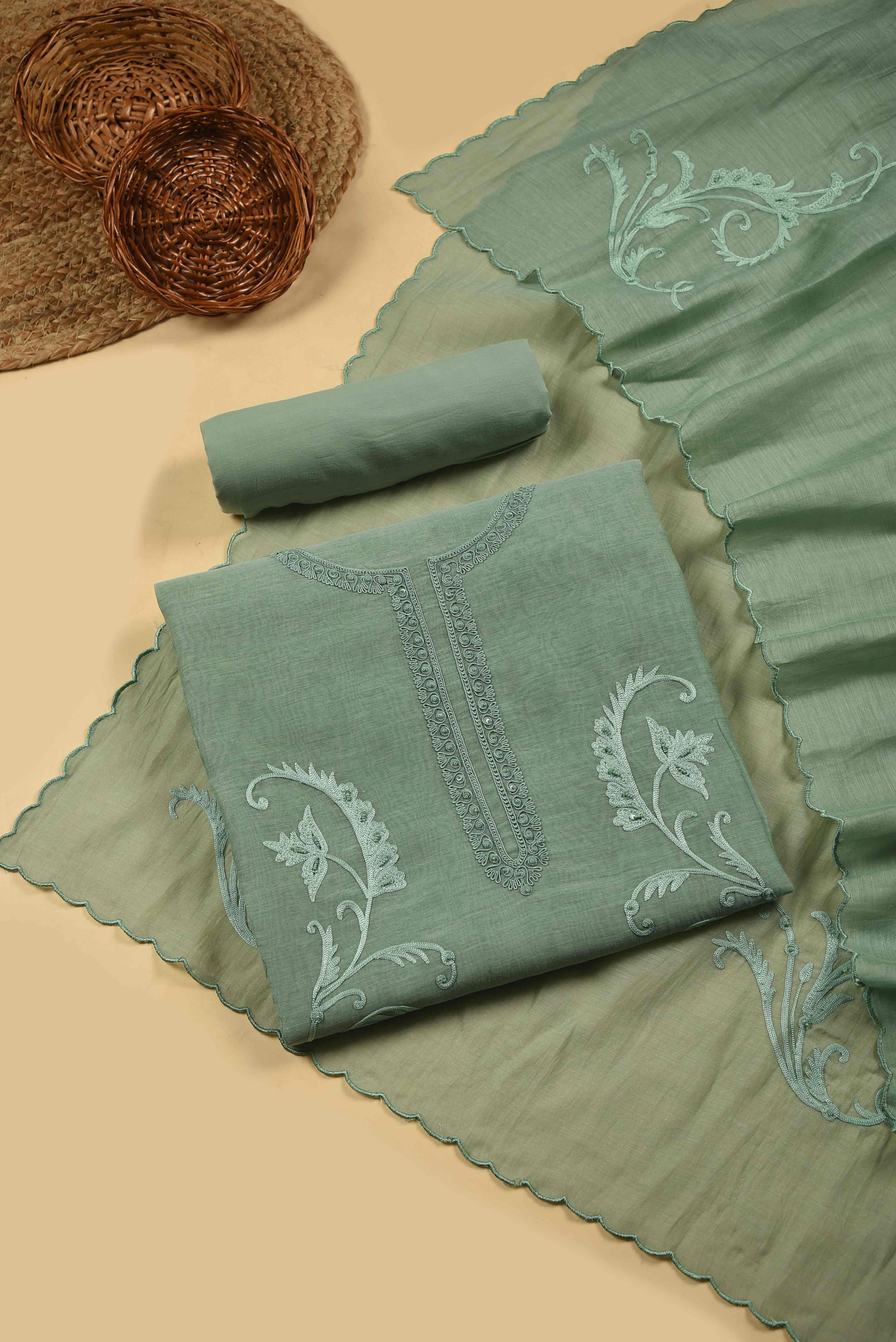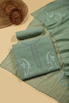 Sea Green Mul Chanderi Embroidered Unstitched Suit Fabric Set With Mul Chanderi Dupatta