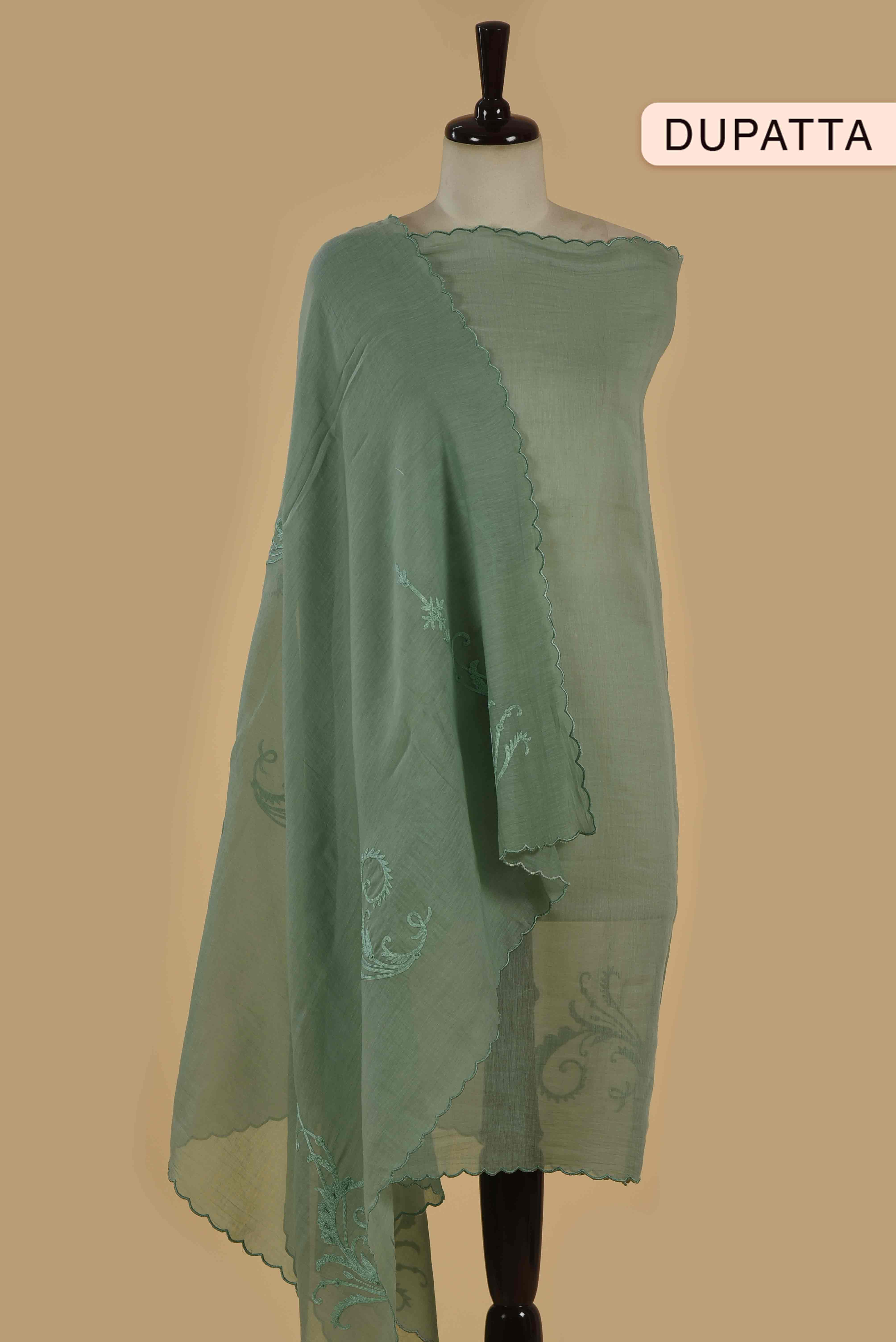 - Paired with a matching Mul Chanderi dupatta, adorned with coordinated embroidery and a finely scalloped border, the ensemble exudes charm and fluidity.