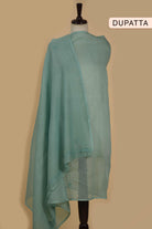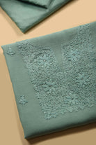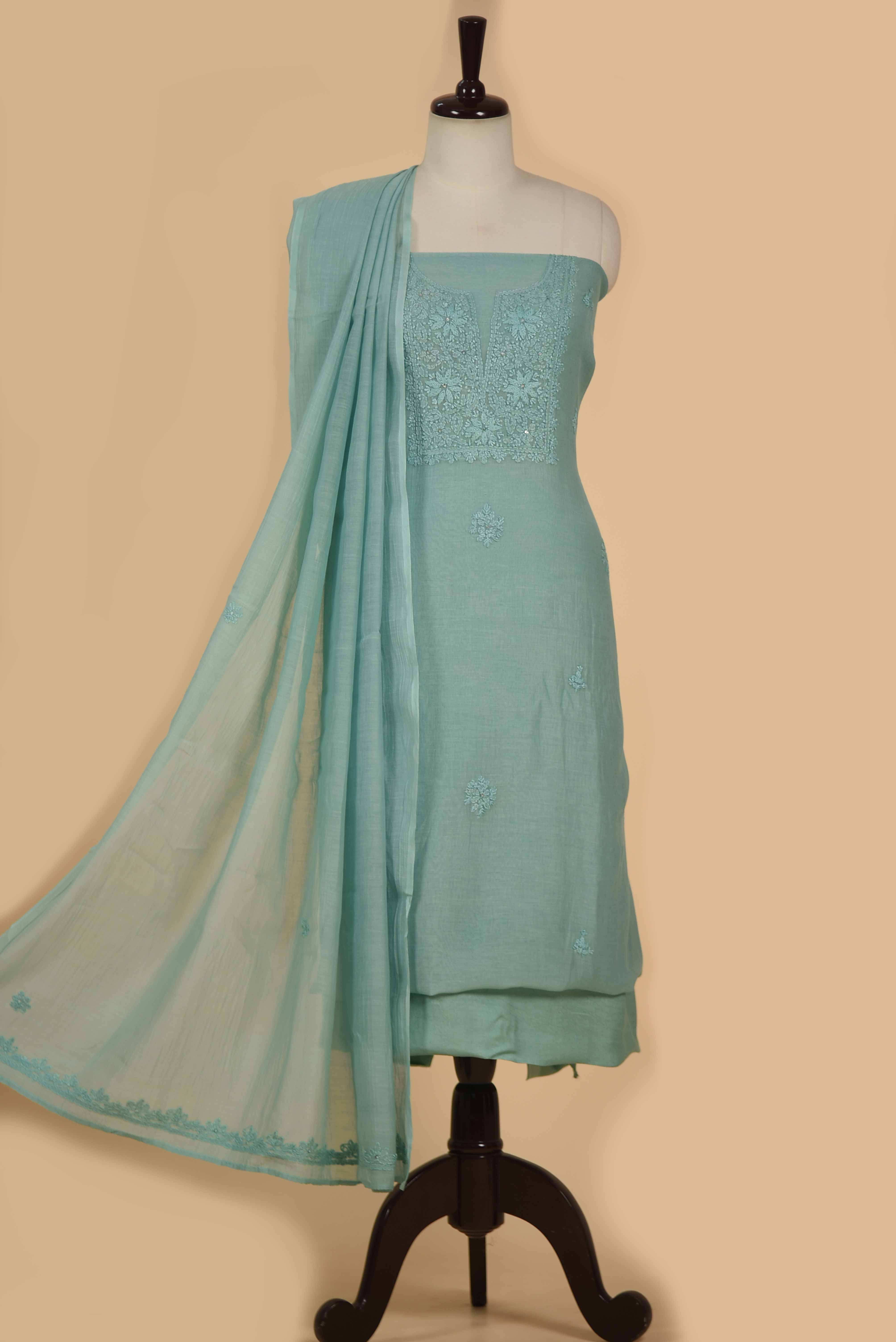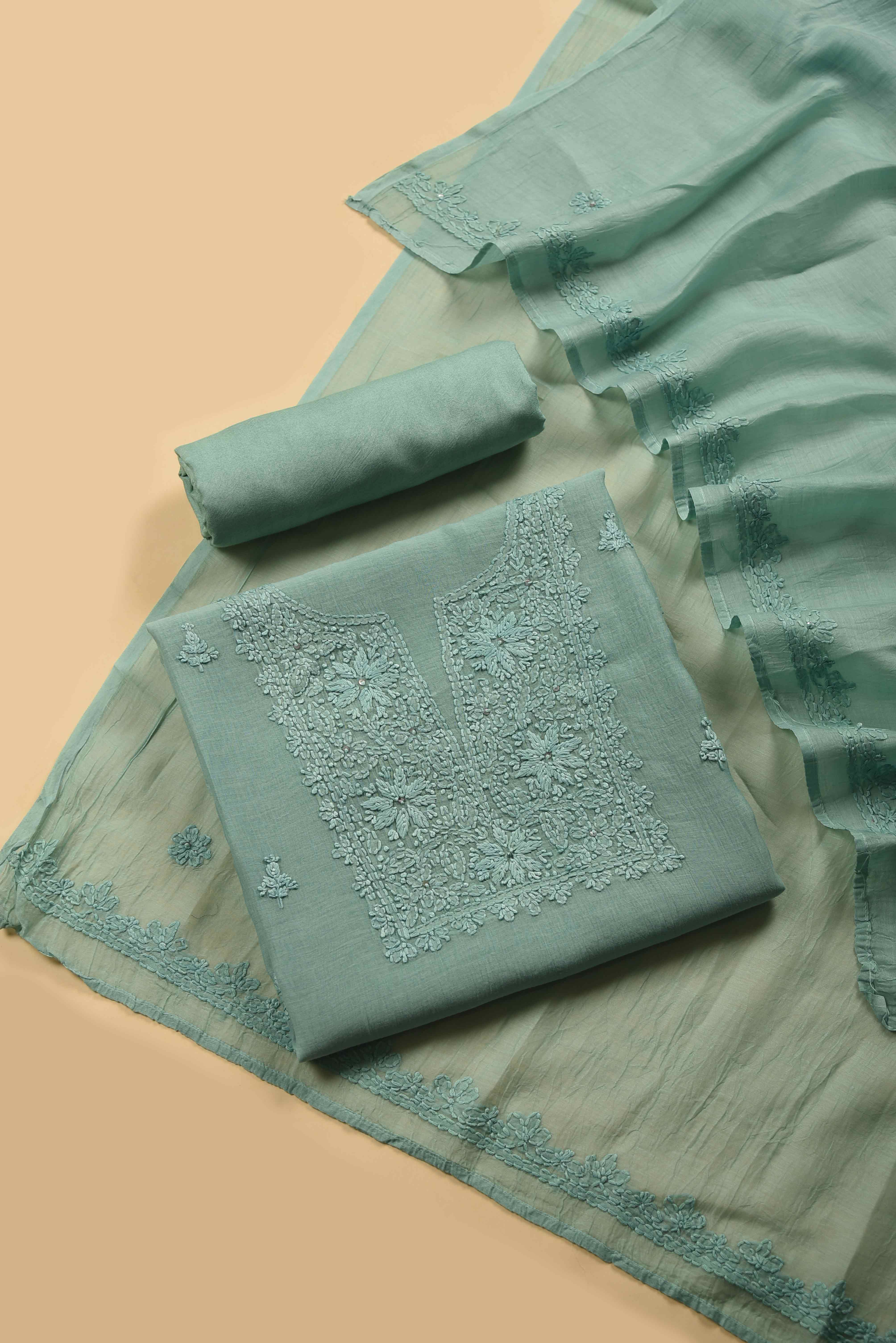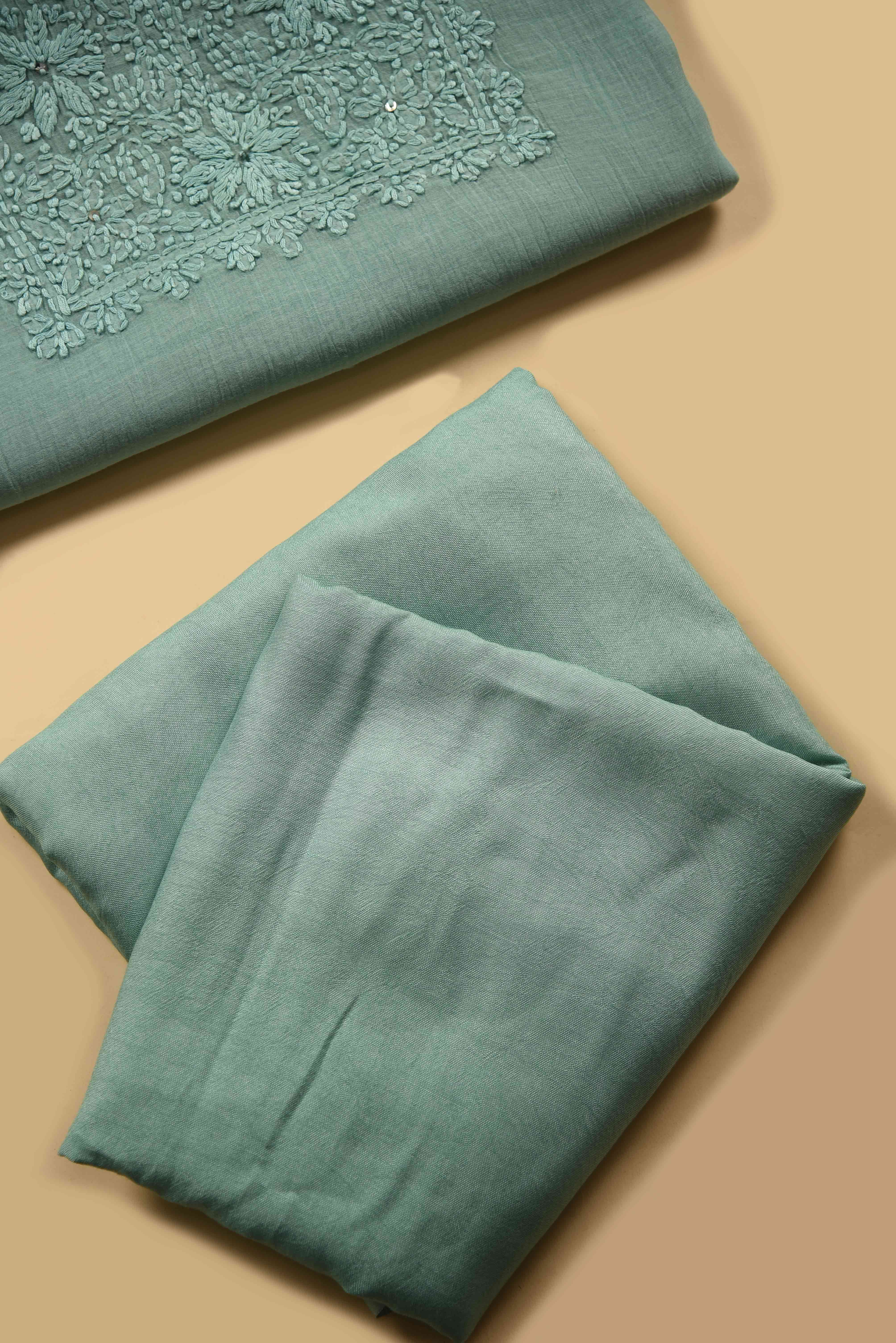Turquoise Mul Chanderi Embroidered Unstitched Suit Fabric Set With Mul Chanderi Dupatta