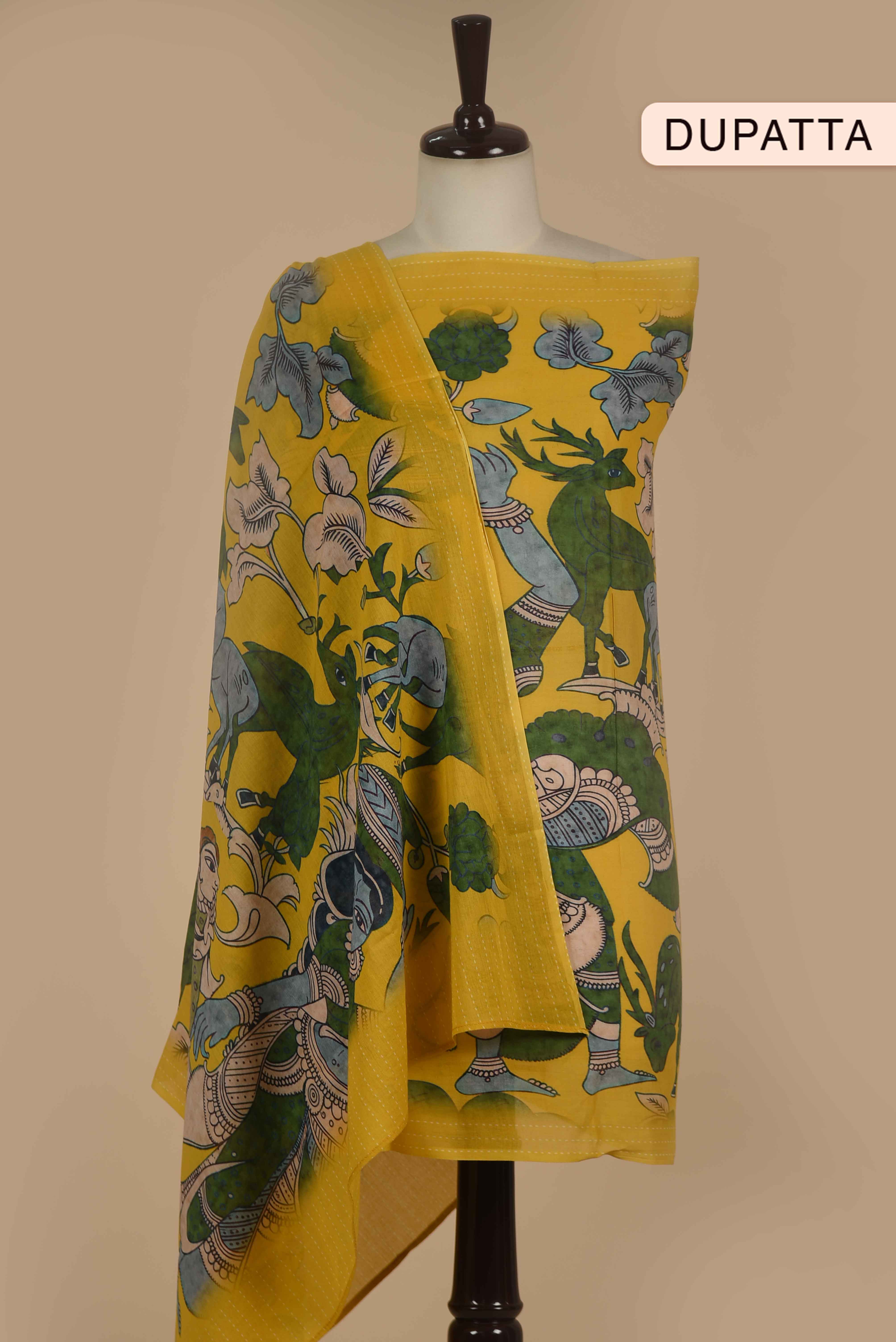 Yellow Cotton Embroidered Unstitched Suit Fabric Set With Cotton Printed Dupatta