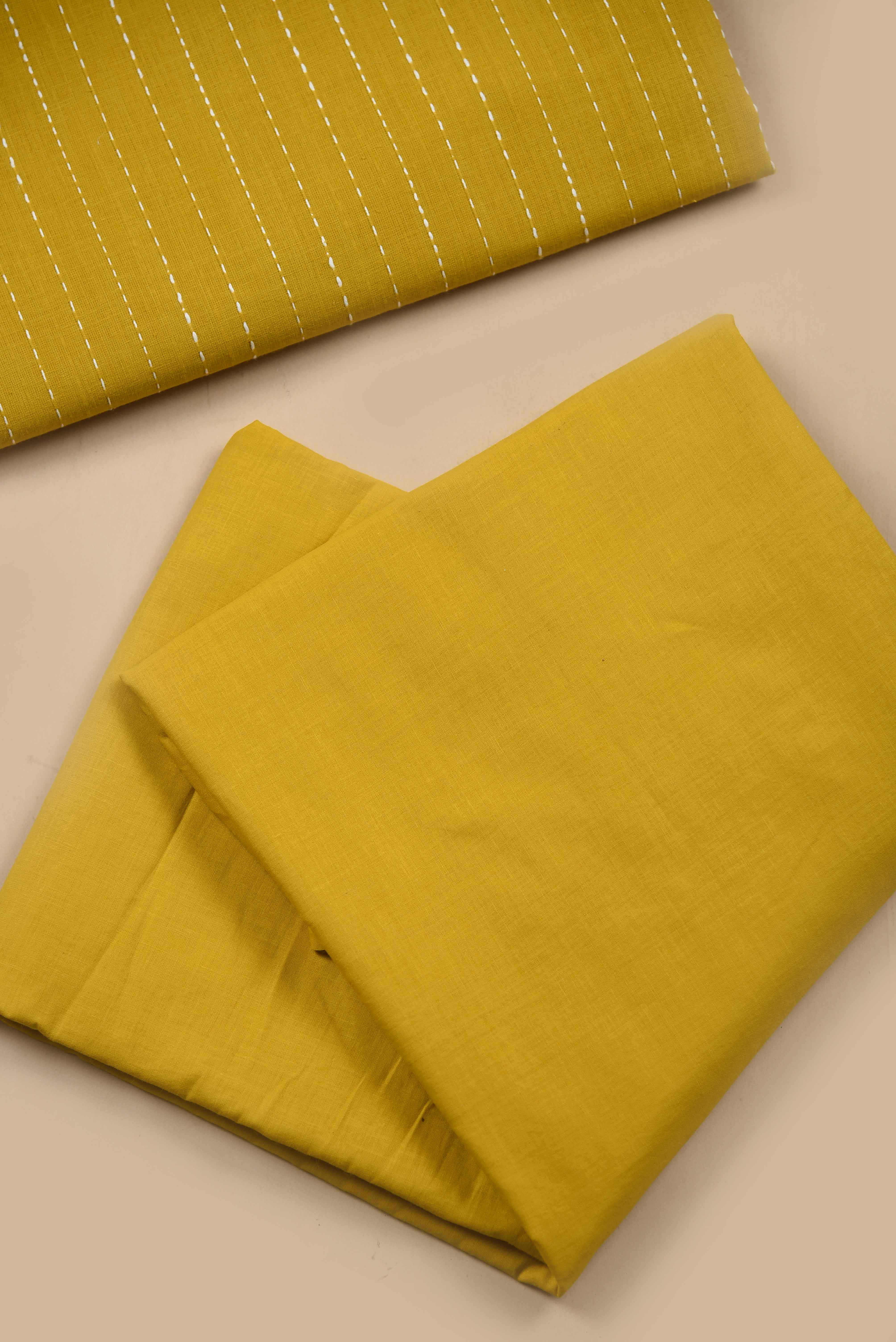 - Discover timeless elegance with this radiant Yellow cotton suit fabric set, expertly crafted with refined embroidery detailing throughout.