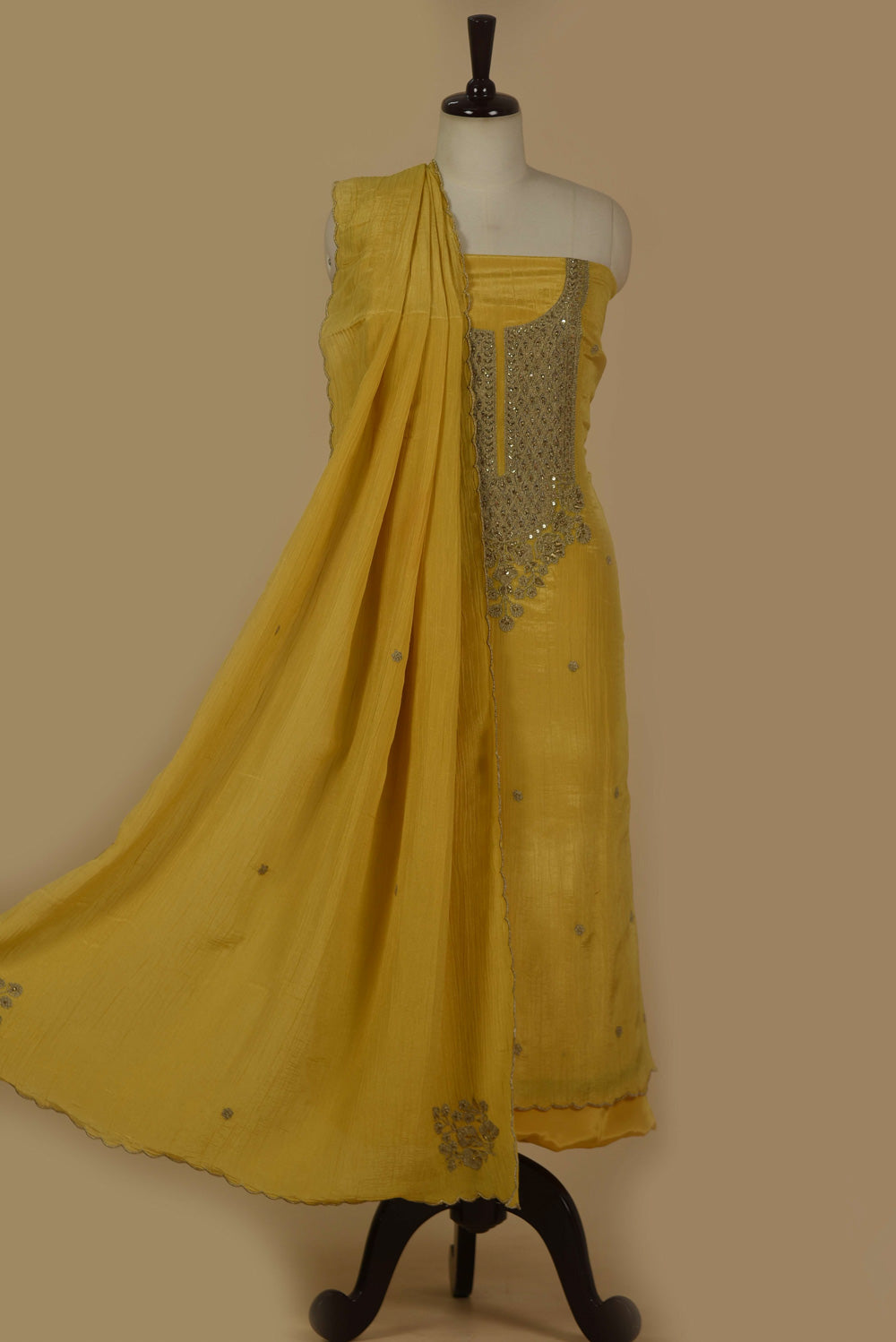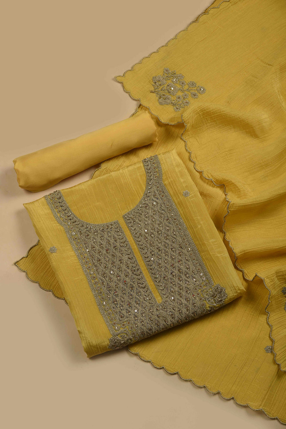- Indulge in understated luxury with this captivating Yellow Crushed Silk suit set, where delicate embroidery elevates every detail.