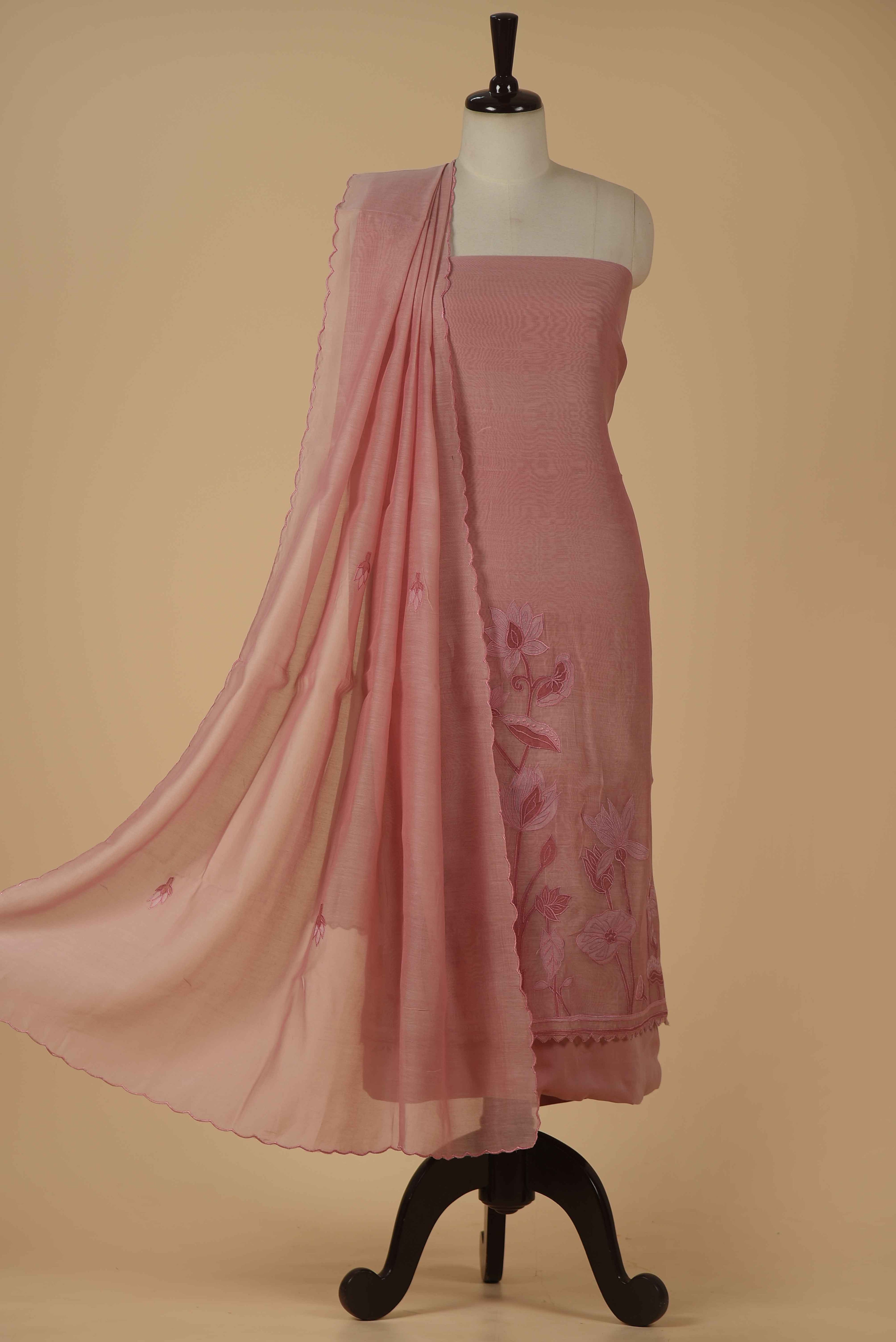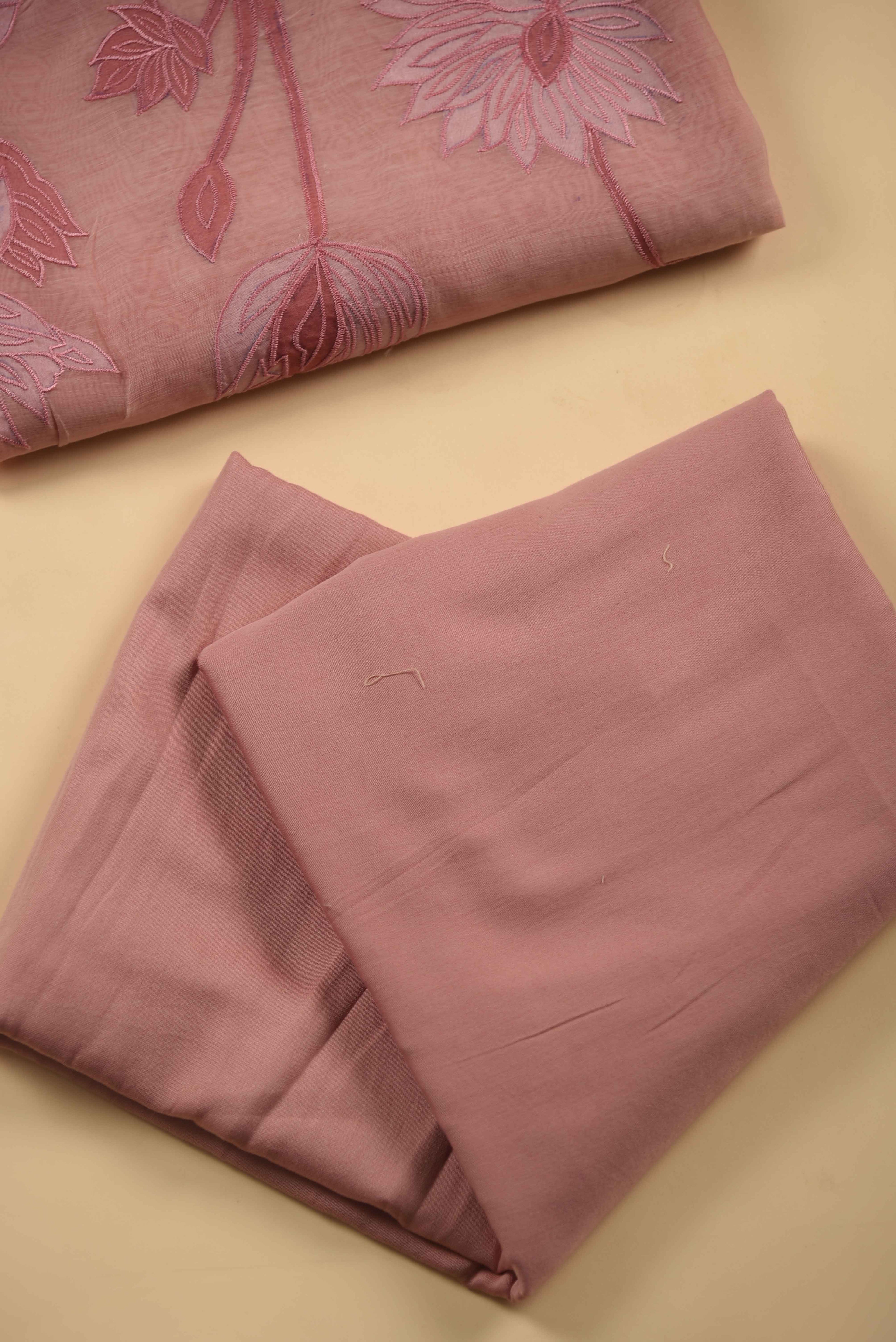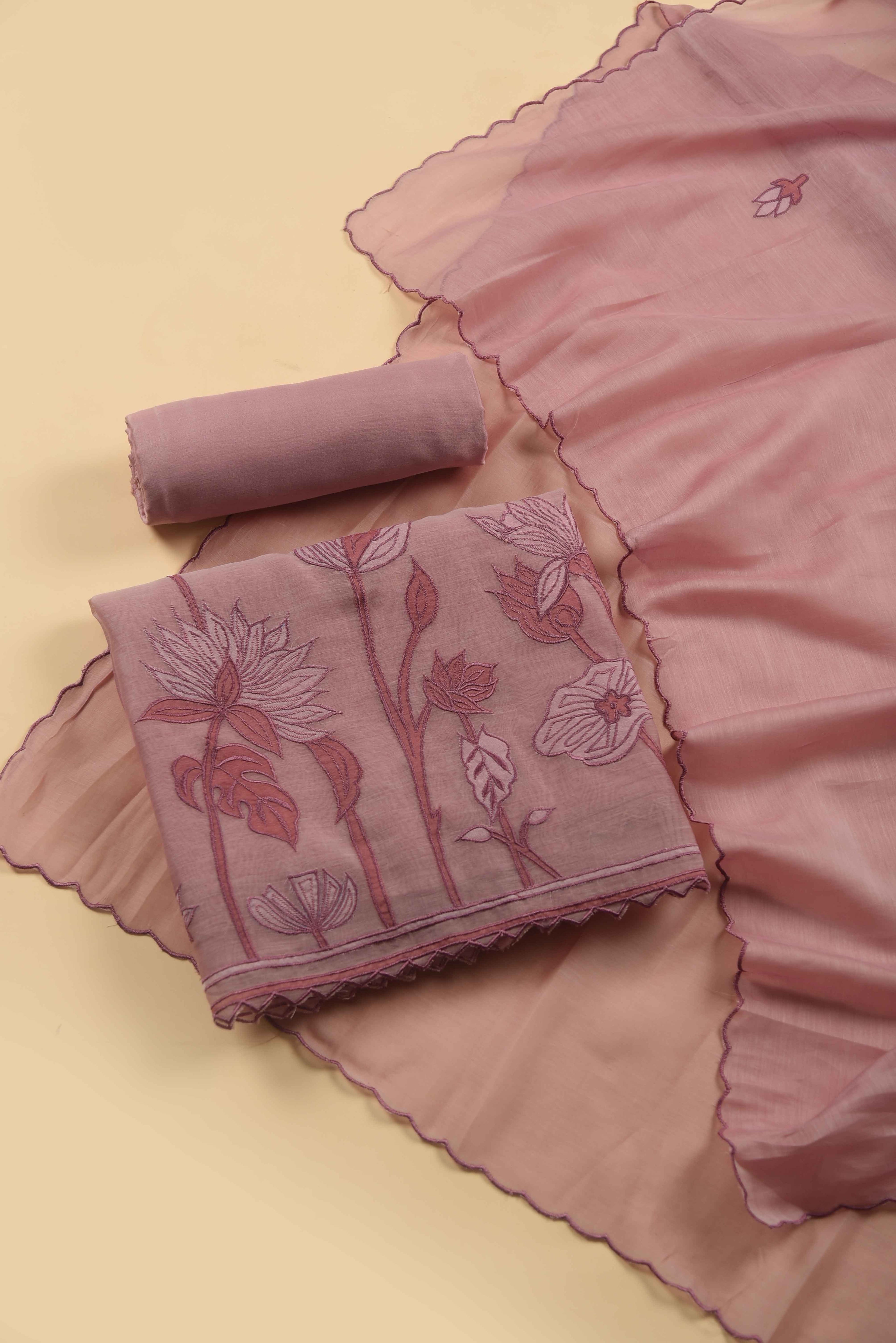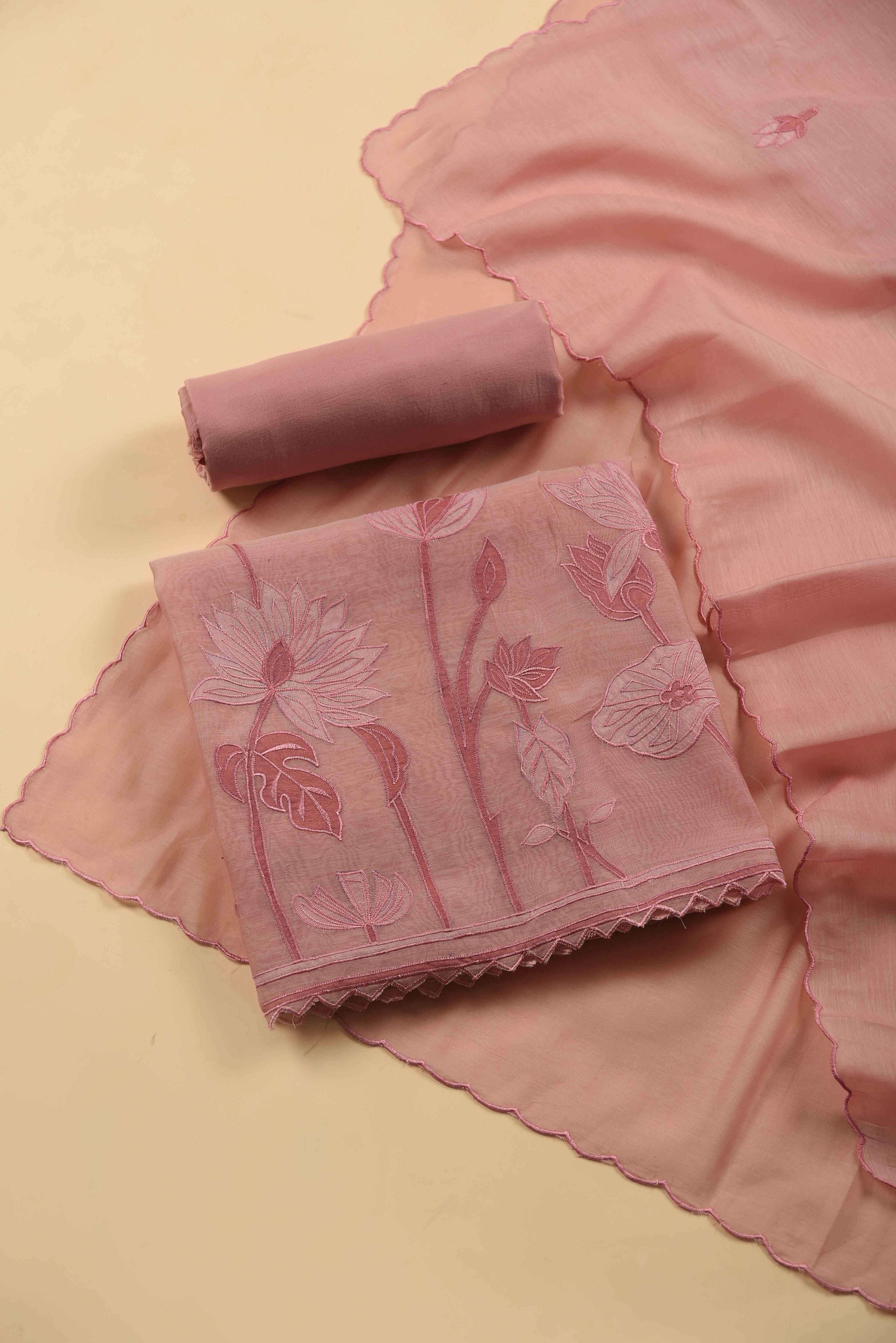 Red Mul chanderi Embroidered Unstitched Suit Fabric Set With Mul Chanderi Embroidered Dupatta