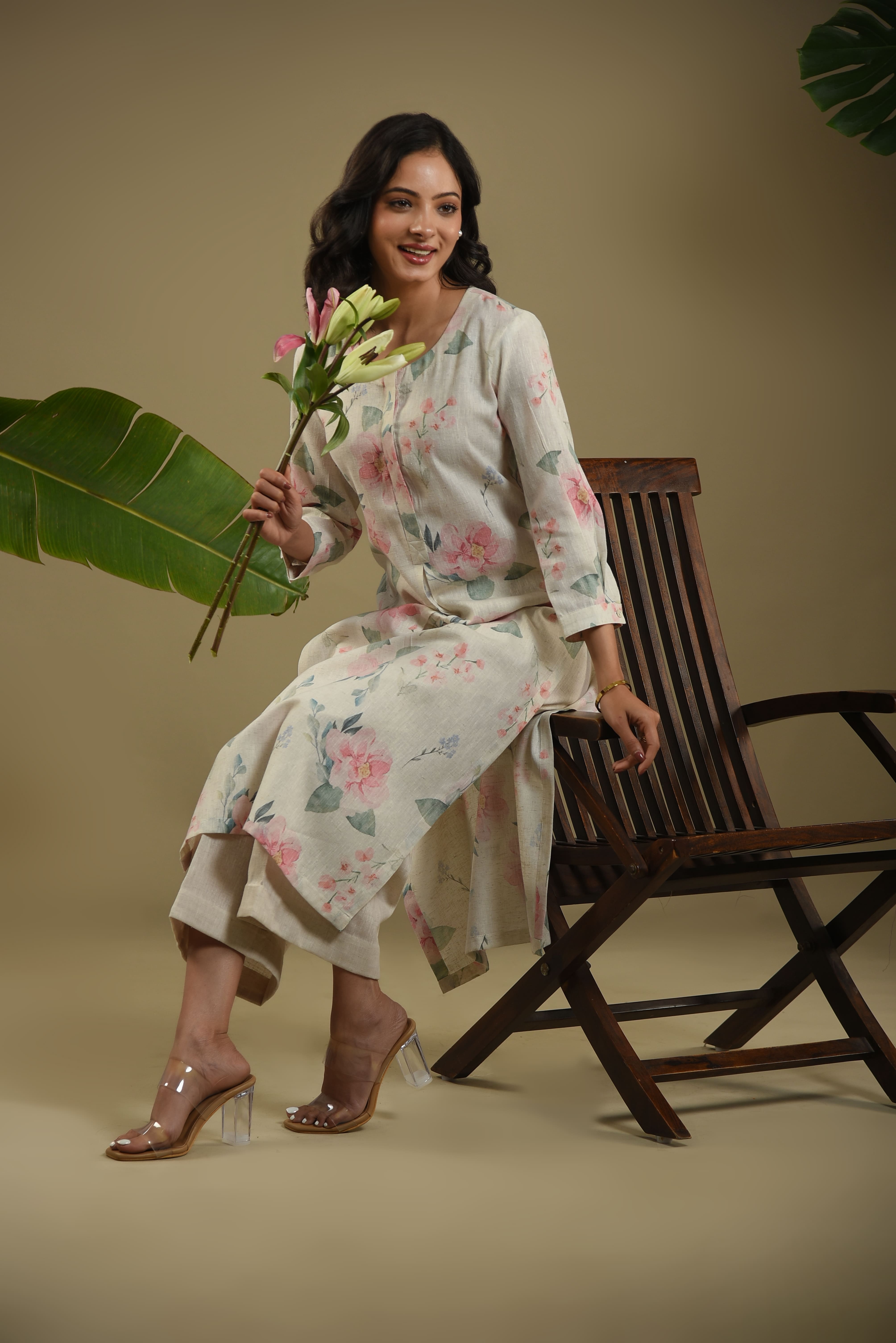 Cream & Pink Floral Linen Blend Straight Kurta Set With Culotte Pants - Regular Fit