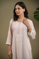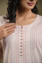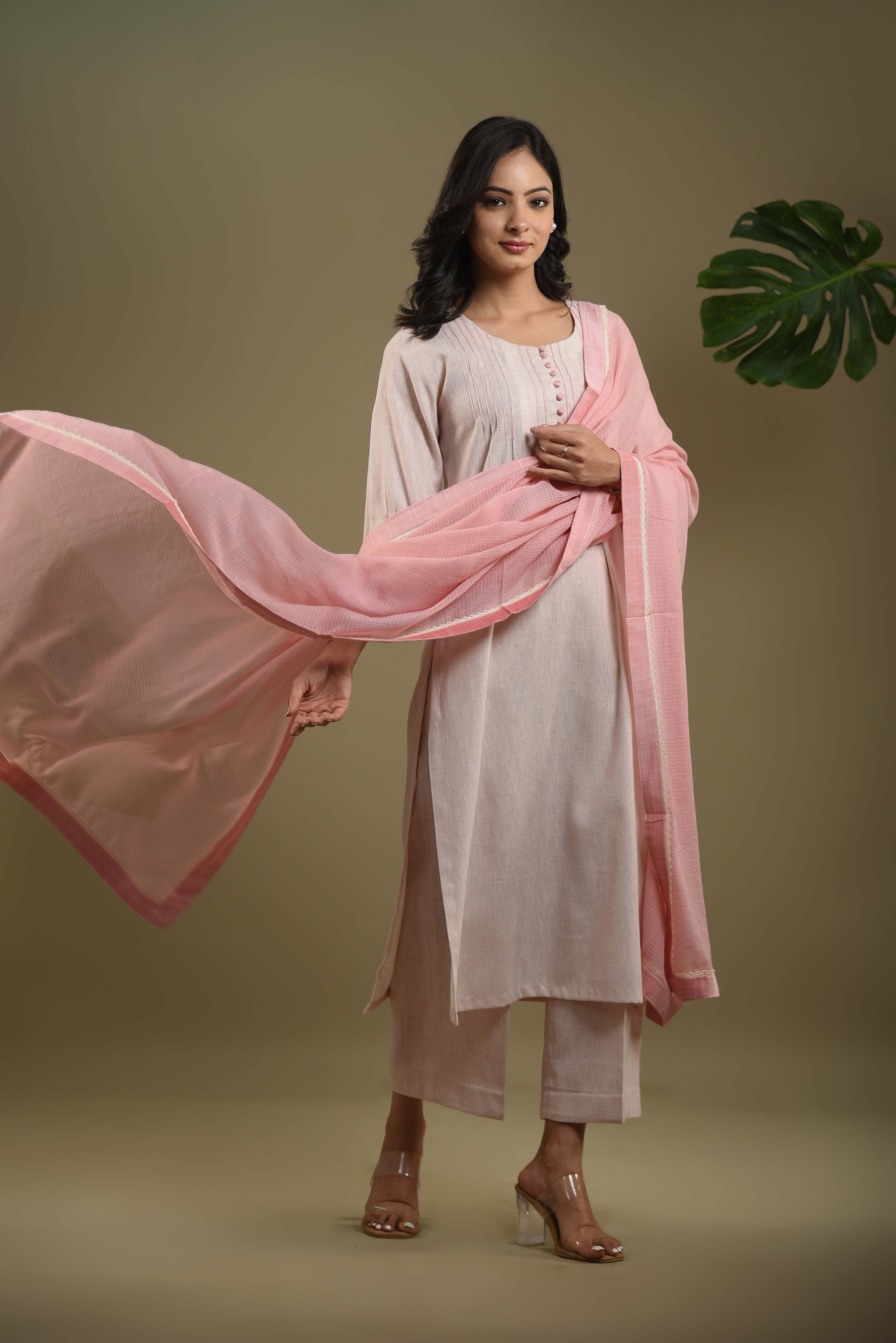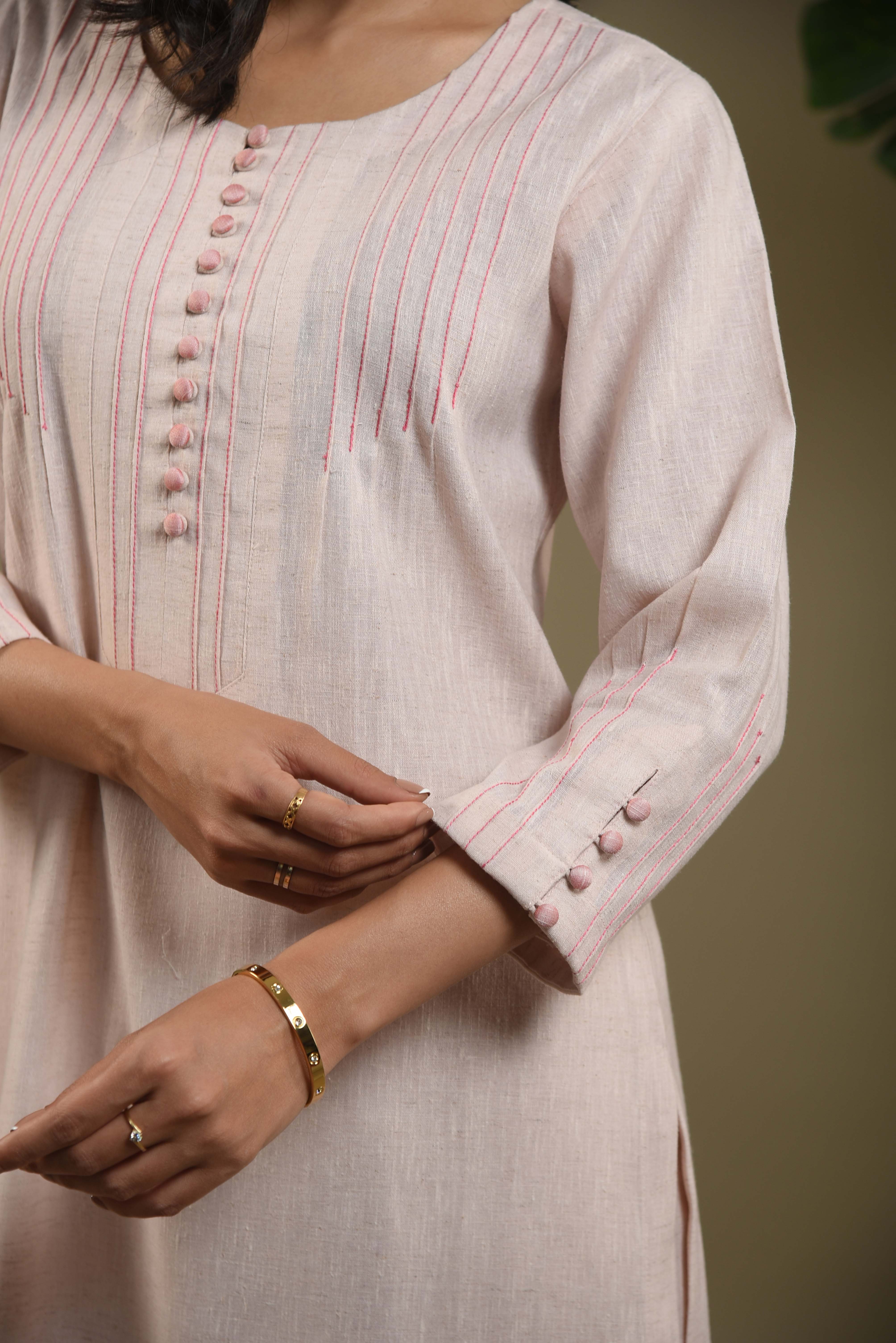 Elegant blush pink kurta set in fine cotton linen Blend fabric designed with fine pintuck detailing and fabric buttons on the front yoke for a graceful touch.