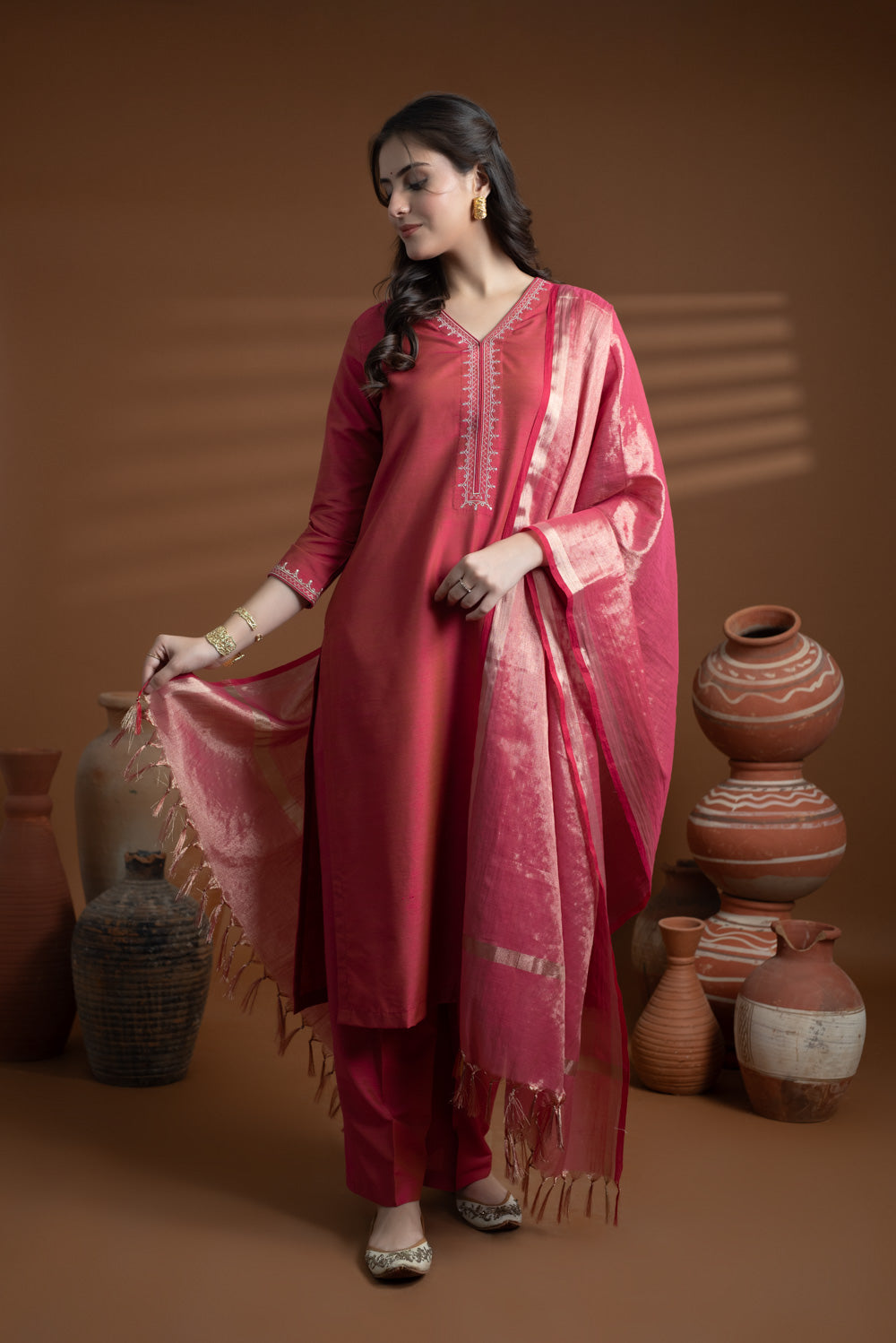 Add a touch of timeless charm to your ethnic look with this Rose Pink Tissue Dupatta.