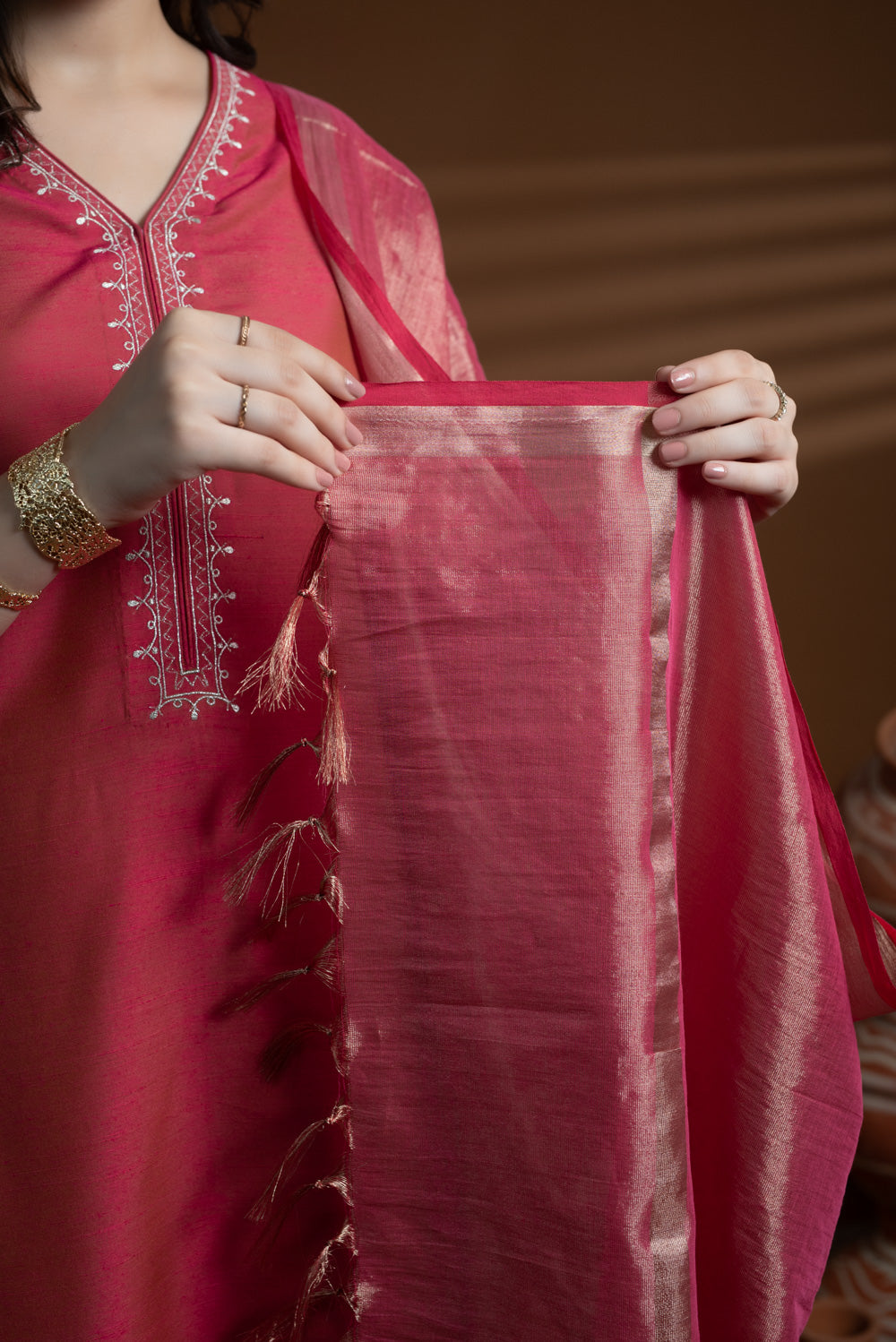 Featuring fine zari weaving, it offers a subtle shimmer and delicate tassels at the ends, enhancing its elegant appeal. Soft, lightweight, and gracefully flowing, this dupatta complements festive and party wear ensembles beautifully.